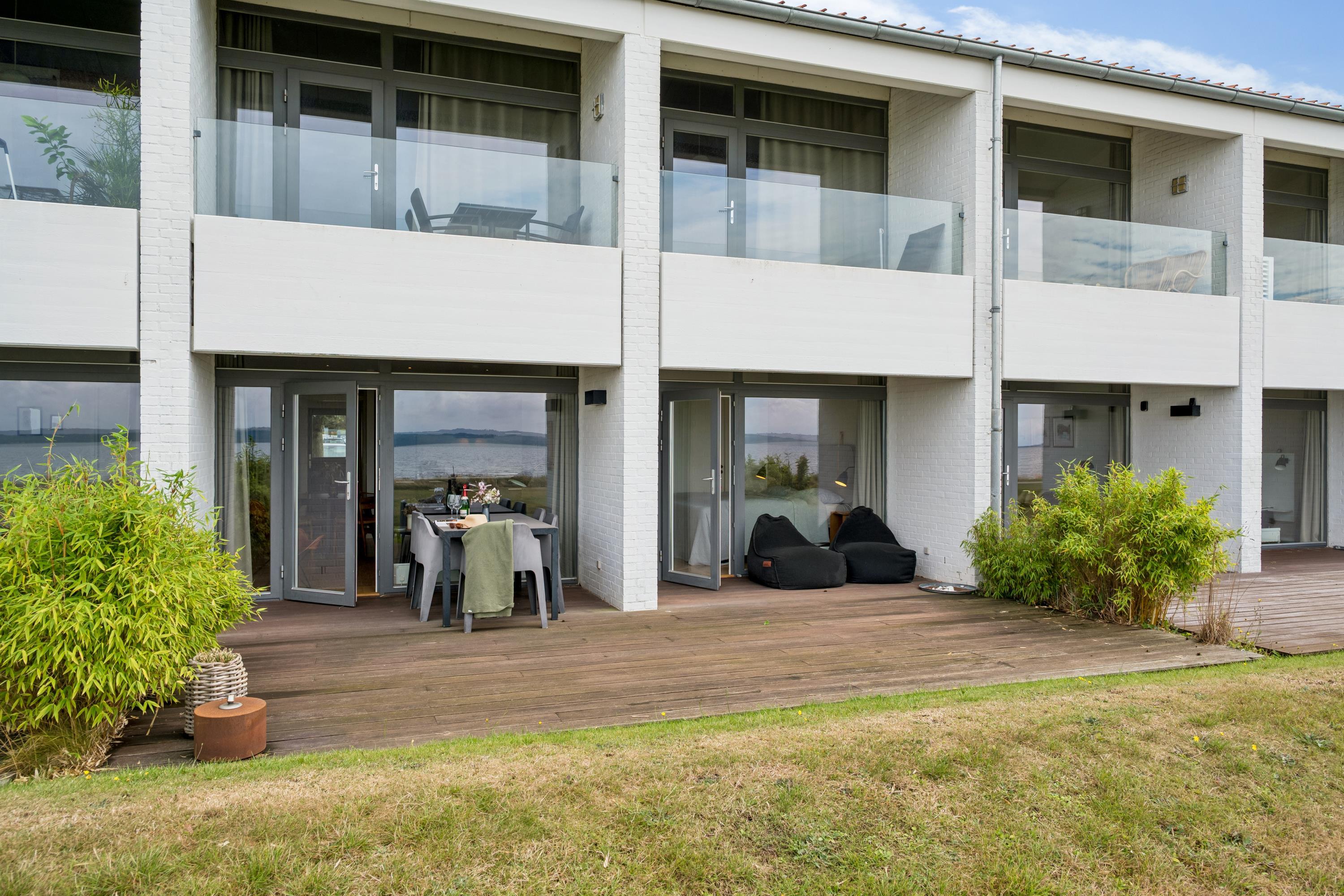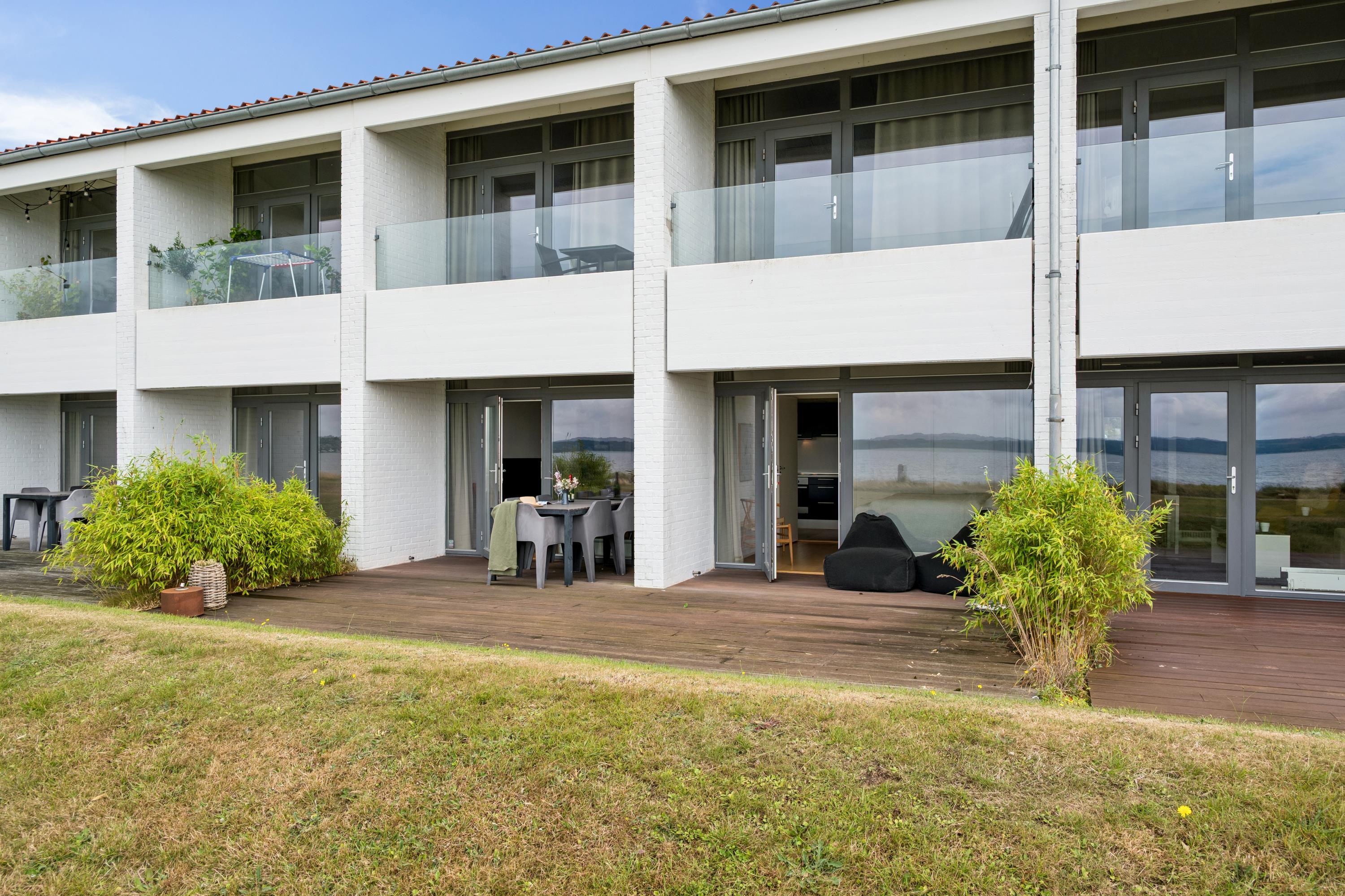 Lys ferielejlighed beliggende i 1 række med fuld udsigt over Ebeltoft Vig. Fra entréen kommer man ind i en lys stue, hvorfra der er udgang til en skøn overdækket terrasse med havemøbler. Herfra kan man virkelig nyde solnedgangen over Ebeltoft Vig og Mols Bjerge. I forbindelse med stuen finder man det velindrettede køkken med b.la. opvaskemaskine. Husets sovepladser finder man i to gode og rummelige soveværelser med dobbeltsenge. Flot badeværelse med bruseniche. En rigtig dejlig lejlighed tæt på strand og badebro og blot 5 min gang fra centrum. Her finder man b.la. Det gamle Rådhus og Maltfabrikken. I byens hyggelige brostensbelagte gader finder man et væld af små hyggelige specialbutikker og cafeer. På havnen finder man Glasmuseet med moderne glaskunst og Fregatten Jylland.