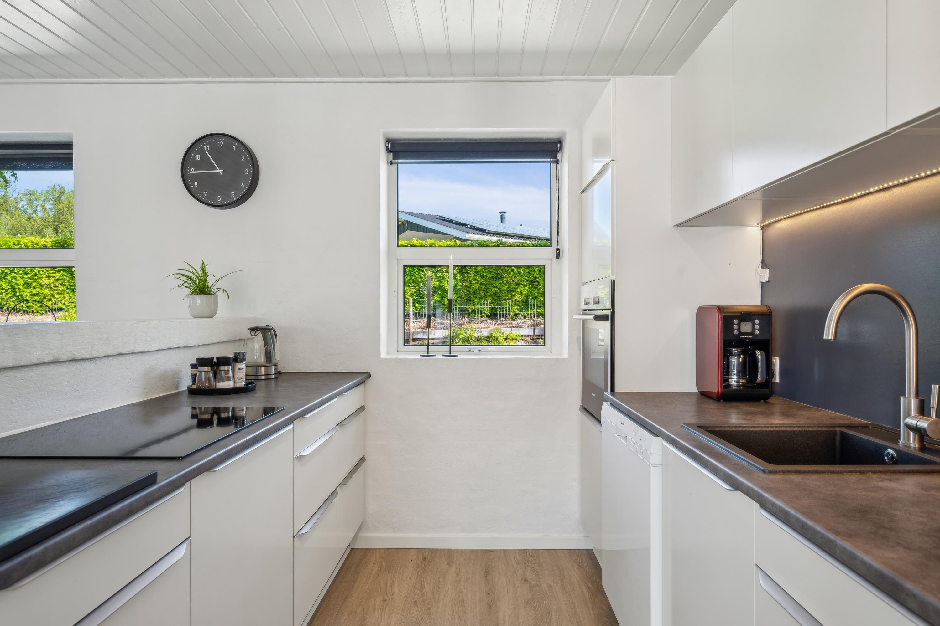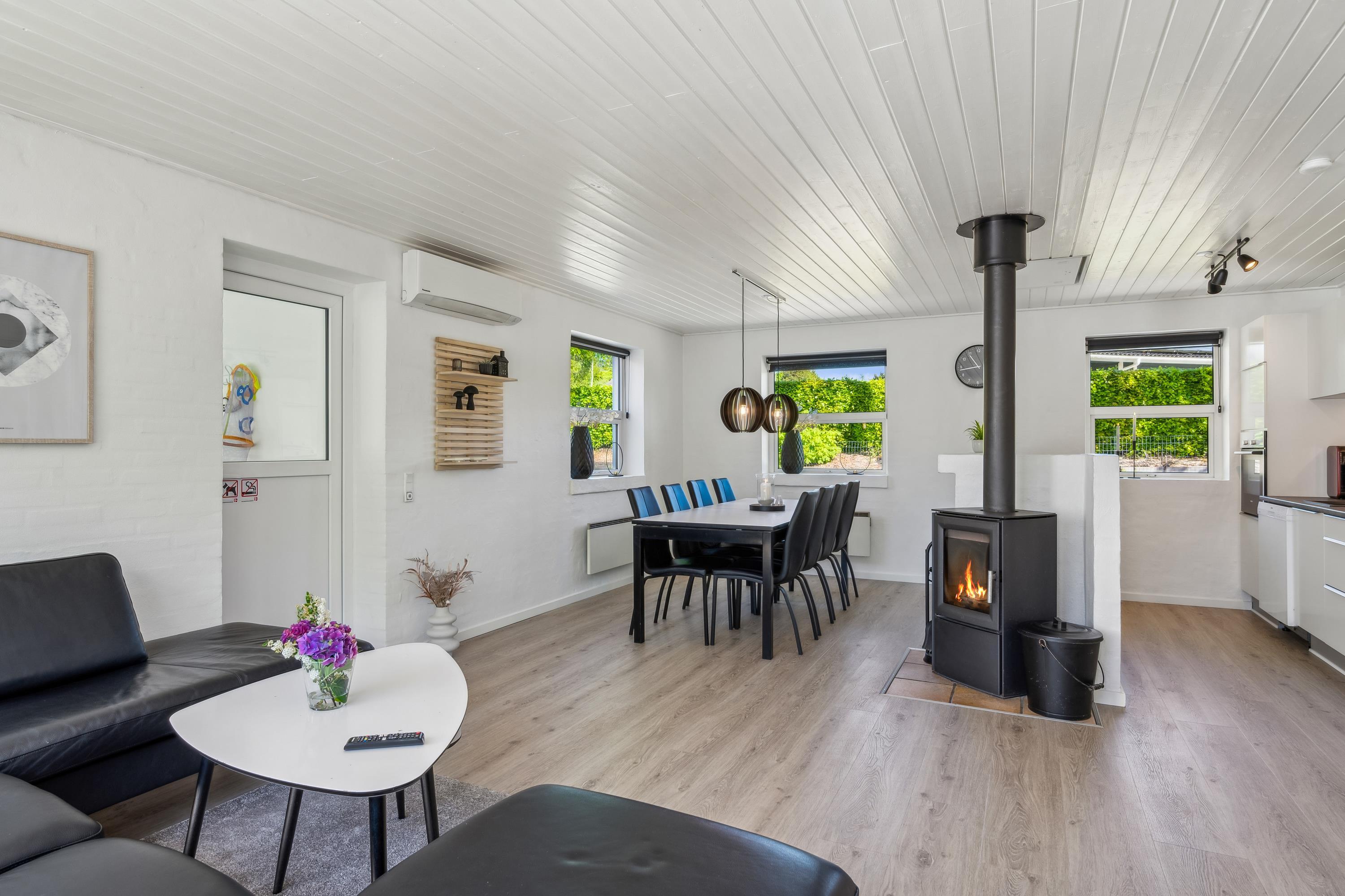 Huset fremstår overalt lyst og indbydende. Dejlig opholdsstue med brændeovn, skøn bekvem sofagruppe, og spiseplads til 8 personer, i åben forbindelse med nyt, meget veludstyret køkken med keramiske kogeplader, ovn, køle-/fryseskab, opvaskemaskine og mikrobølgeovn. Huset råder over 4 soveværelser - 3 med dobbeltseng og 1 med god køjeseng, i alt 8 sovepladser. Stort, lækkert badeværelse med gulvvarme, bruseniche, vaskemaskine og tørretumbler, samt badeværelse i poolrummet. Der er fjernsyn med danske og tyske kanaler samt radio. Der er internetadgang. Fra terrassen er der indgang til det store lyse poolrum med spabad.