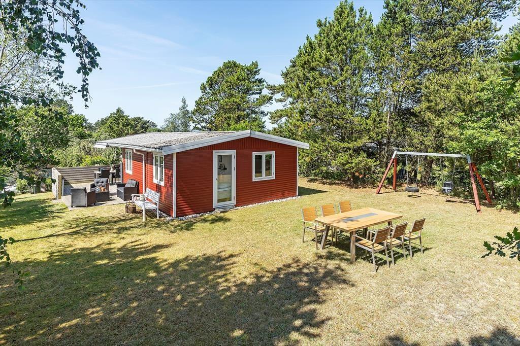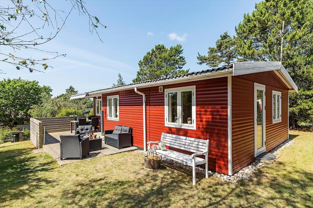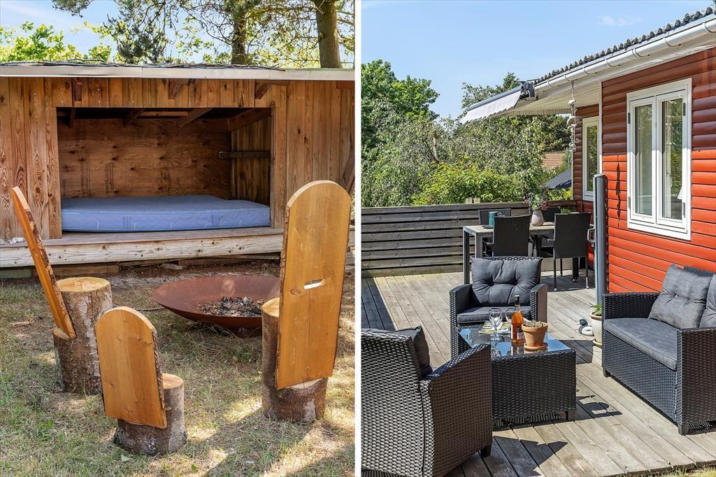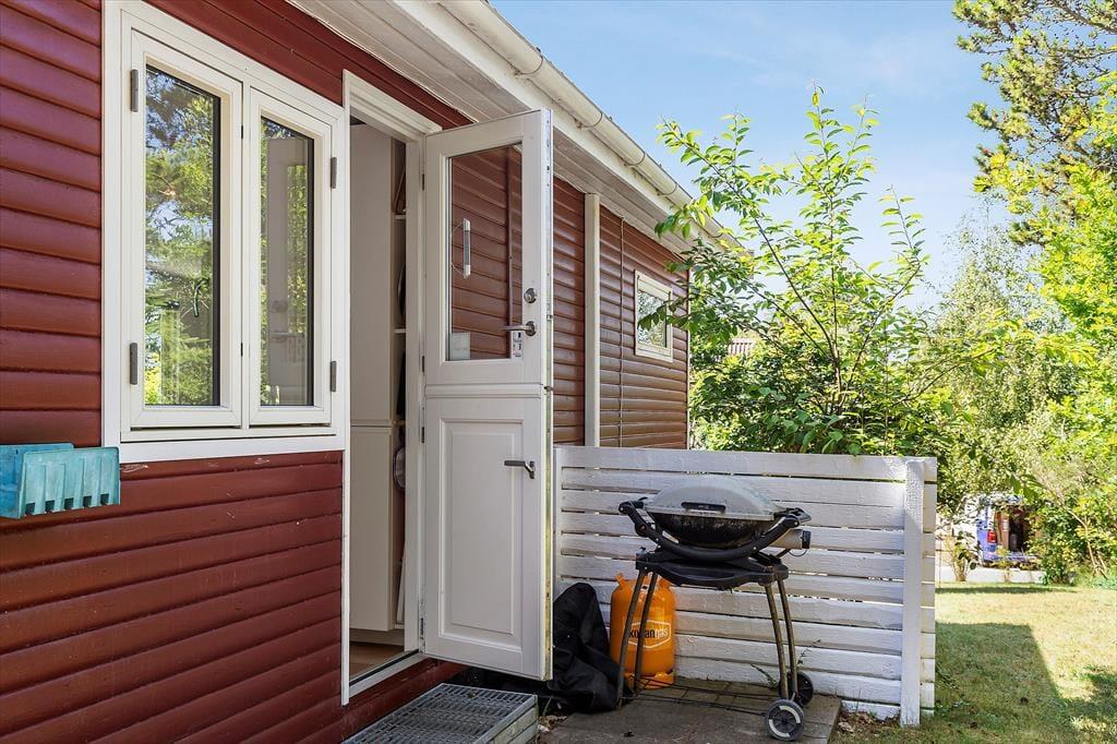 Udendørs venter en dejlig have, hvor både børn og hund kan boltre sig trygt, mens de voksne nyder solen på terrassen med en god kop kaffe. Der er både havemøbler, grill og fred og ro til afslapning, og med beliggenheden på en stille vej kan I virkelig trække vejret helt ned i maven. Den store træterrasse indbyder til mange timers udeliv – måske med en bog i skyggen, en god frokost i solen eller en aften under stjernerne.