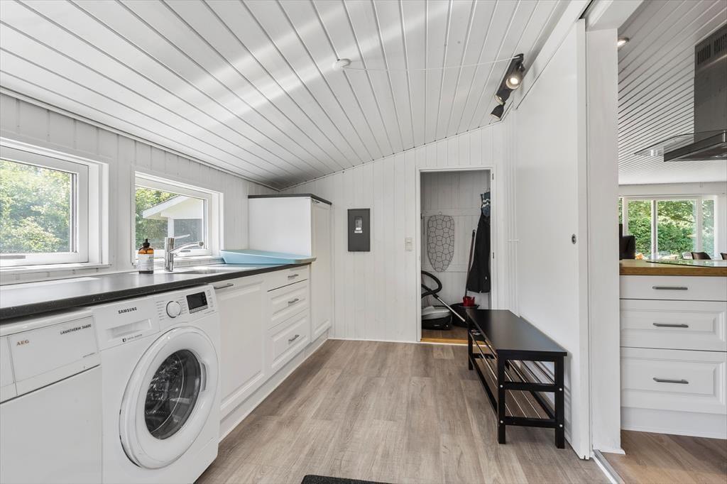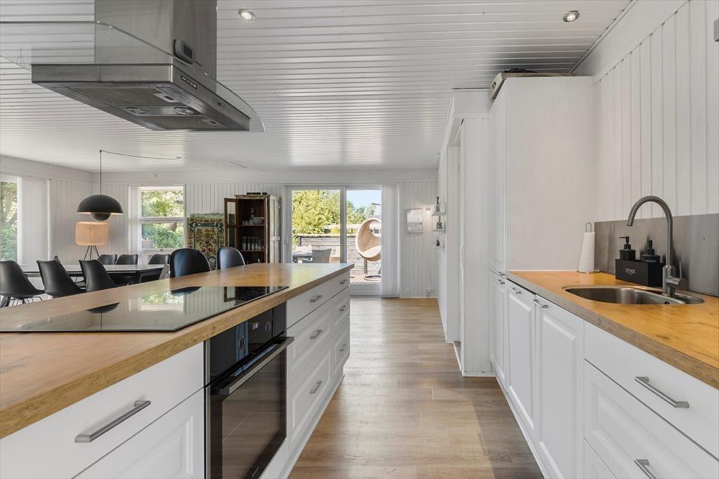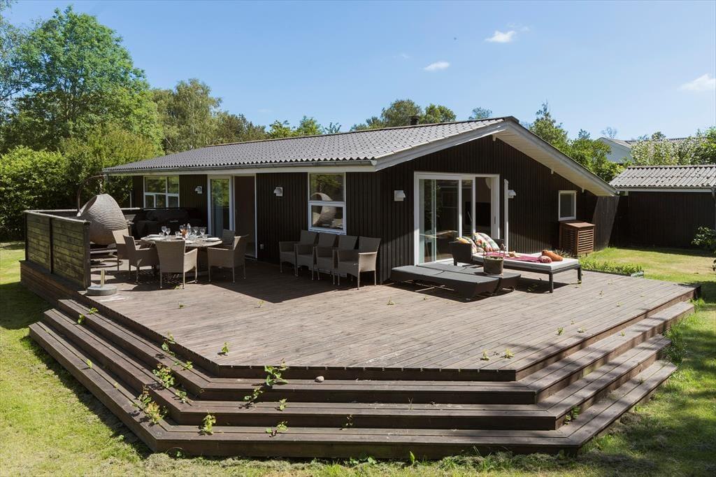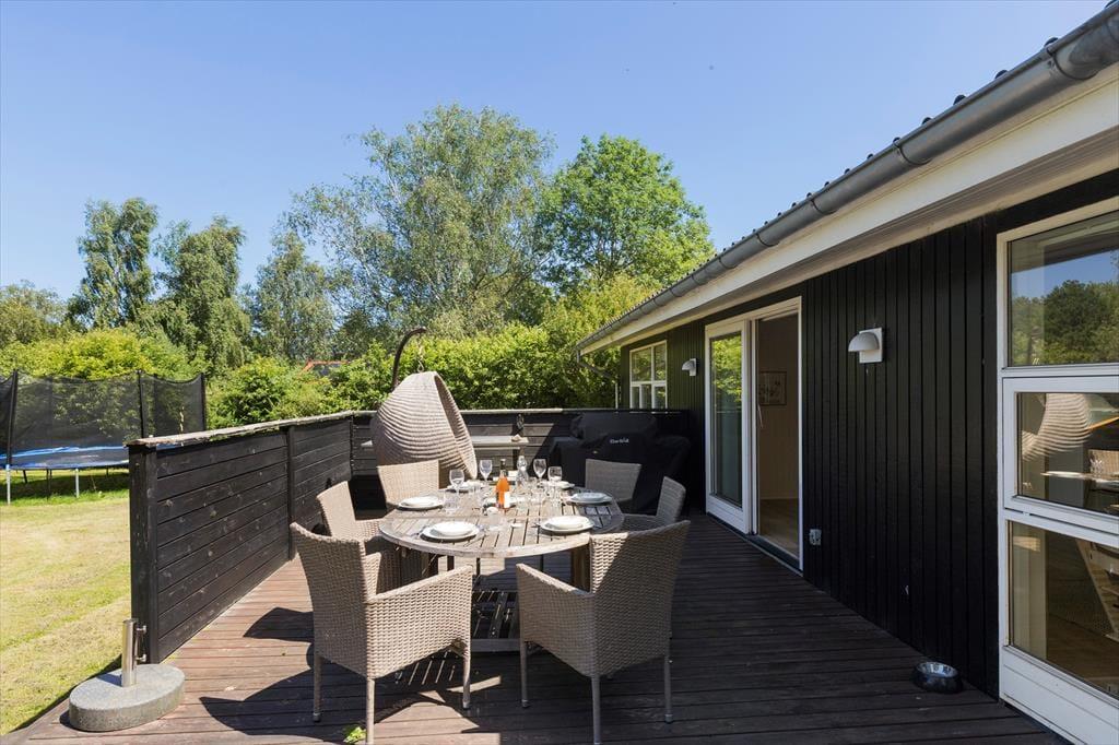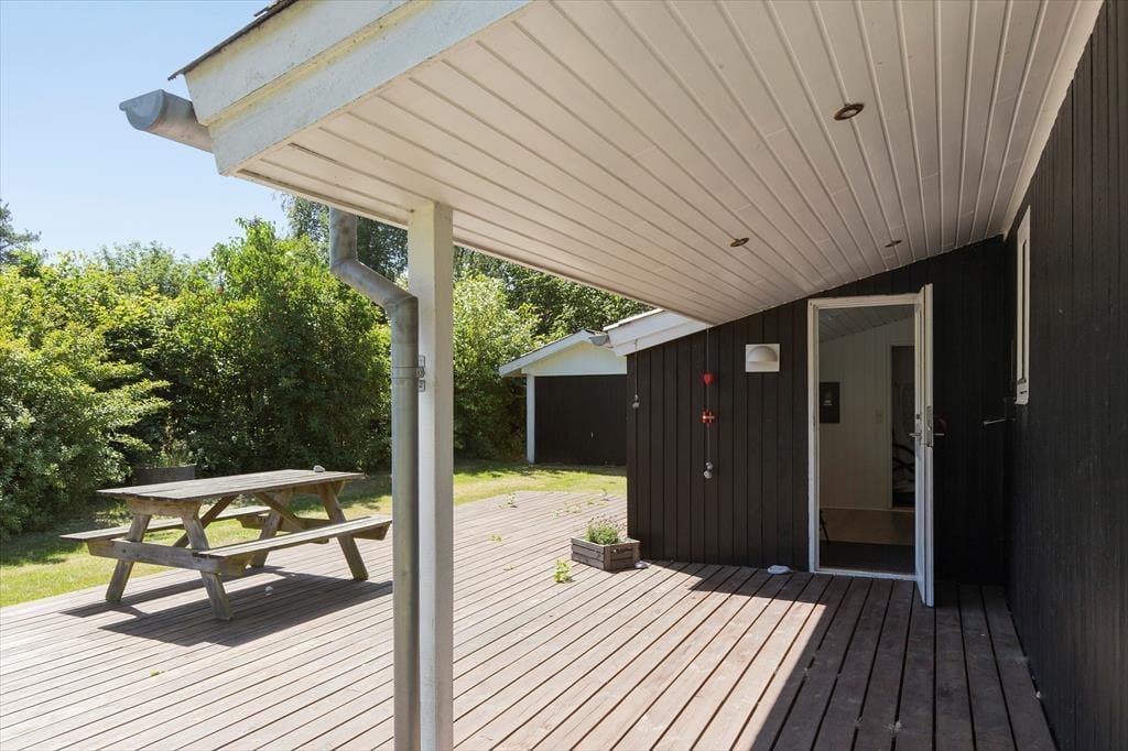 Træd ud på den rummelige grund (på 1.200 m²!), hvor frisk luft og plads til leg, hygge og afslapning venter på dig. Her er masser af plads til både stille stunder med en god bog og livlig leg for små og store. Den store overdækkede terrasse forlænger tiden hvor alle kan være ude i haven – til grillaftner eller anden udendørs hygge. Fra huset er der kun 300 meter til både stranden, kysten og dagligvarebutikker – nærmere ferieidyl får I næsten ikke! Og når sulten melder sig, ligger en hyggelig restaurant kun 500 meter væk.