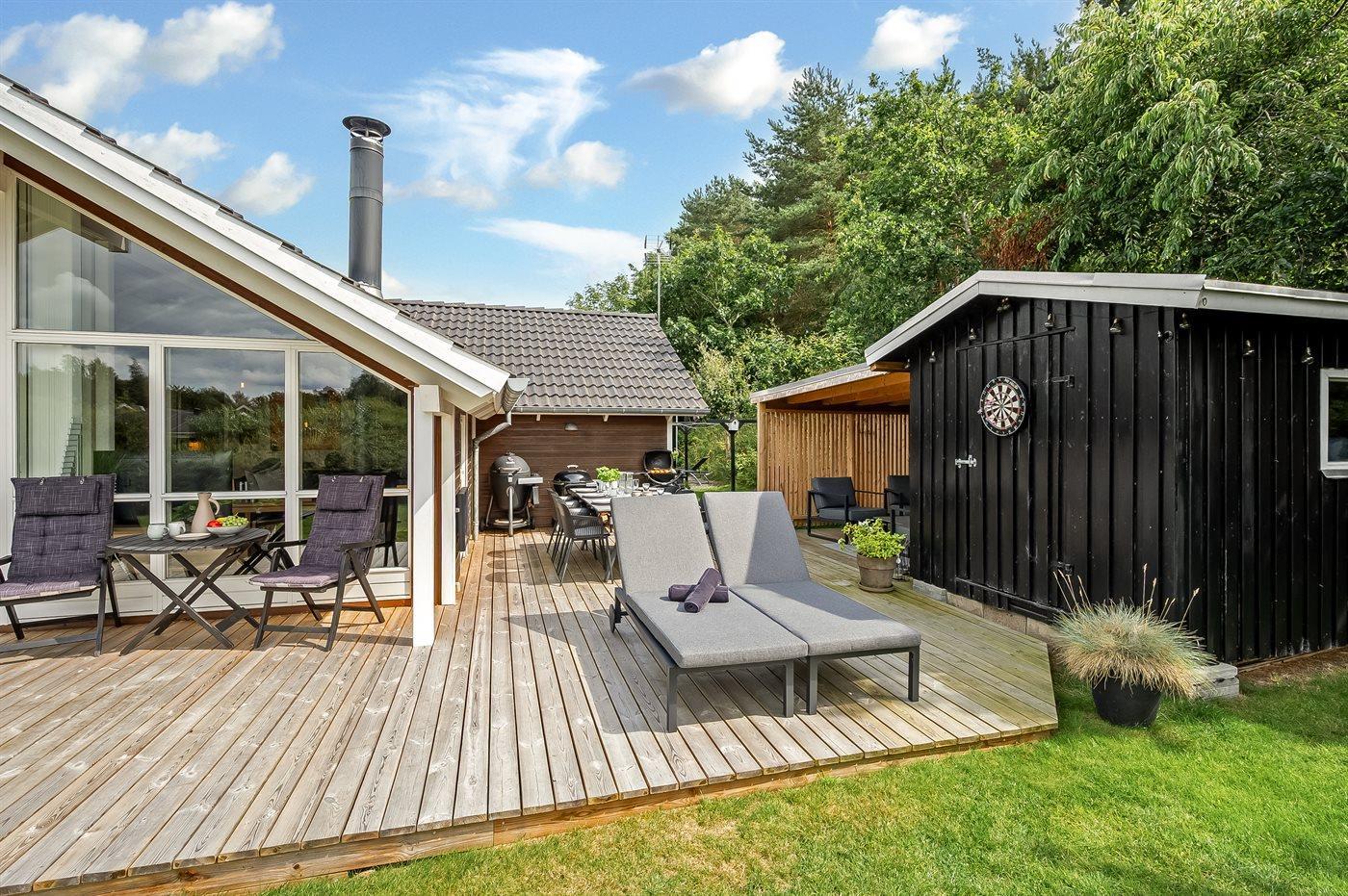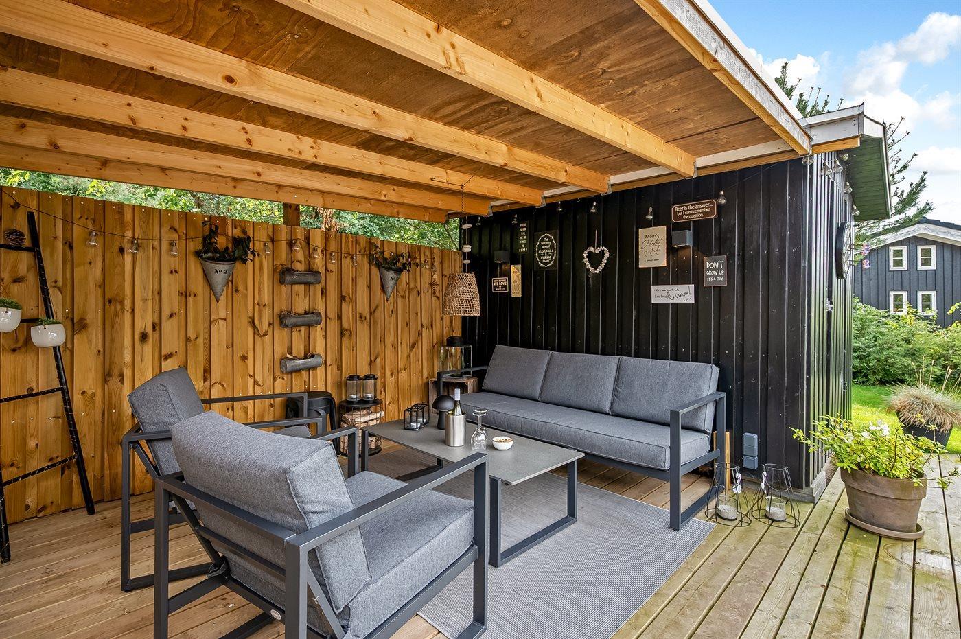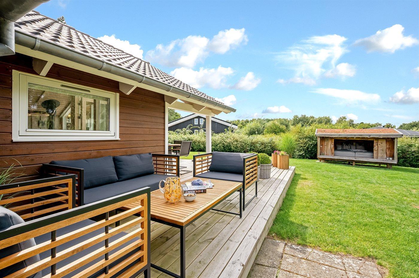 Ferieboligen er beliggende på en 1700 m² stor havegrund. Der er 500 m til havet. Nærmeste forretning er beliggende i en afstand af 500 m. Til ferieboligen hører åbent terrasseareal. Desuden er der overdækket terrasse. Gynge. Sandkasse. Fodboldmål. Bålsted. Shelter. Dart. Grill til rådighed. Der er installeret stik til opladning af elbil. Type 2 stik. Med 11 kW ladeeffekt. Parkering ved ferieboligen.