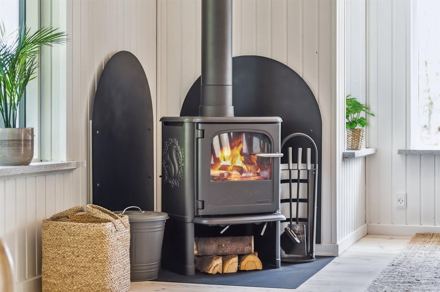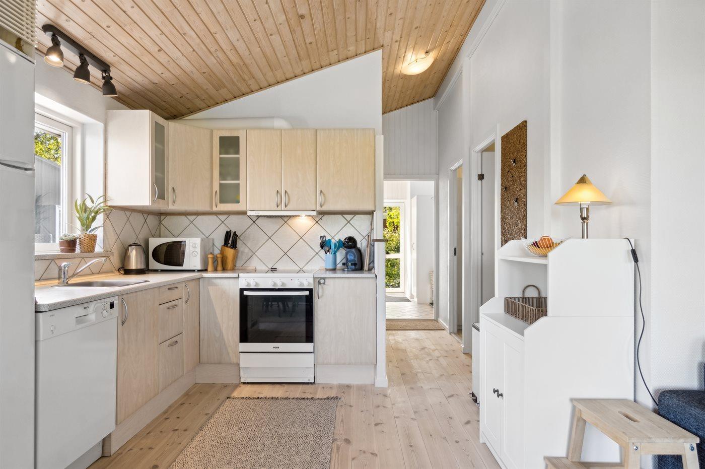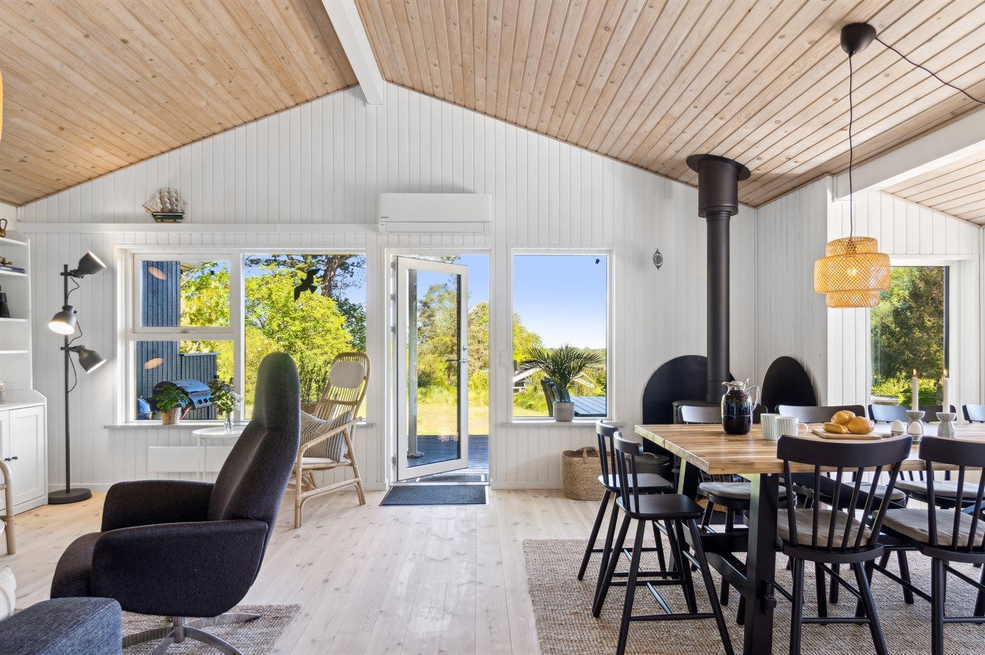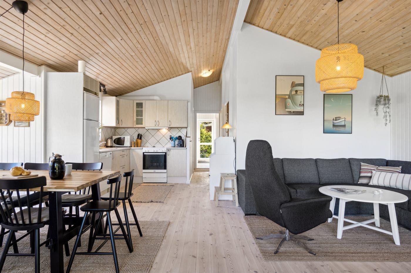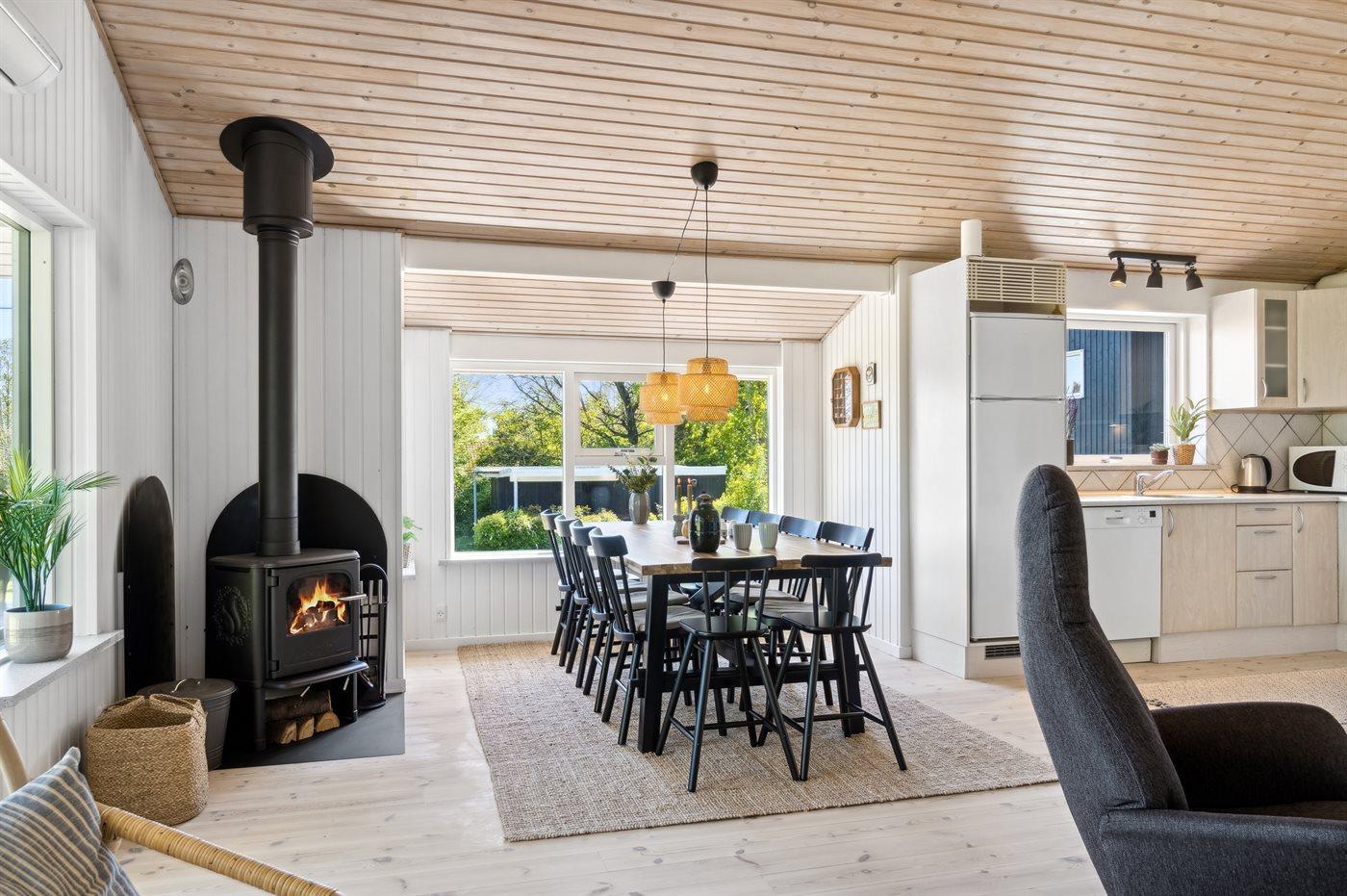 Husets hjerte er det åbne køkken-alrum, der smelter sammen med stuen og skaber et lyst og indbydende opholdsrum. Køkkenet er veludstyret med fire keramiske kogeplader, varmluftsovn, mikrobølgeovn, opvaskemaskine, køleskab med fryser, elkedel samt en Dolce Gusto kaffekapselmaskine. I stuen er der komfortable møbler, en hyggelig brændeovn samt et Smart-TV med Chromecast og adgang til danske, tyske, svenske og norske kanaler. Hele huset har trådløst internet og opvarmes energieffektivt med en varmepumpe.