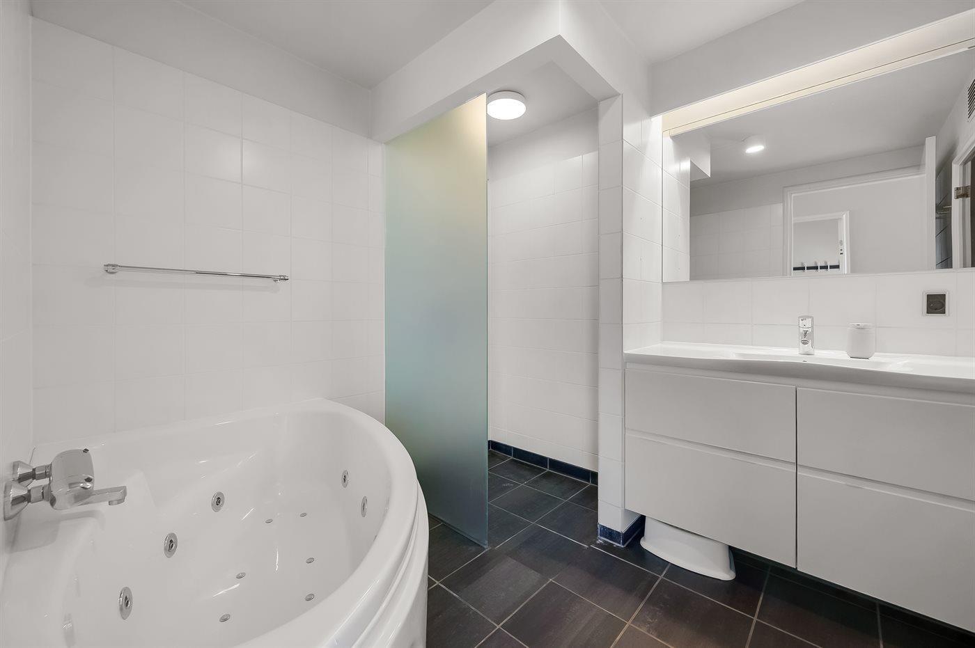 Toilet- og badefaciliteterne er opdelt i to separate rum: ét med spabad, bruseniche og adgang til sauna – og ét med toilet og håndvask.