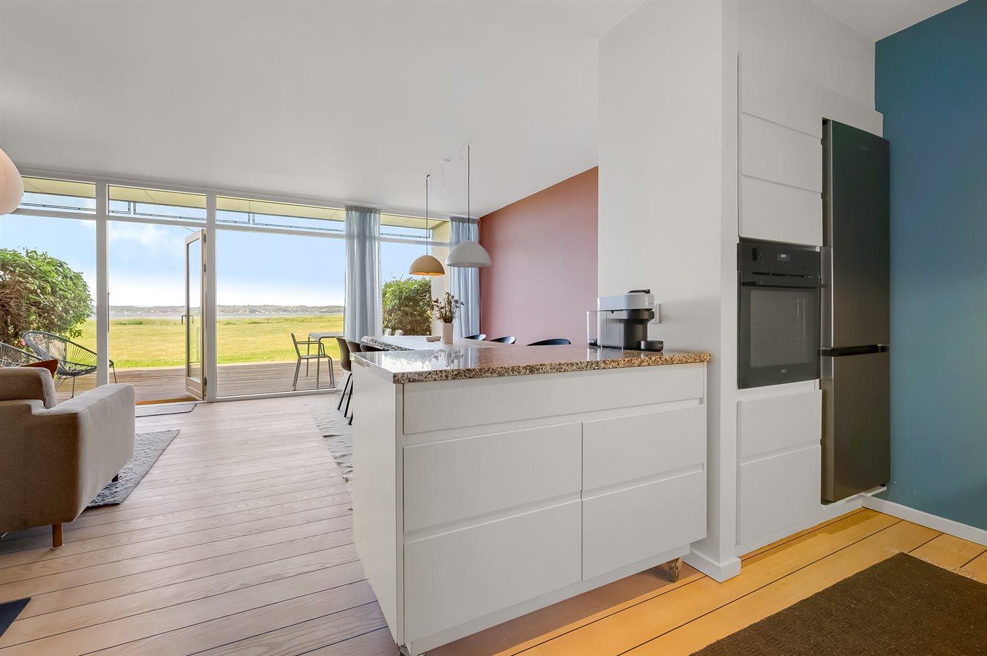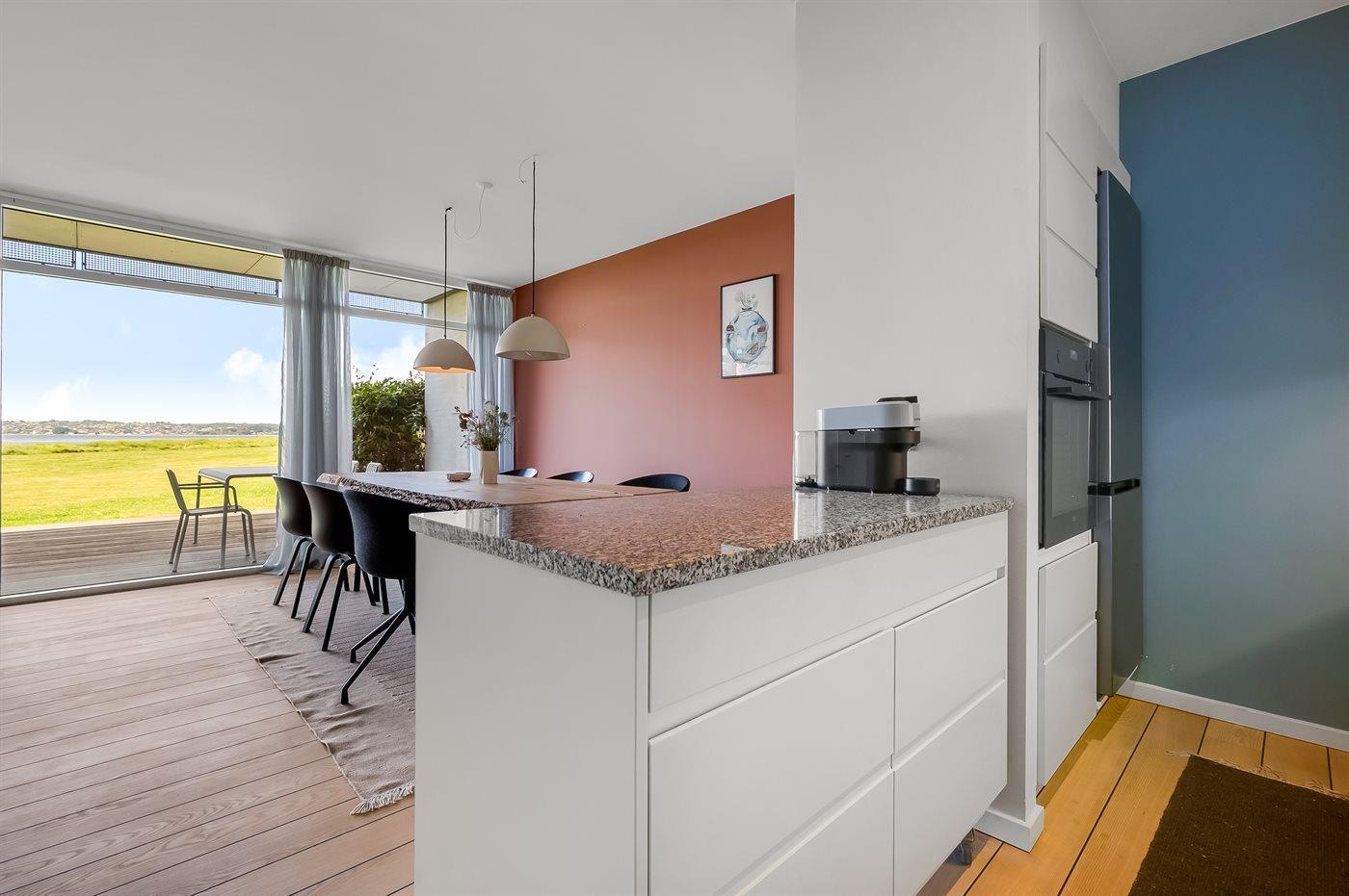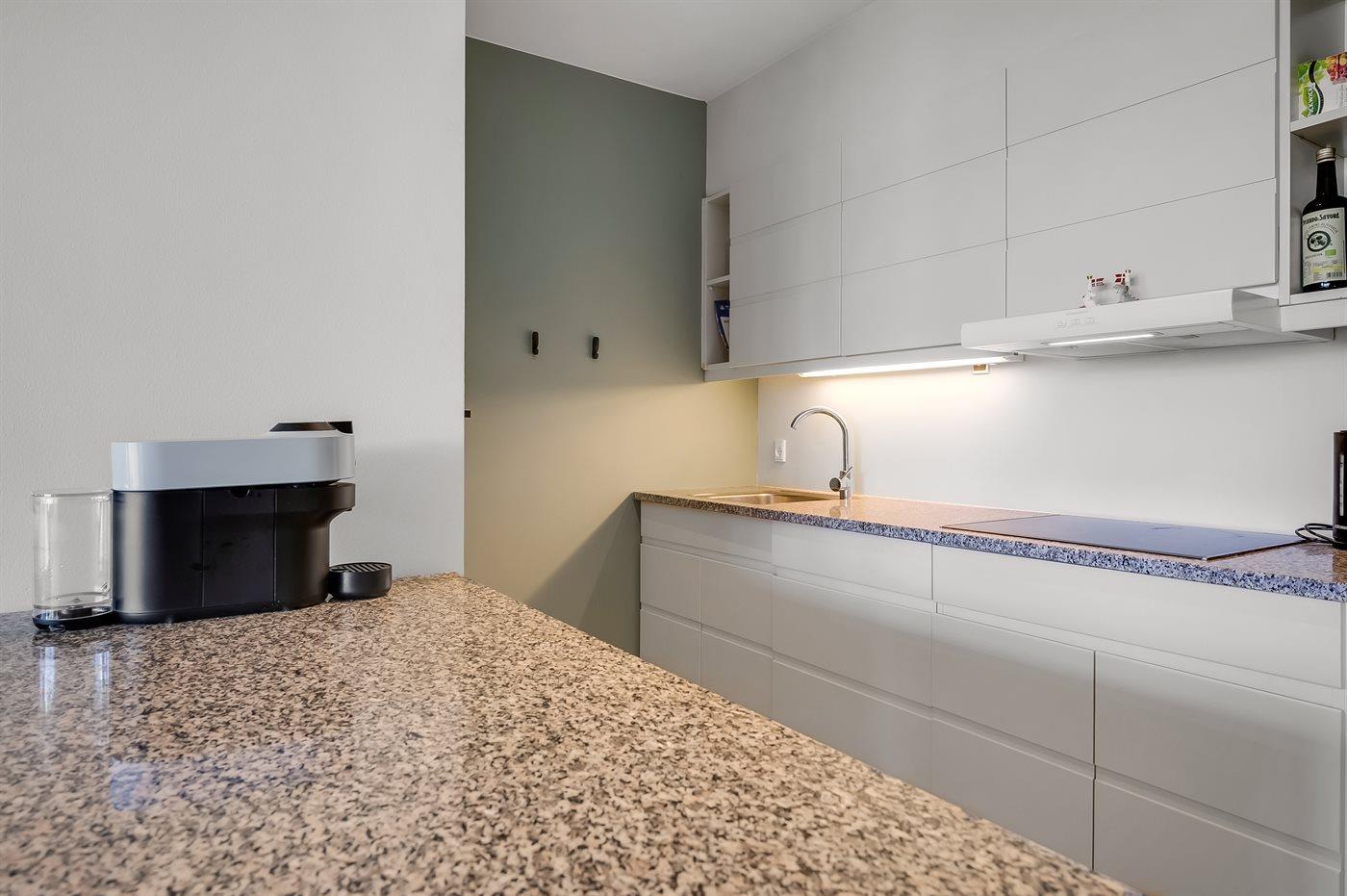 Køkkenet er udstyret med 1 køleskab. Der er 4 keramiske kogeplader, varmluftovn samt opvaskemaskine.
