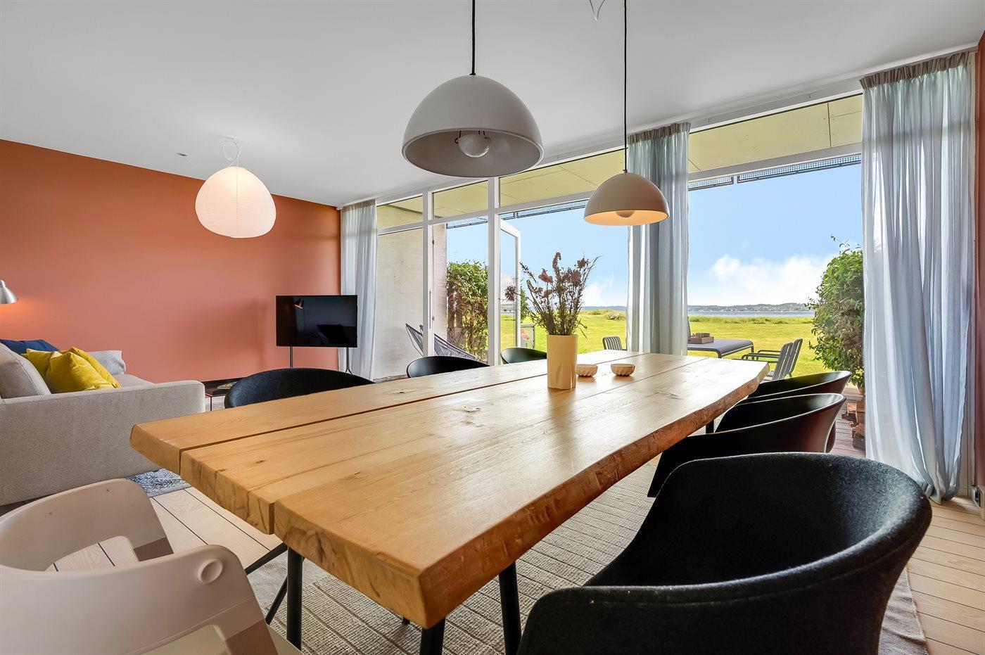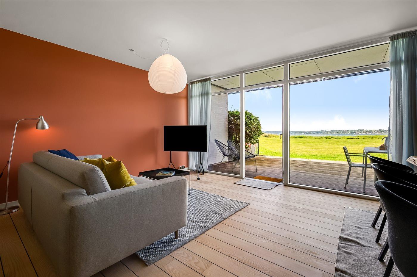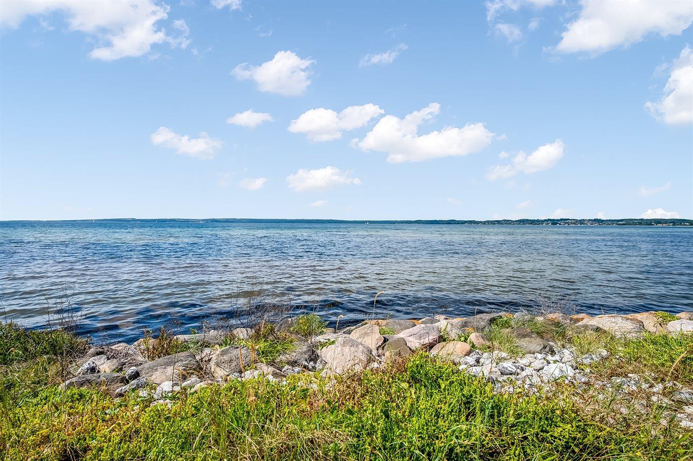 Velkommen til en lys og velholdt ferielejlighed med en helt unik beliggenhed – direkte ud til Ebeltoft Vig med fri udsigt over vandet. Fra entréen træder man ind i en indbydende stue med udgang til en overdækket terrasse, hvor man kan sidde i læ og nyde solnedgangen over bugten og Mols Bjerge i horisonten.