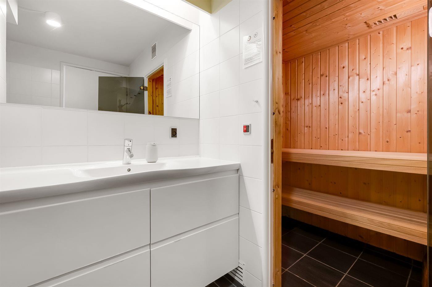 Der er 1 badeværelse med bruser og 1 toilet.. Der er gulvvarme på 1 badeværelse. I saunaen er der mulighed for afslapning.