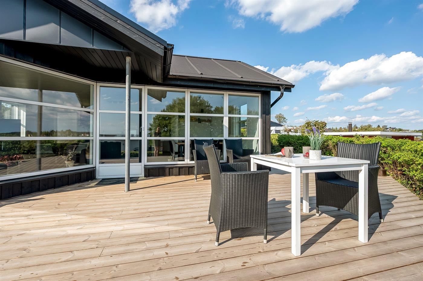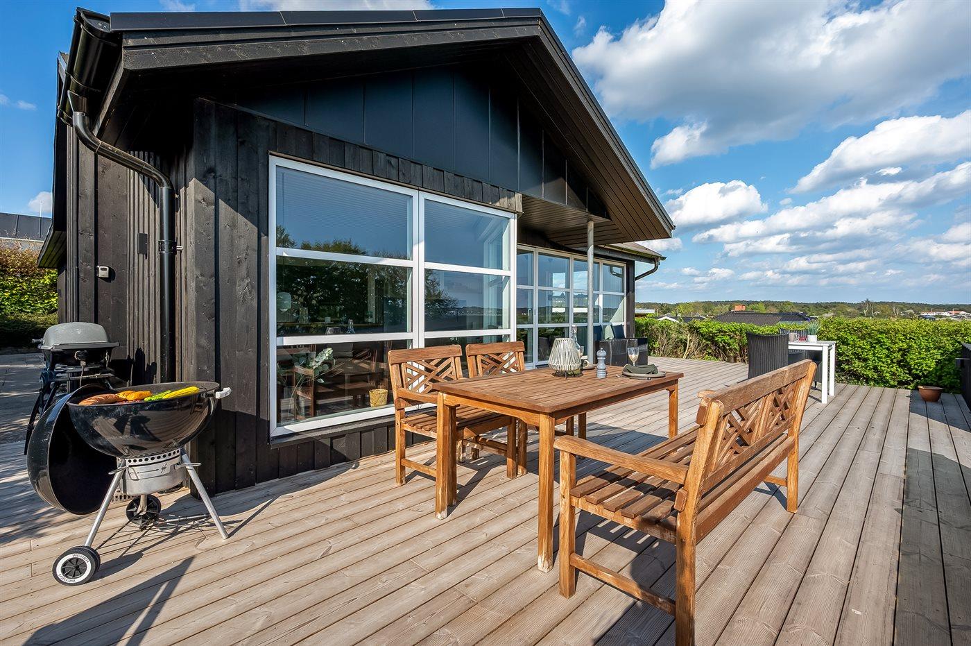 Ferieboligen er beliggende på en 1000 m² stor havegrund. Der er 100 m til havet. Nærmeste forretning er beliggende i en afstand af 2000 m. Til ferieboligen hører åbent terrasseareal. Desuden er der overdækket terrasse. Gynge. Udendørs sauna. Grill til rådighed. Der er installeret stik til opladning af elbil. Parkering ved ferieboligen.