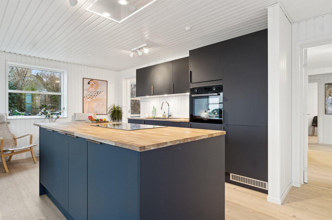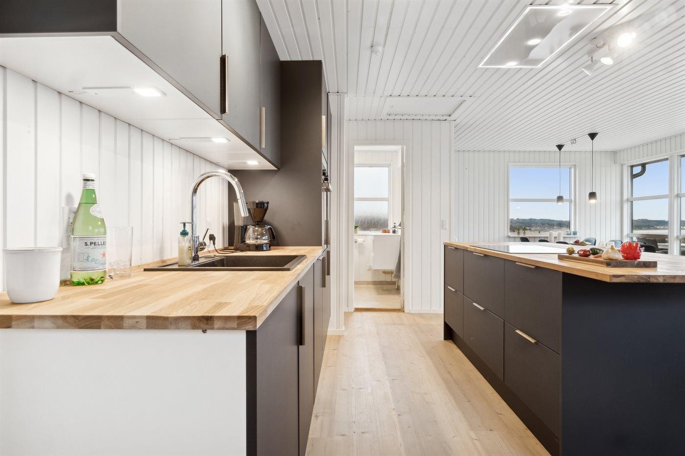 Køkkenet er udstyret med 1 køleskab. Der er 4 induktionskogeplader, varmluftovn, mikrobølgeovn samt opvaskemaskine.