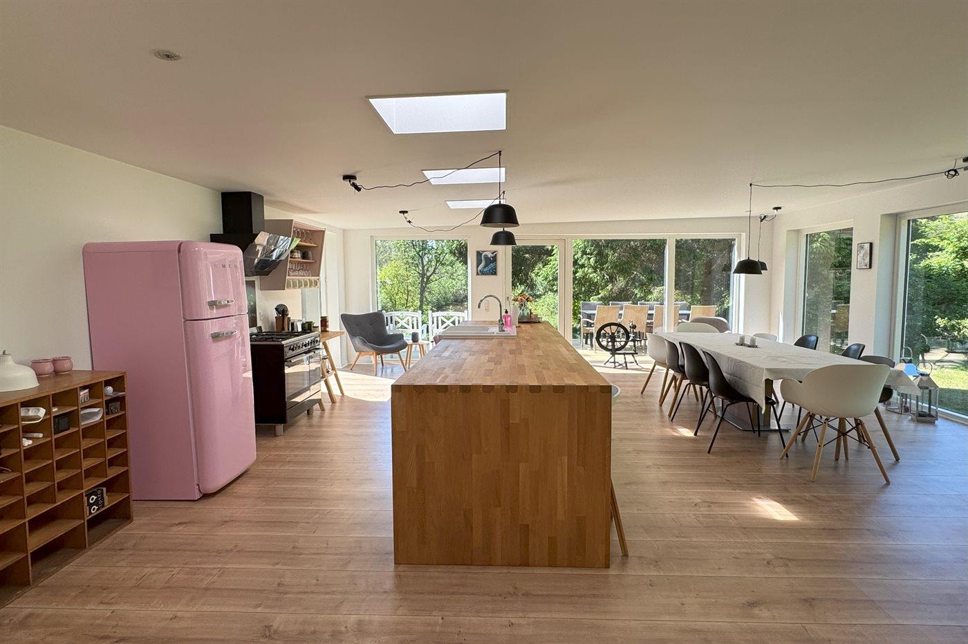 Det store fællesrum i hovedhuset har højt til loftet, masser af lys og direkte adgang til terrasser og den store naturgrund, hvor I kan nyde jeres egen sø og finde ro i grønne omgivelser. Her er både plads til leg, afslapning og samvær – og hunden er selvfølgelig også velkommen.