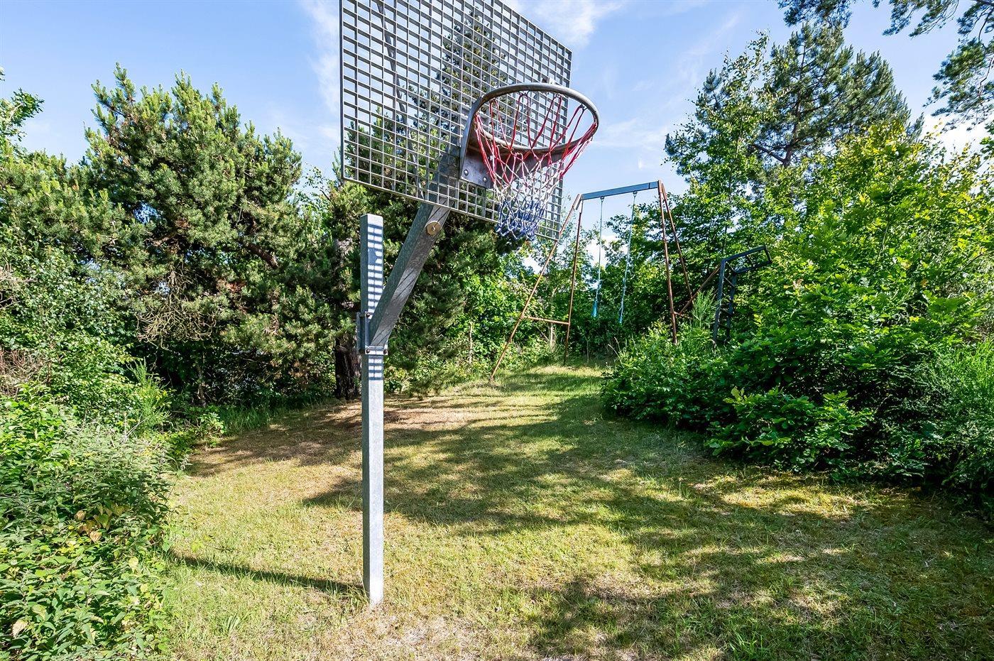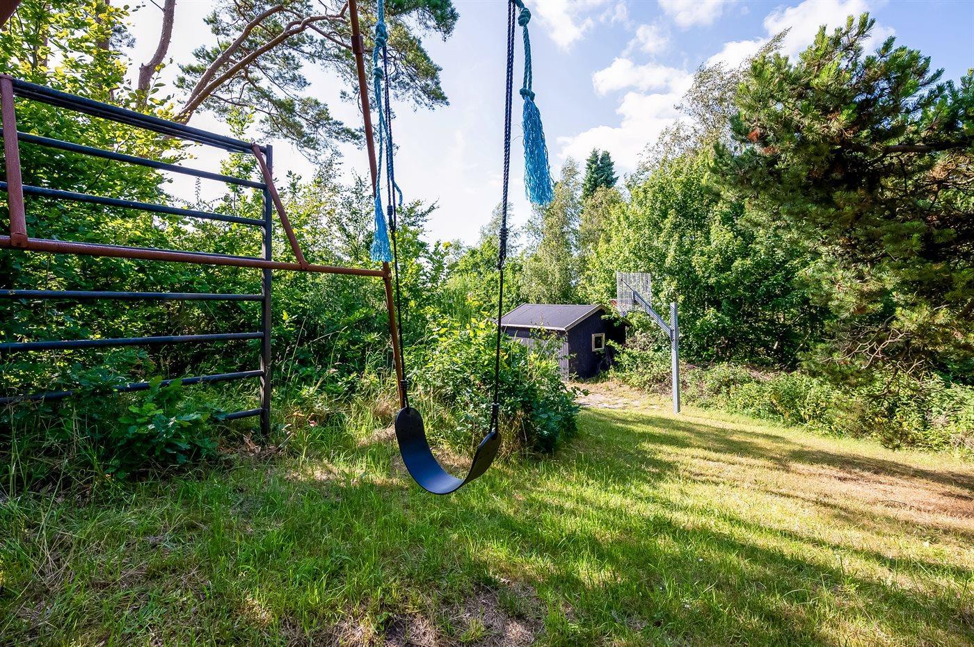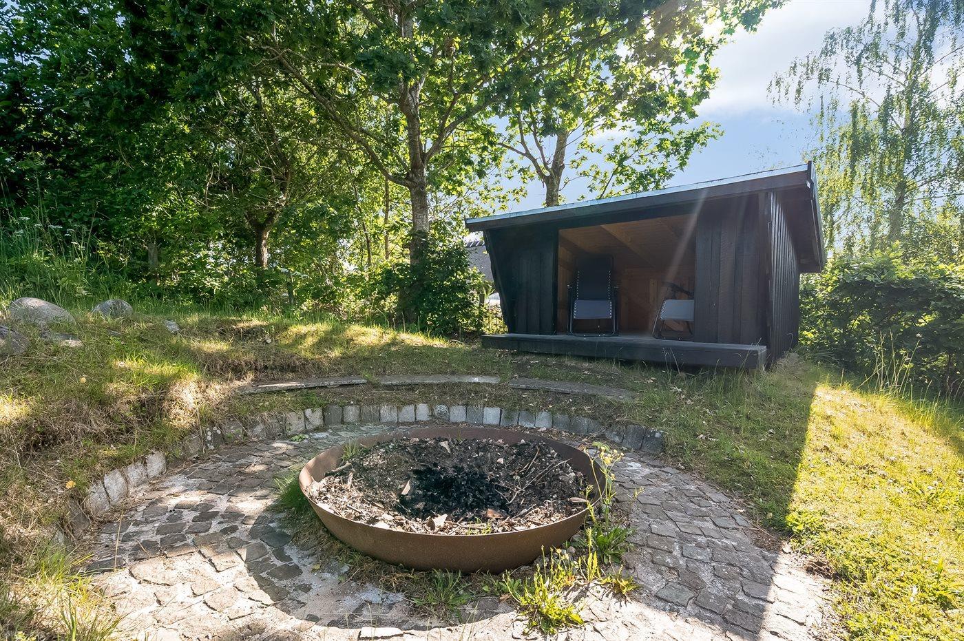 Ferieboligen er beliggende på en 1350 m² stor naturgrund. Der er 450 m til havet. Der er en badebro i nærheden. Nærmeste forretning er beliggende i en afstand af 800 m. Til ferieboligen hører åbent terrasseareal. Gynge. Bålsted. Shelter. Der er mulighed for at tilberede maden udendørs i udekøkkenet. Grill til rådighed. Parkering ved ferieboligen.
