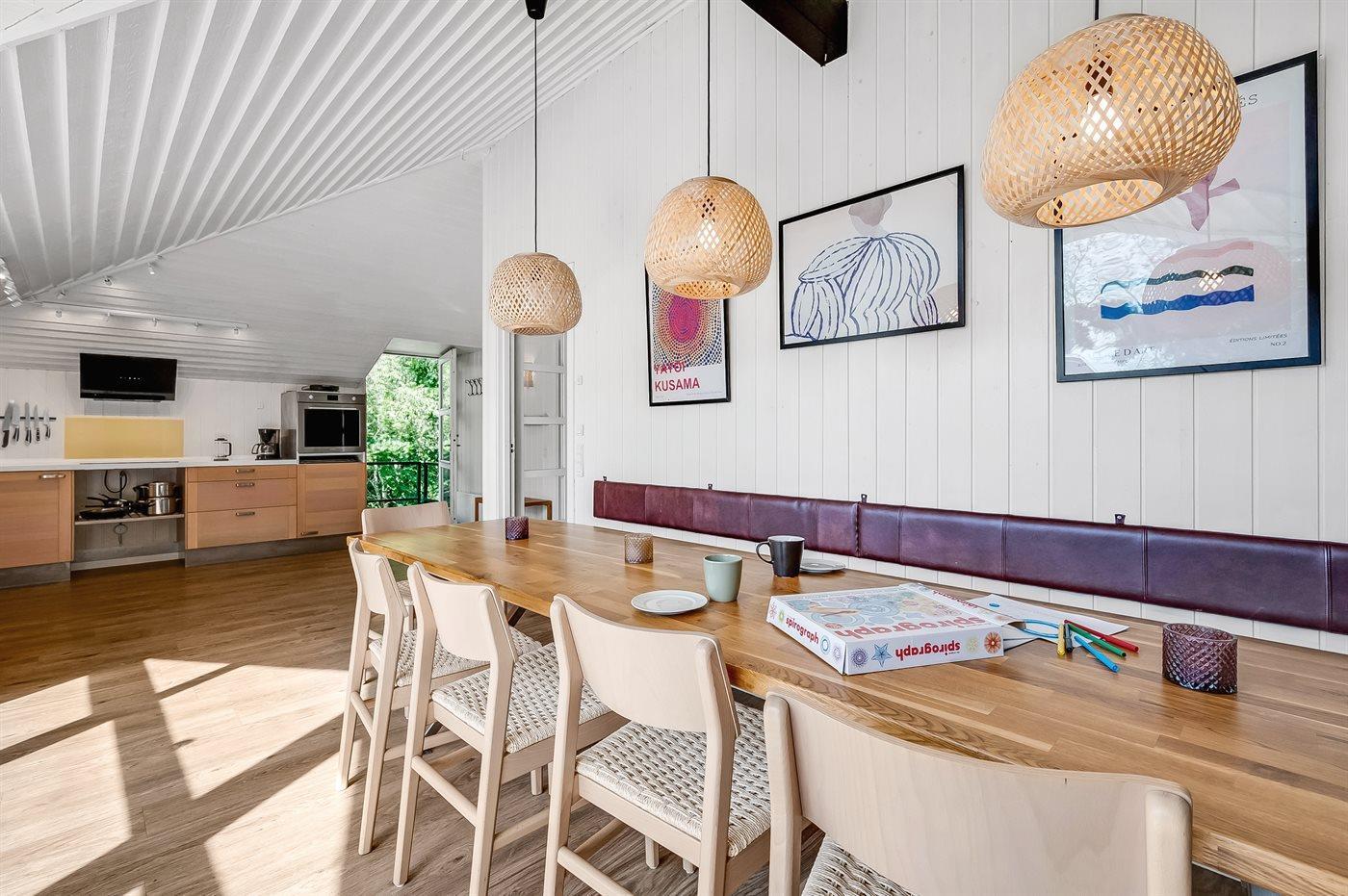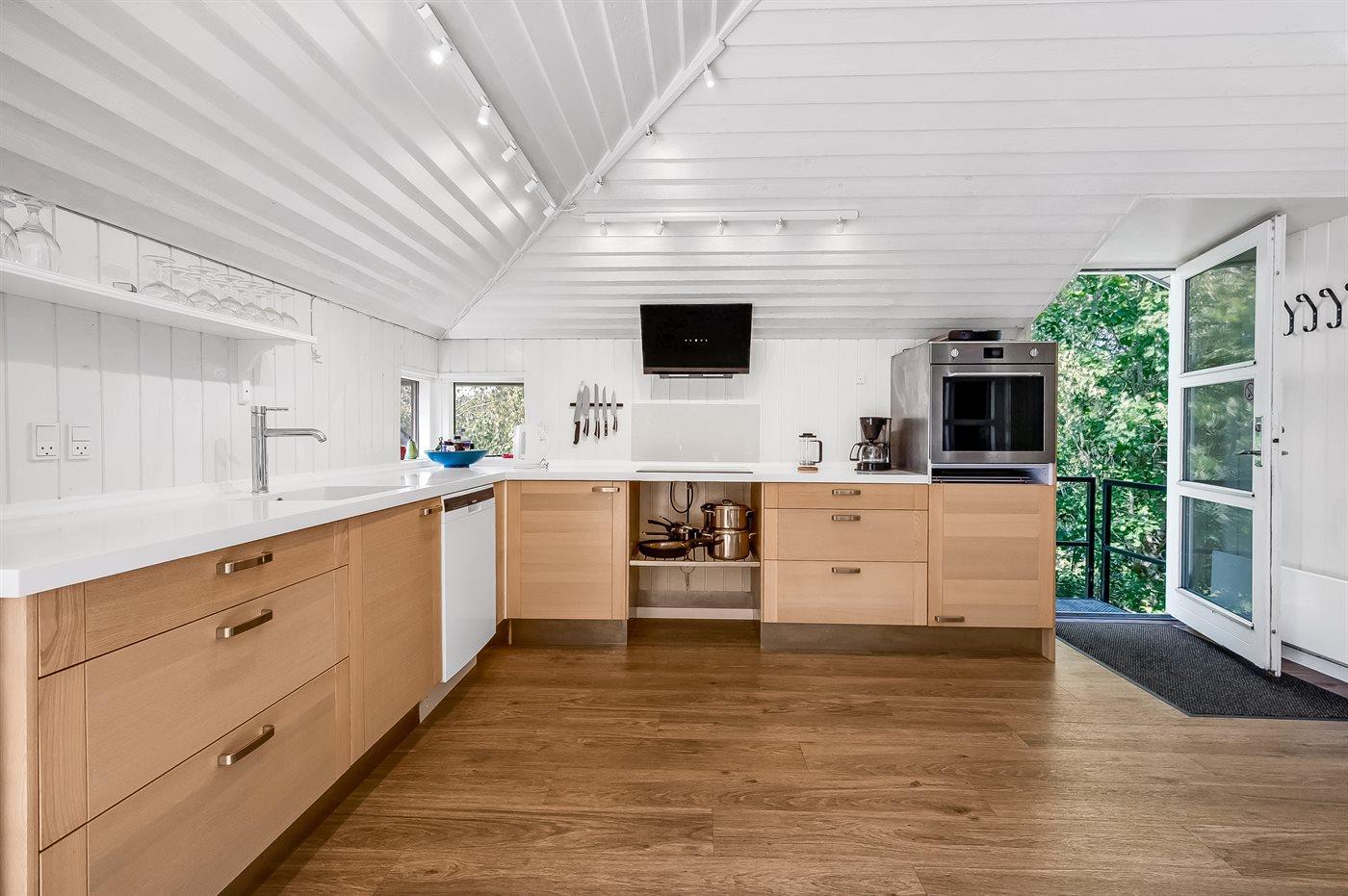 Køkkenet er udstyret med 1 køleskab. Der er 4 induktionskogeplader, varmluftovn, mikrobølgeovn samt opvaskemaskine.