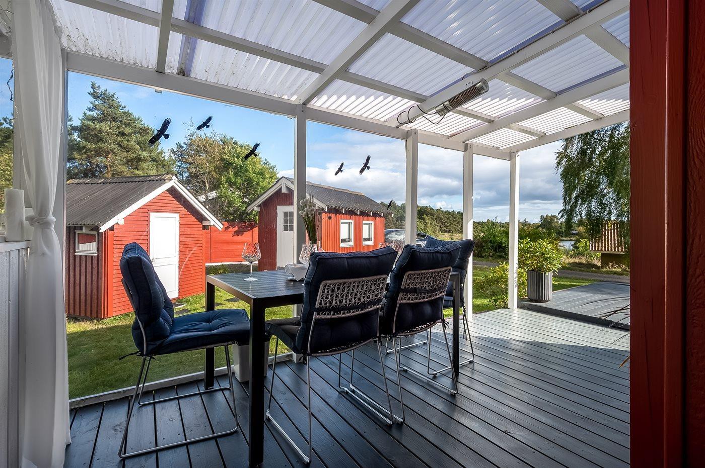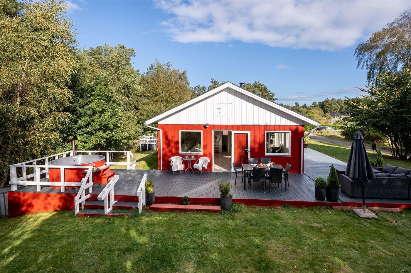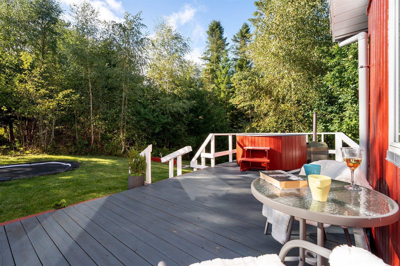 Sommerhuset har en entre med to soveværelser og bad/wc. Køkken og spisestue samt stuen med brændeovn er i samme åbne afdeling. Fra stuen er der udgang til stor terrasse, både overdækket og åben, hvor der står et vildmarksbad, som er omkranset af den grønne skov bagved.