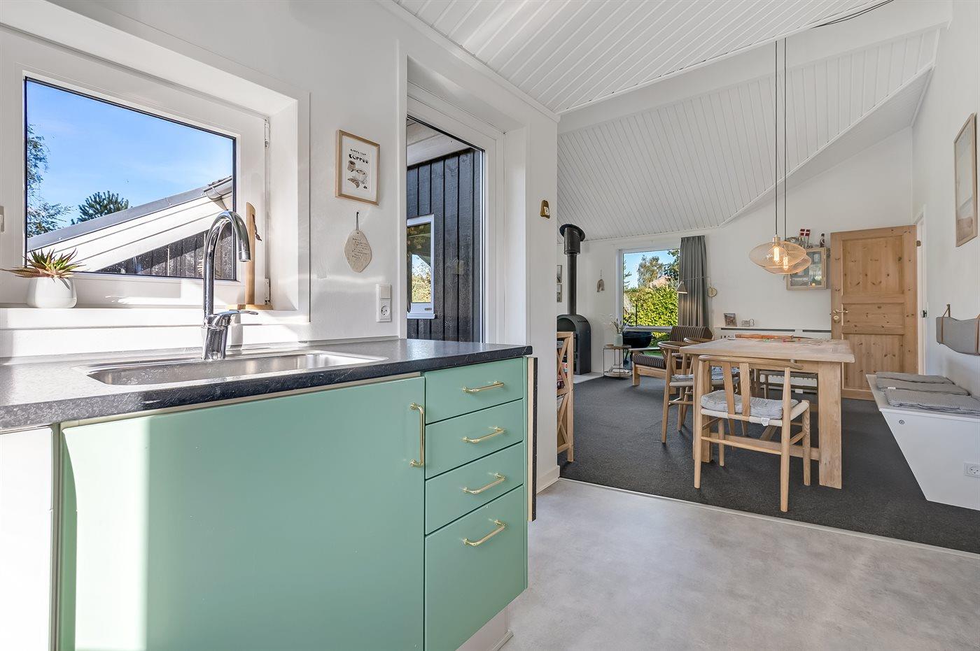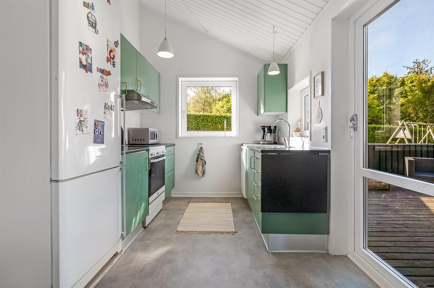 Køkkenet er udstyret med 1 køleskab. Der er 4 keramiske kogeplader, varmluftovn, mikrobølgeovn samt opvaskemaskine.