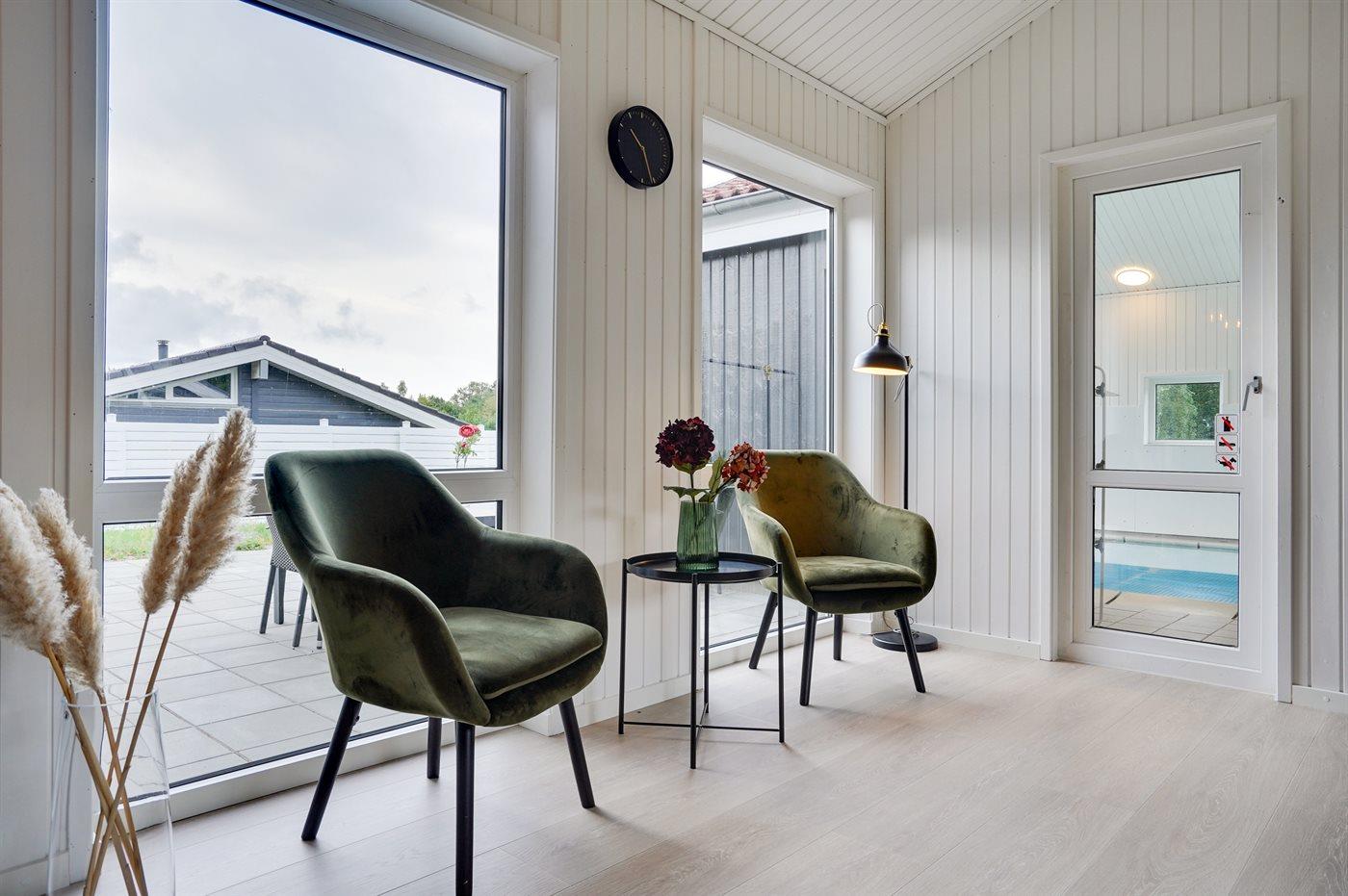 Moderne sommerhus nær Lyngsbæk Strand med indendørs pool og spa til afslapning.