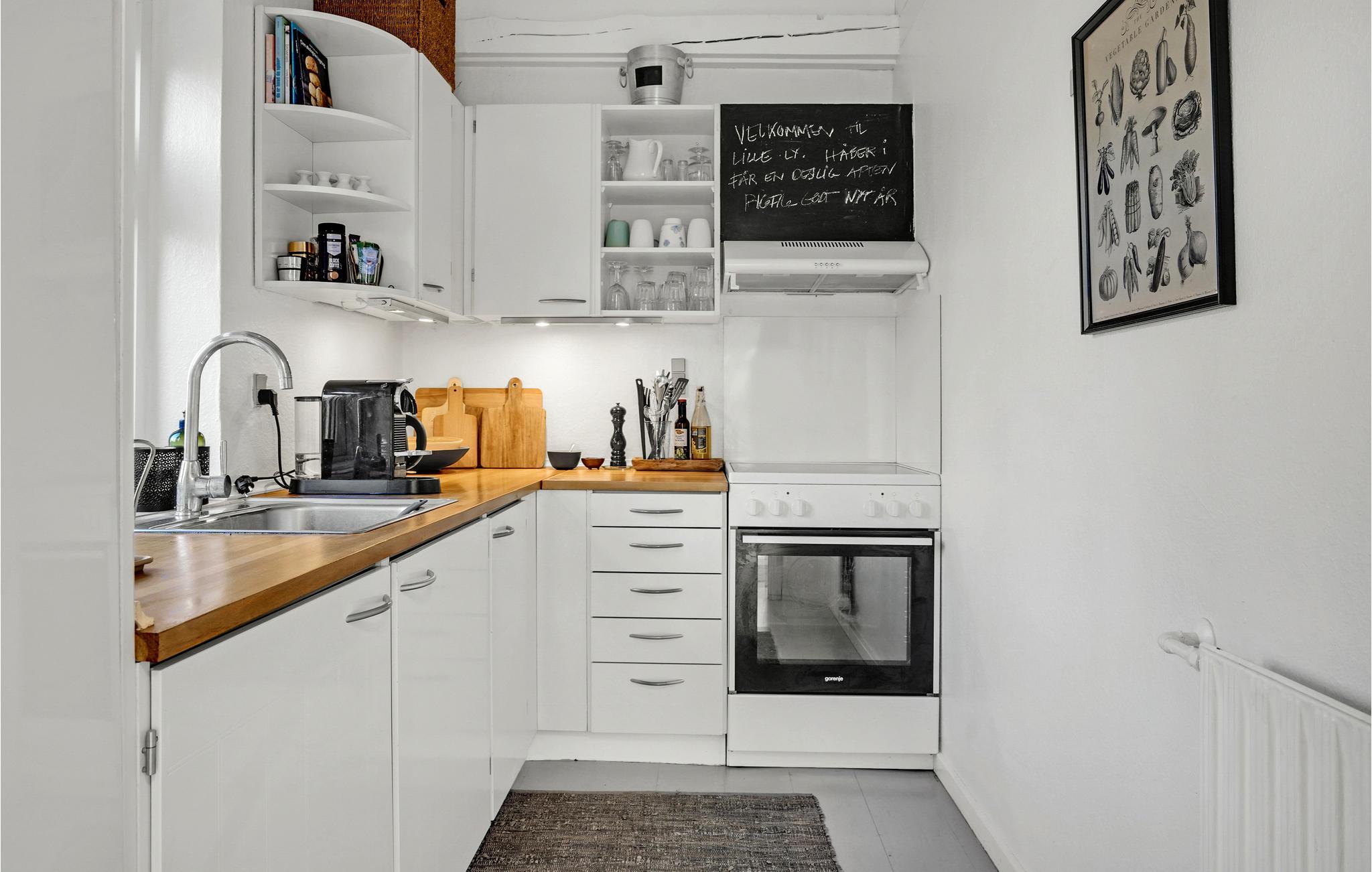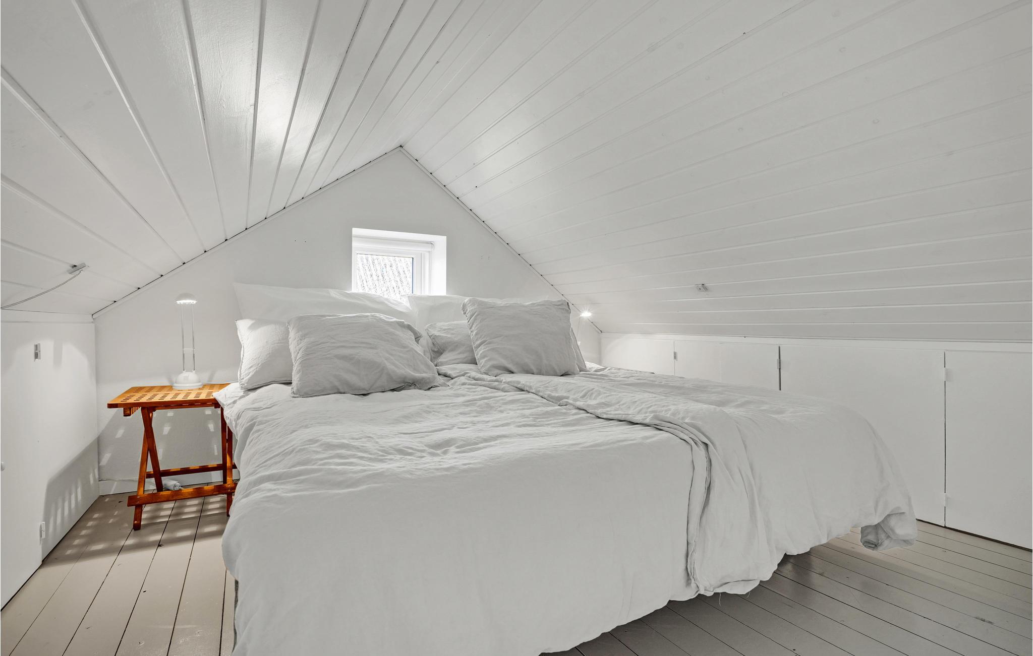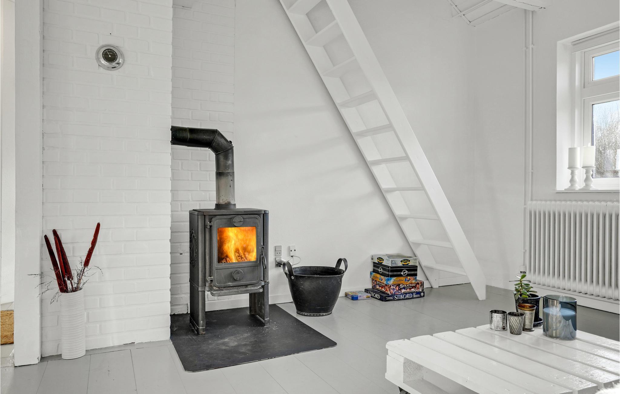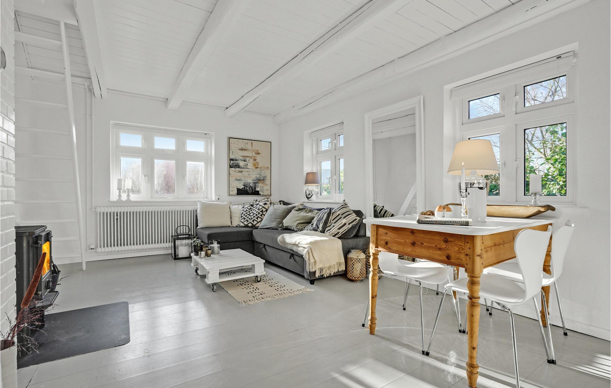Huset er smagfuldt indrettet og fungerer som den perfekte base mellem jeres udflugter og ærinder i byen. Især sofaområdet ved brændeovnen er det perfekte sted at slå sig ned, når I kommer hjem og har trætte ben. På 1. sal finder I et bedårende soveværelse under det spidse tag. Til huset hører desuden en fin fliseterrasse, hvor I kan sidde og sole jer, læse en god bog og grille om aftenen.