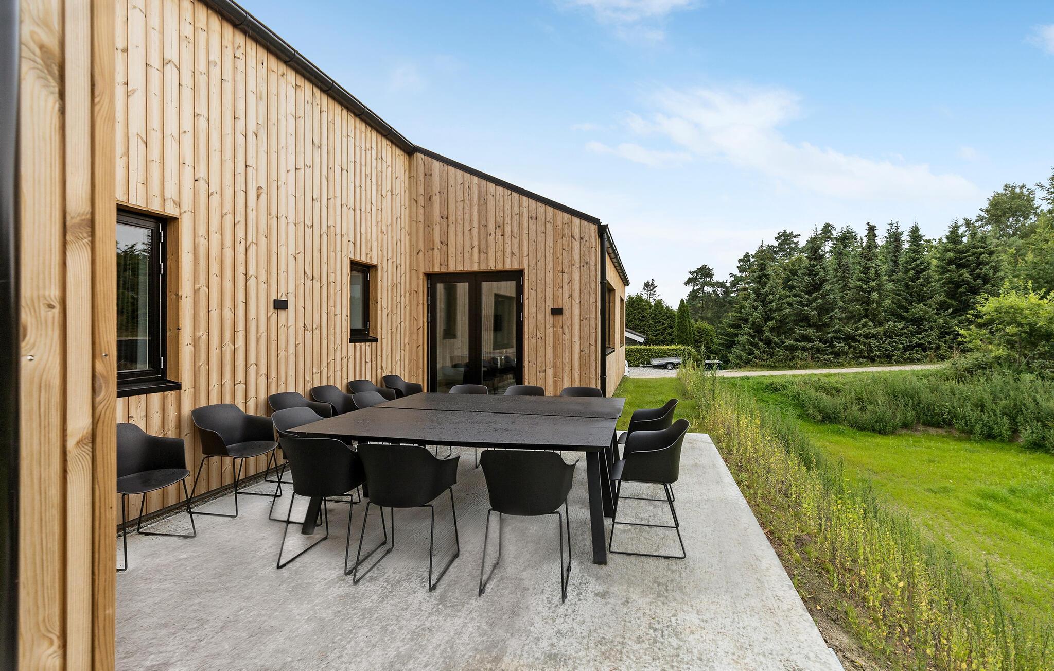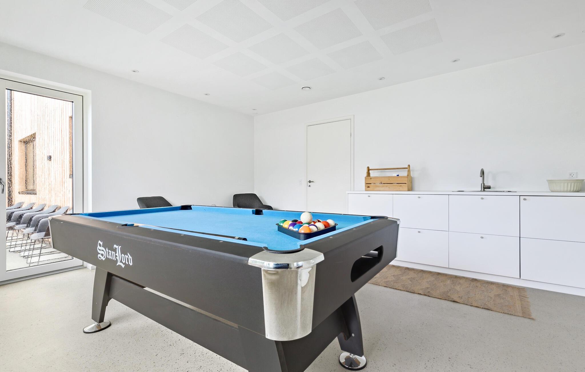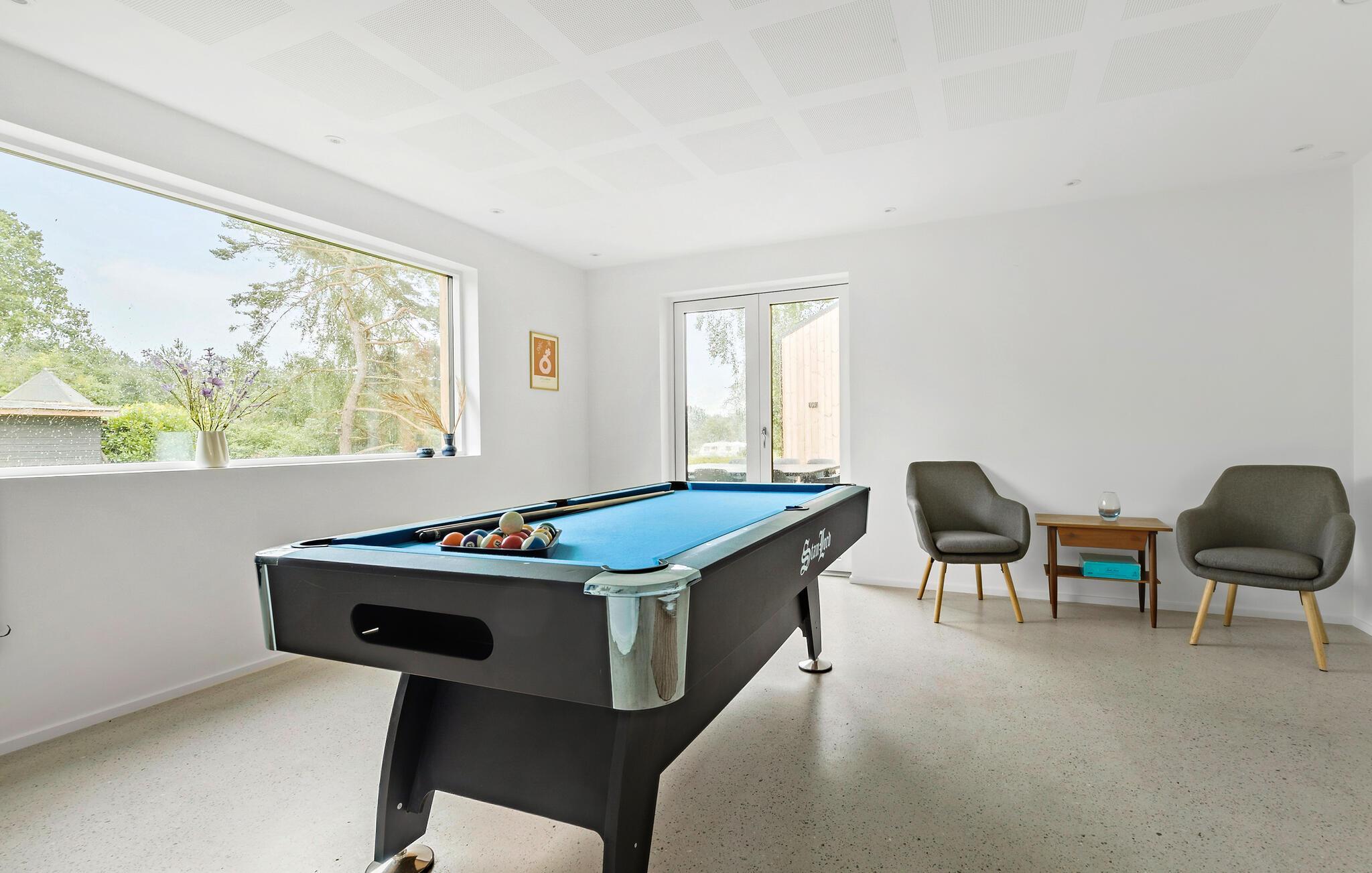 Hvis I er på udkig efter en feriebolig med plads til hele den store familie, og vil I gerne bo midt i den skønne natur tæt på stranden, er dette komfortable hus ved Ebeltoft det helt rette valg. Indretningen fremtræder virkelig flot og kombinerer skandinavisk minimalisme med moderne bekvemmeligheder, så I kan nyde god komfort og hygge på tværs af generationerne. Husets hjerte er den åbne opholdsstue, der får dejlige lysindfald gennem de store vinduespartier, der samtidig giver en skøn udsigt til det grønne. Køkkenet er moderne og fuldt udstyret, så lad endelig familiens kokke tage sig god tid med madlavningen, mens andre duellerer i aktivitetsrummet eller dækker op ved spisebordet med plads til alle.