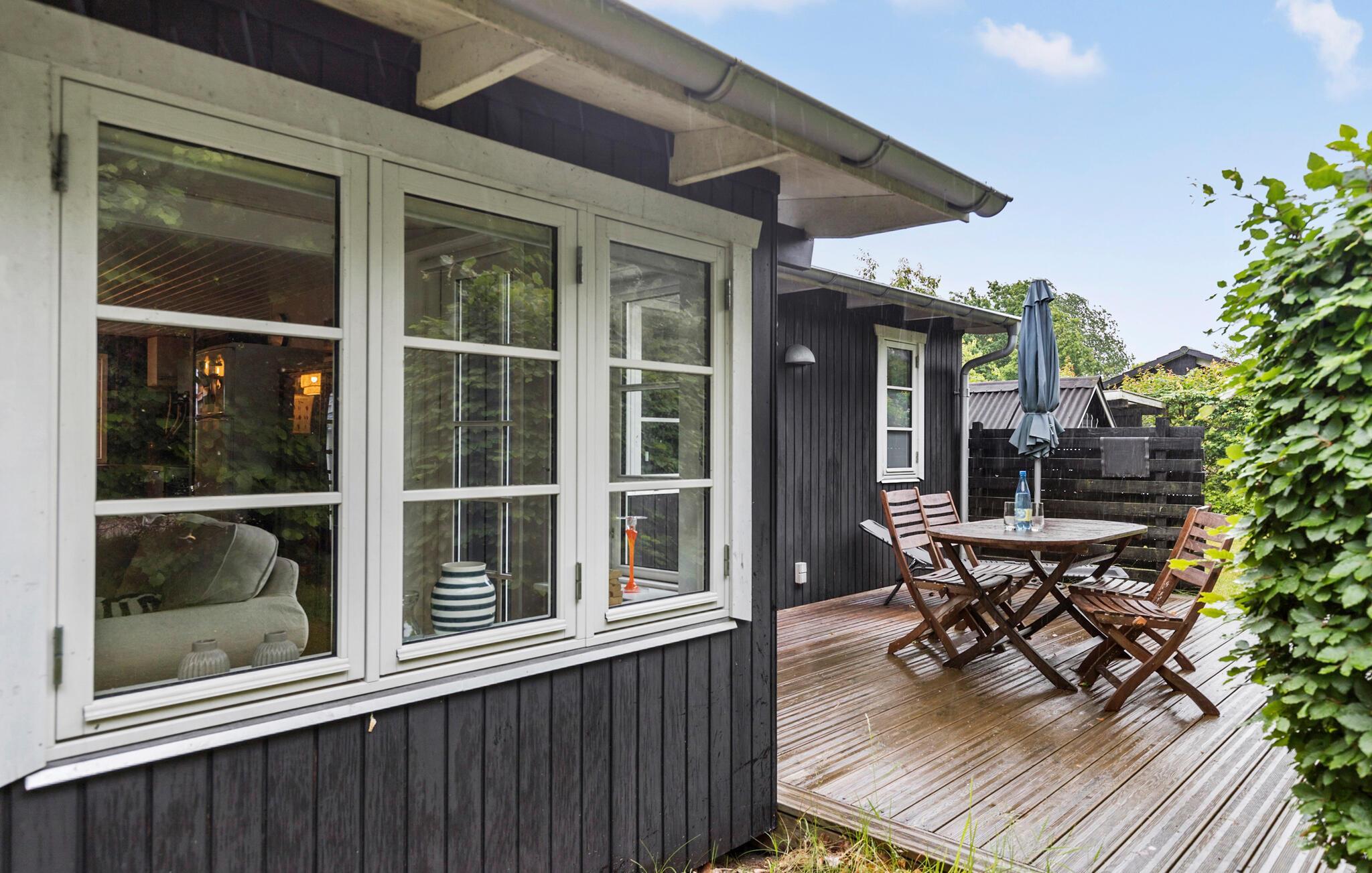 Hyggeligt feriehus ved Ebeltoft Bugt med charme, brændeovn, projektor og to terrasser nær stranden.