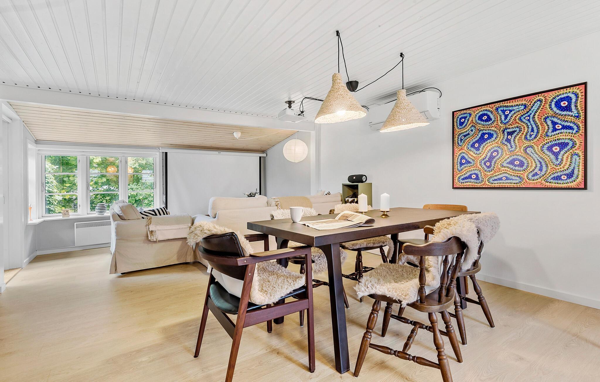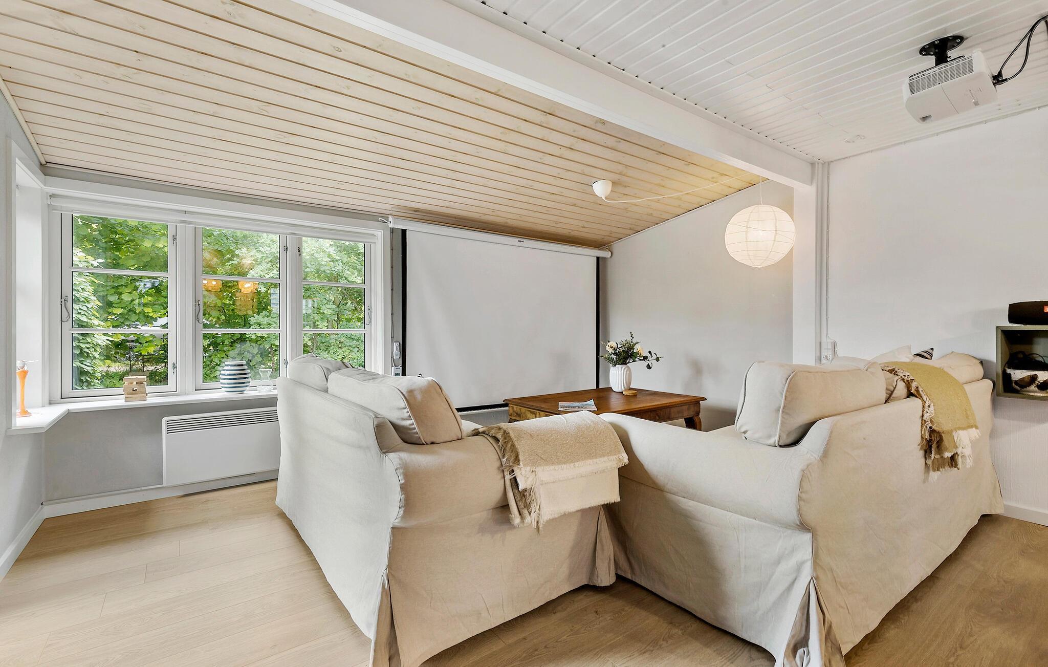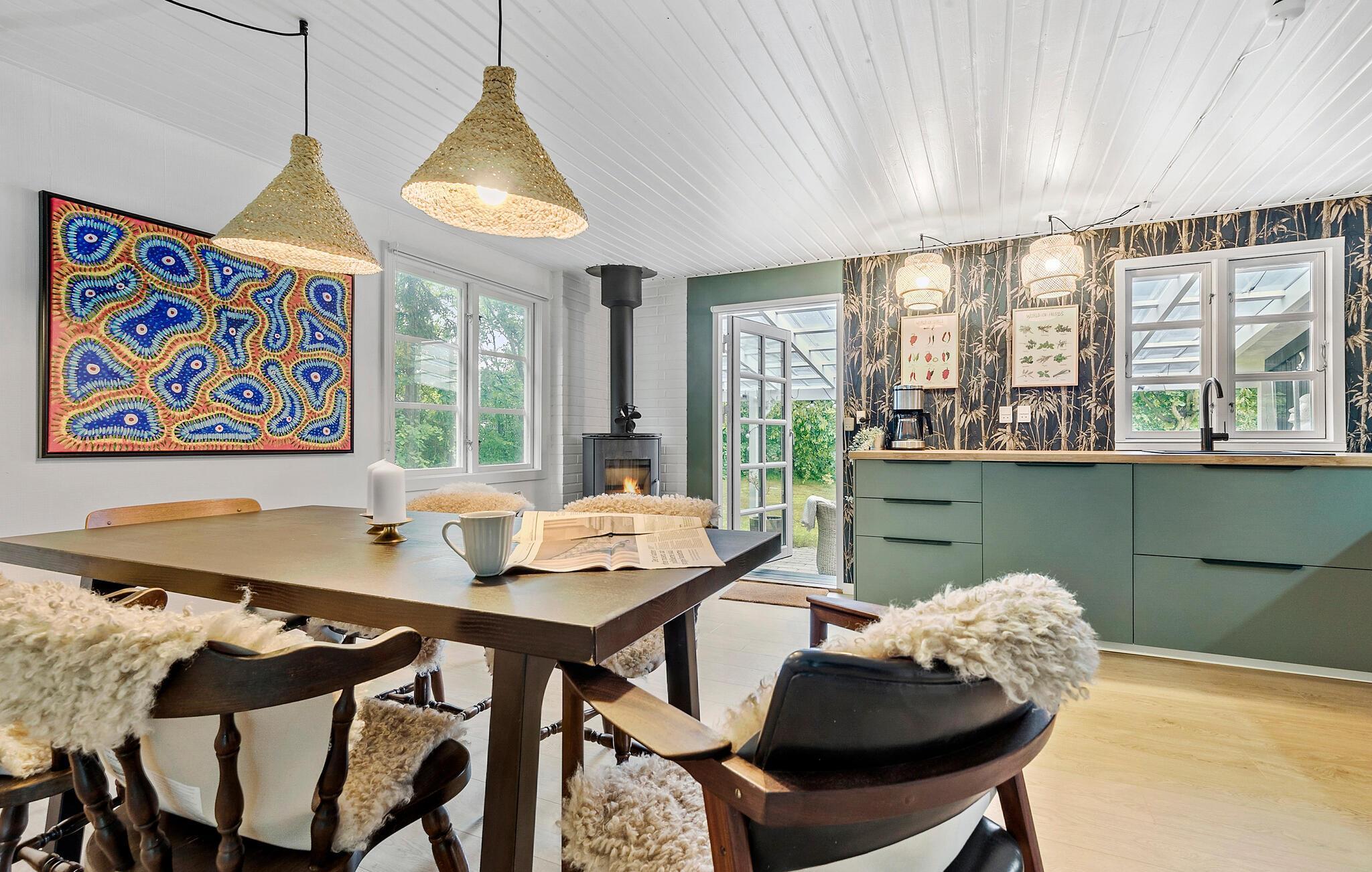 Træd ind, og lad jer fortrylle af husets charme. Smukt design, bløde farver og en indretning, der udstråler hygge, inviterer jer til at slappe af og nyde livet. Tænd op i brændeovnen, og nyd det flotte trædesign i de forskellige rum. Hyg jer i sofaen om aftenen, og brug projektoren til underholdende filmaftener. Husk at medbringe en computer til formålet. Ellers kan I også arrangere spilleaftener ved spisebordet.