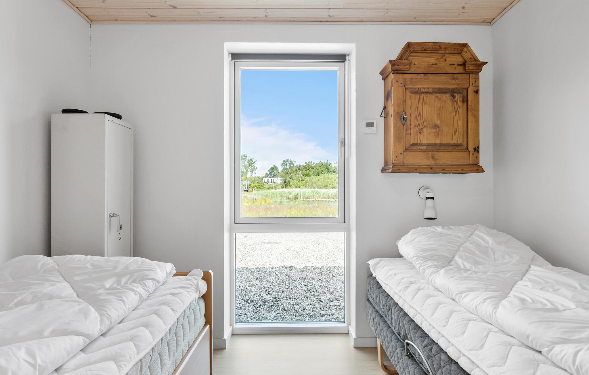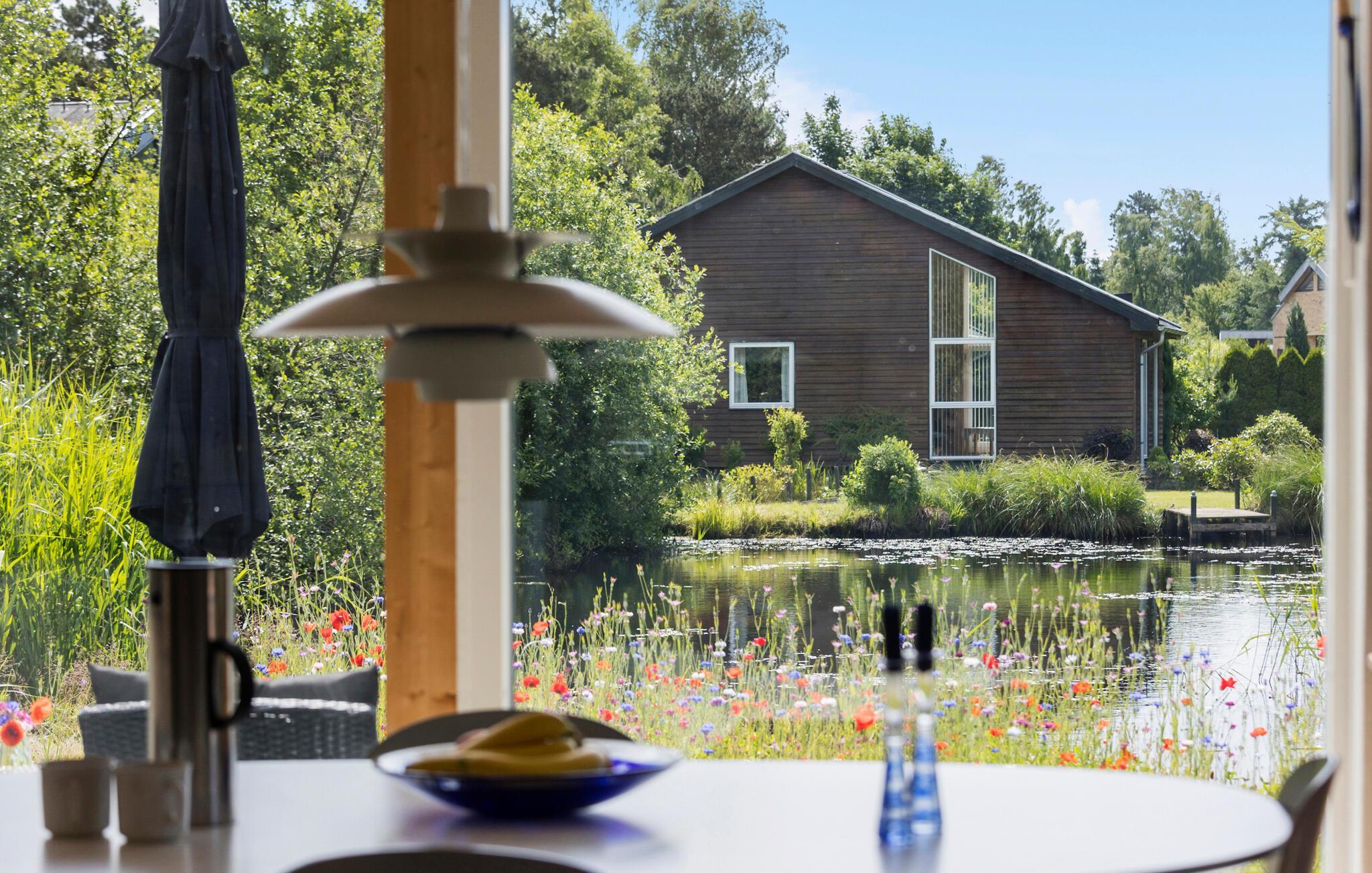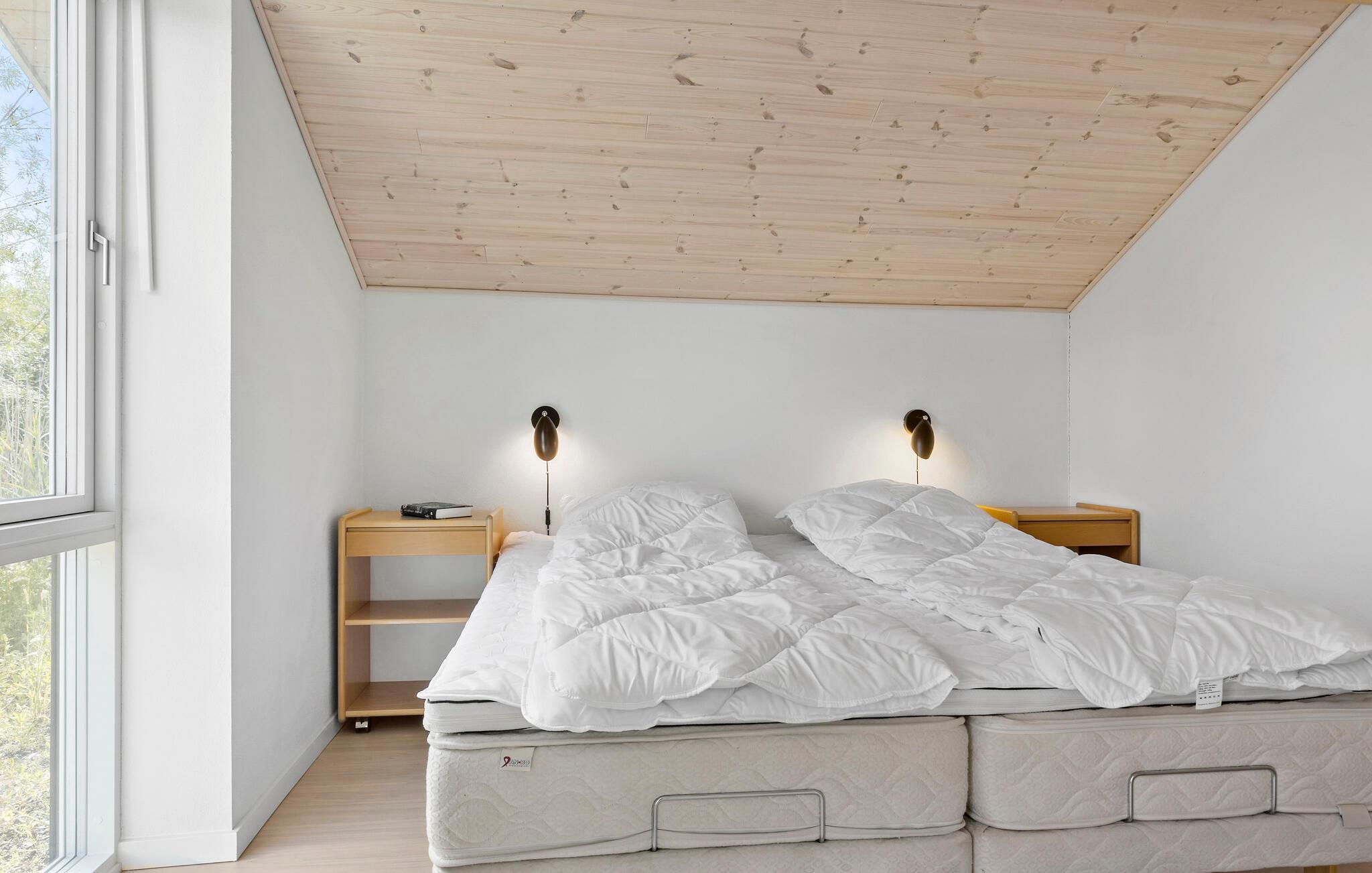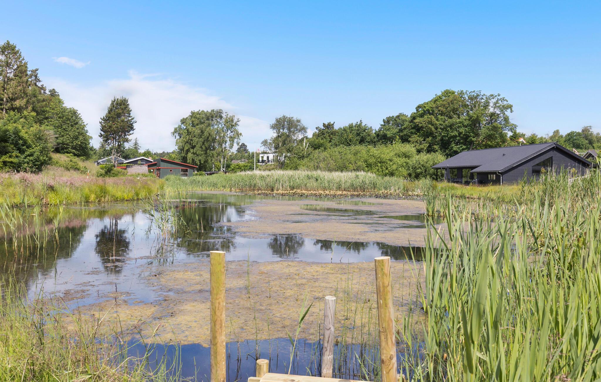 Velkommen til dette moderne sommerhus, som tilbyder jer alle de faciliteter, I har brug for til et afslappende ophold. Huset er åbent og behageligt indrettet med lyse træsorter, og der emmer af ro i det store fællesrum, hvor lyset falder ind fra flere sider. Læn jer tilbage i sofaerne efter dagens program og giv jer god tid til ferieretterne i det moderne veludstyrede køkken. Dæk op til dagens måltider ved det elegante spisebord og nyd udsigten til den grønne have, hvor der også er en dam samt vilde blomster om sommeren.