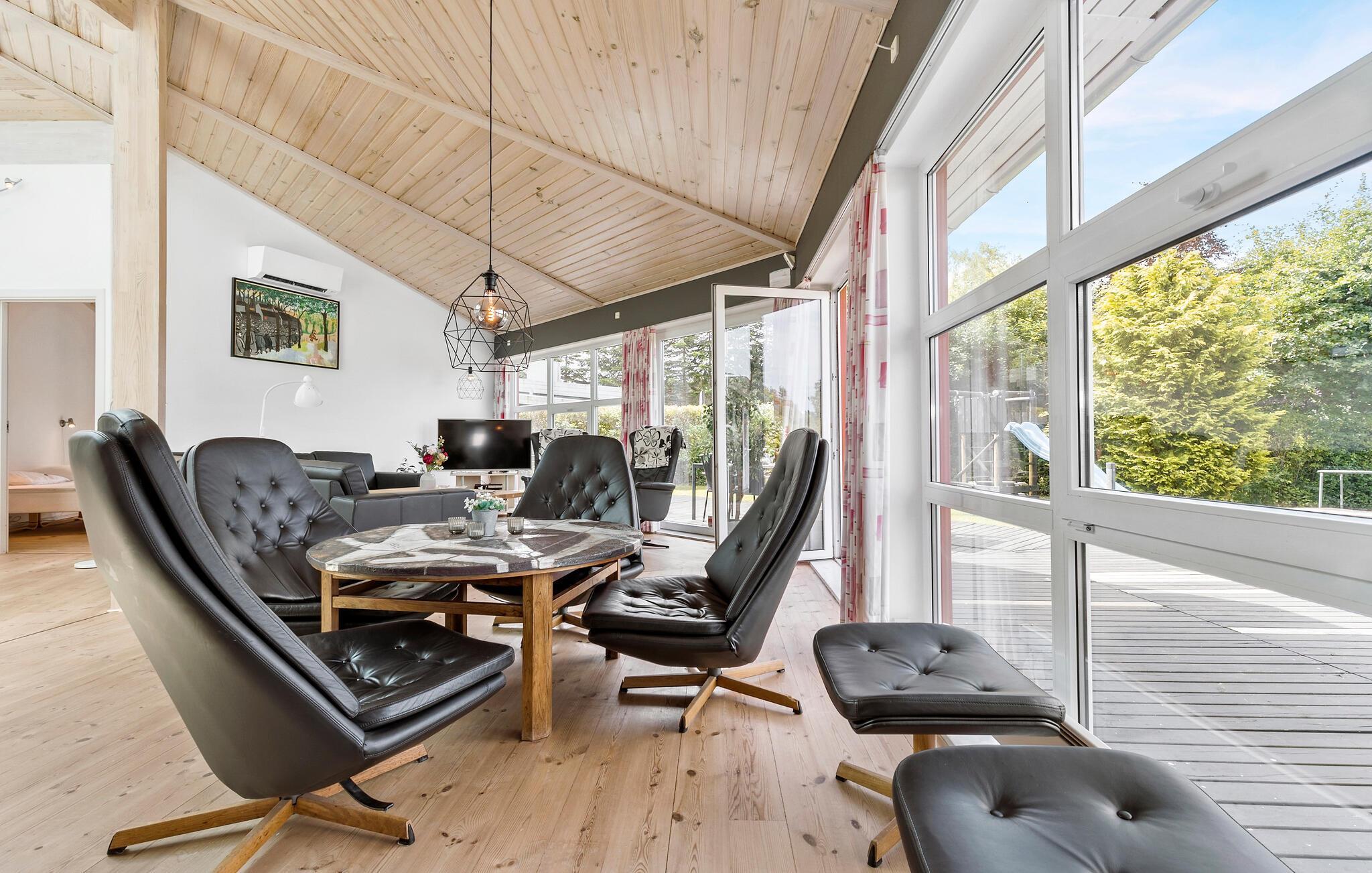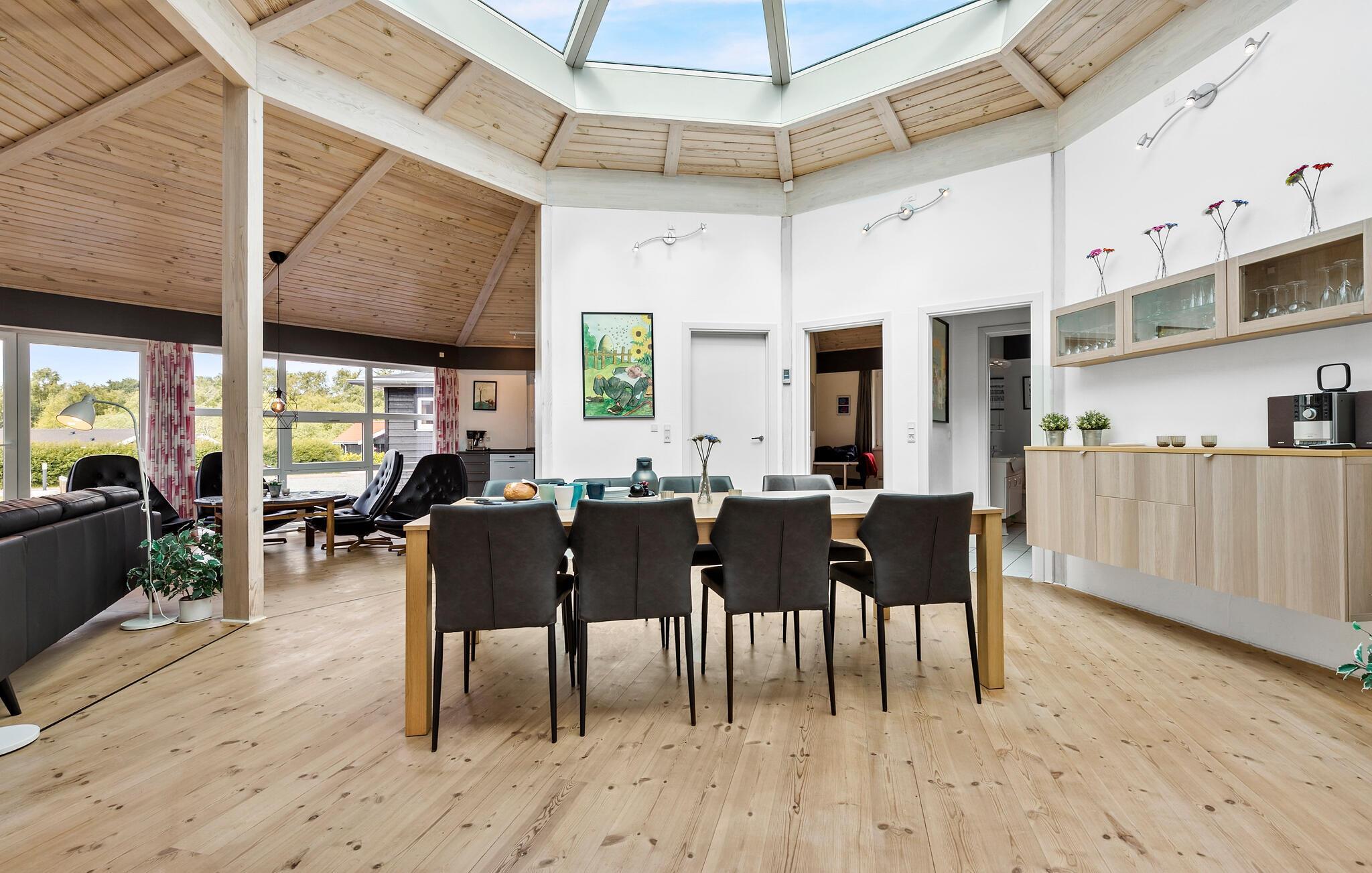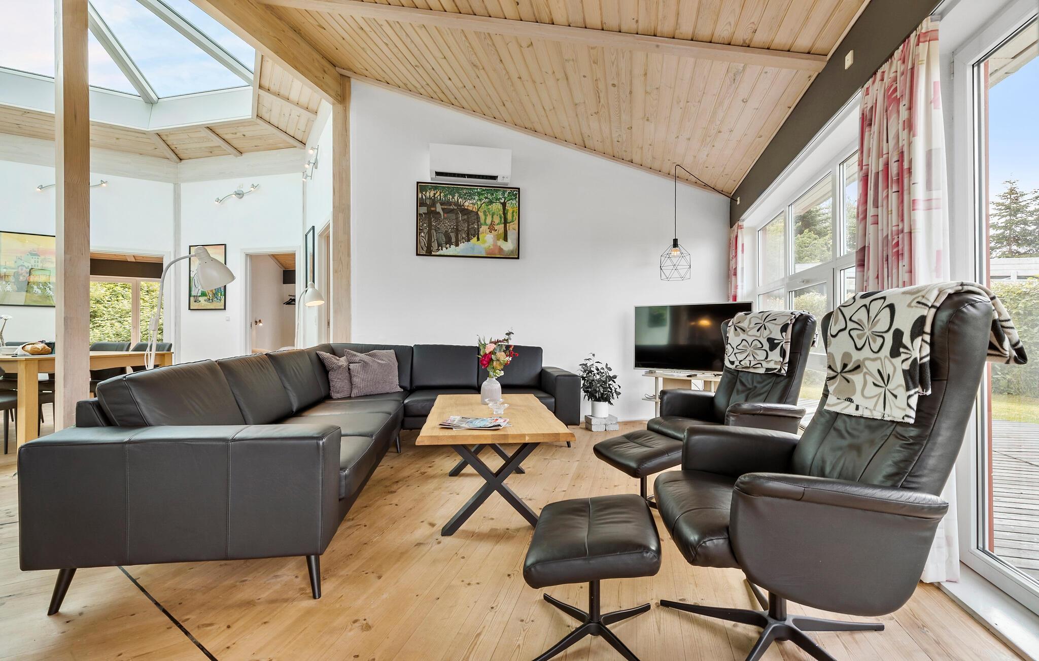 Når I ankommer til denne arkitektoniske perle af et hus ved Ebeltoft Strand, vil I straks lægge mærke til den særlige udformning med et panorama-tagvindue i husets midte, som fylder de indbydende rum med naturligt lys. Det komfortable interiør, inklusiv et veludstyret køkken, indbyder til afslapning. Om aftenen kan I slappe af i saunaen eller spabadet og nyde hyggelige aftener i den store og åbne stue. Et anneks med et spændende aktivitetsrum og en terrasse samt en legeplads i haven tilbyder underholdning for både store og små.