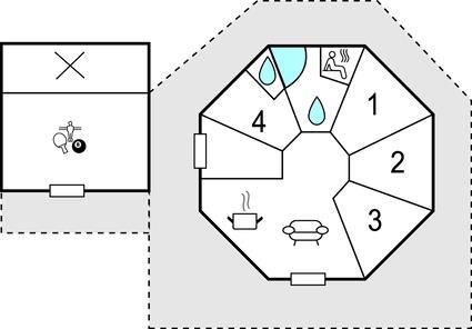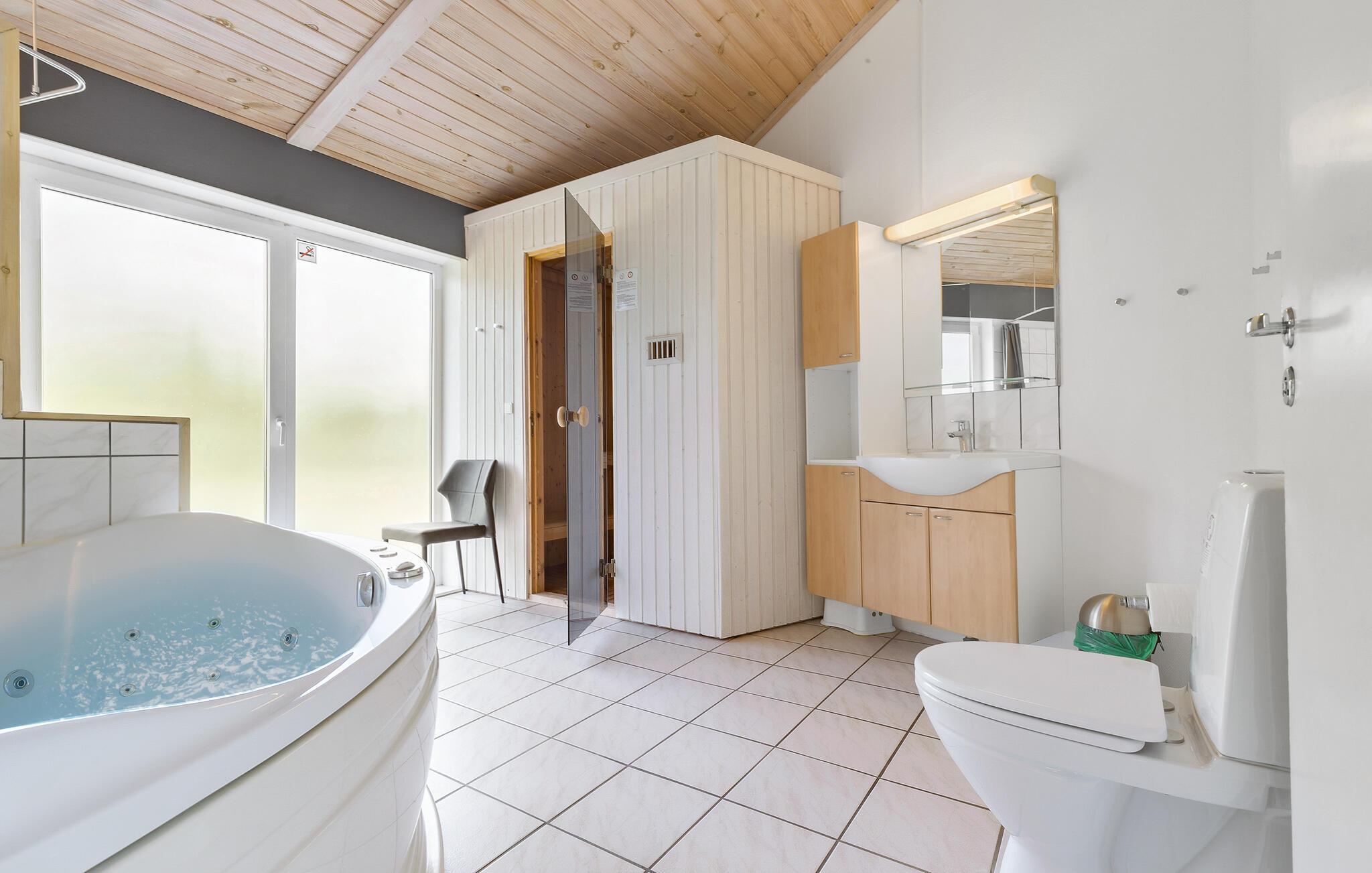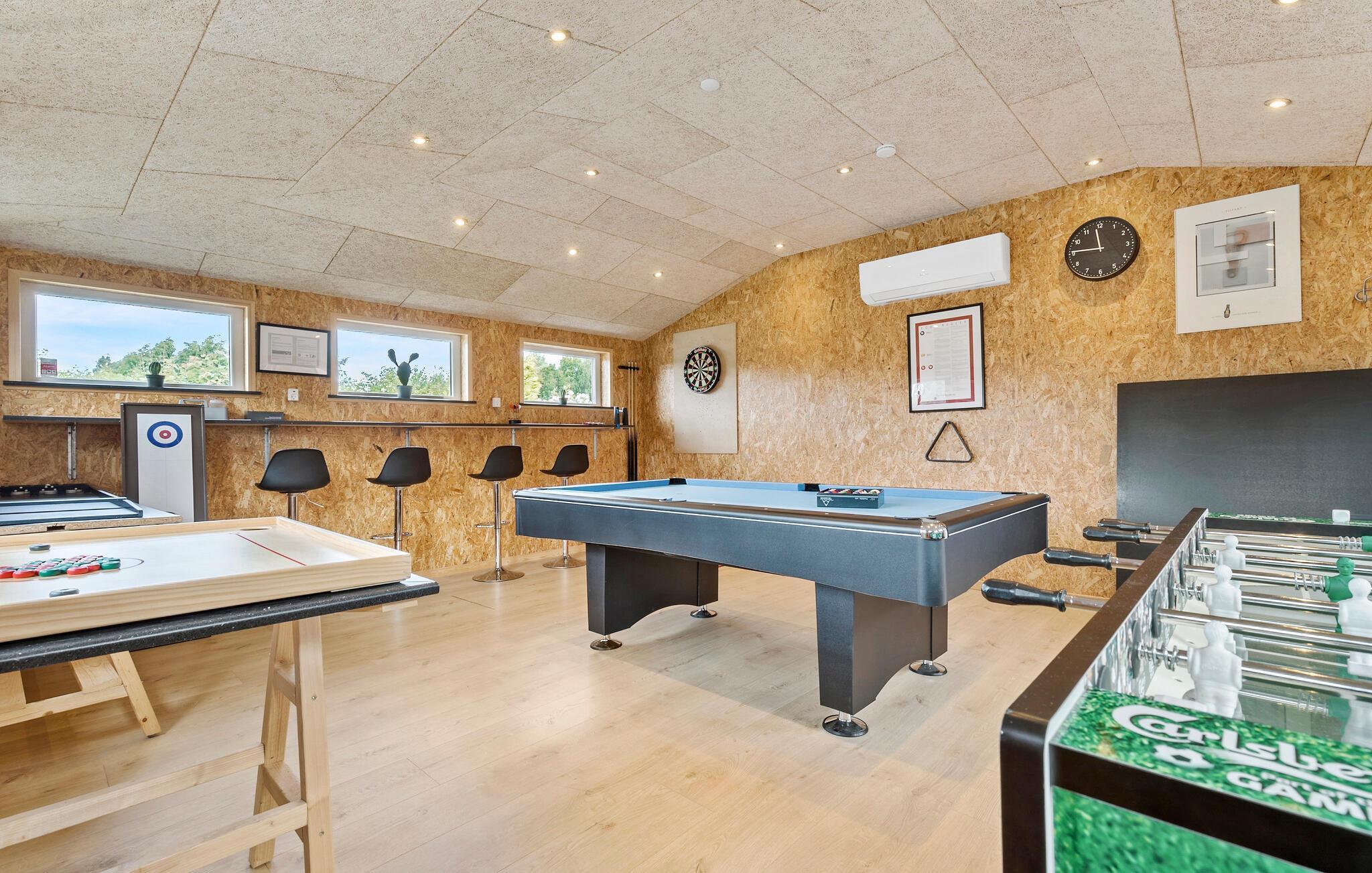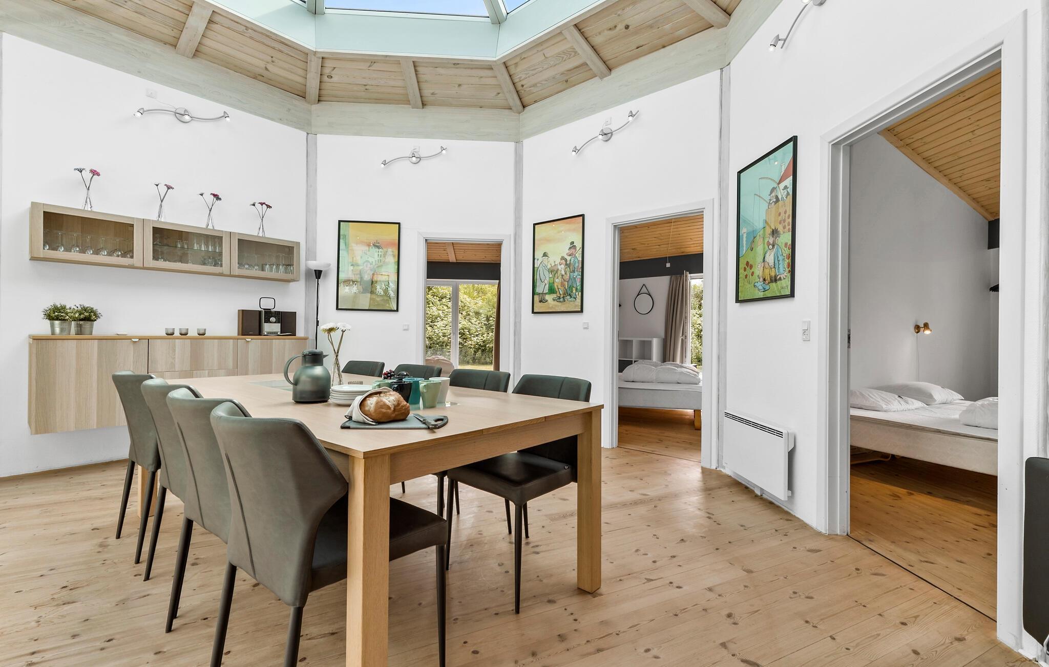 Når I ankommer til denne arkitektoniske perle af et hus ved Ebeltoft Strand, vil I straks lægge mærke til den særlige udformning med et panorama-tagvindue i husets midte, som fylder de indbydende rum med naturligt lys. Det komfortable interiør, inklusiv et veludstyret køkken, indbyder til afslapning. Om aftenen kan I slappe af i saunaen eller spabadet og nyde hyggelige aftener i den store og åbne stue. Et anneks med et spændende aktivitetsrum og en terrasse samt en legeplads i haven tilbyder underholdning for både store og små.