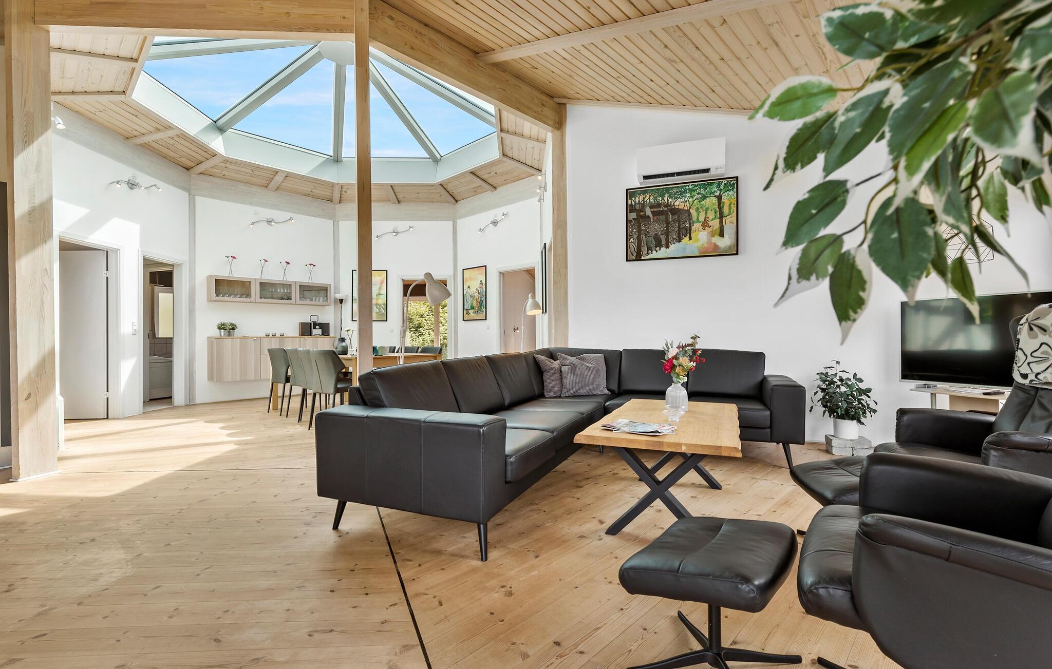 Oplev dette unikke pavillonhus ved Ebeltoft Strand med panorama-tagvindue, sauna, spabad og aktivitetsrum for hele familien.