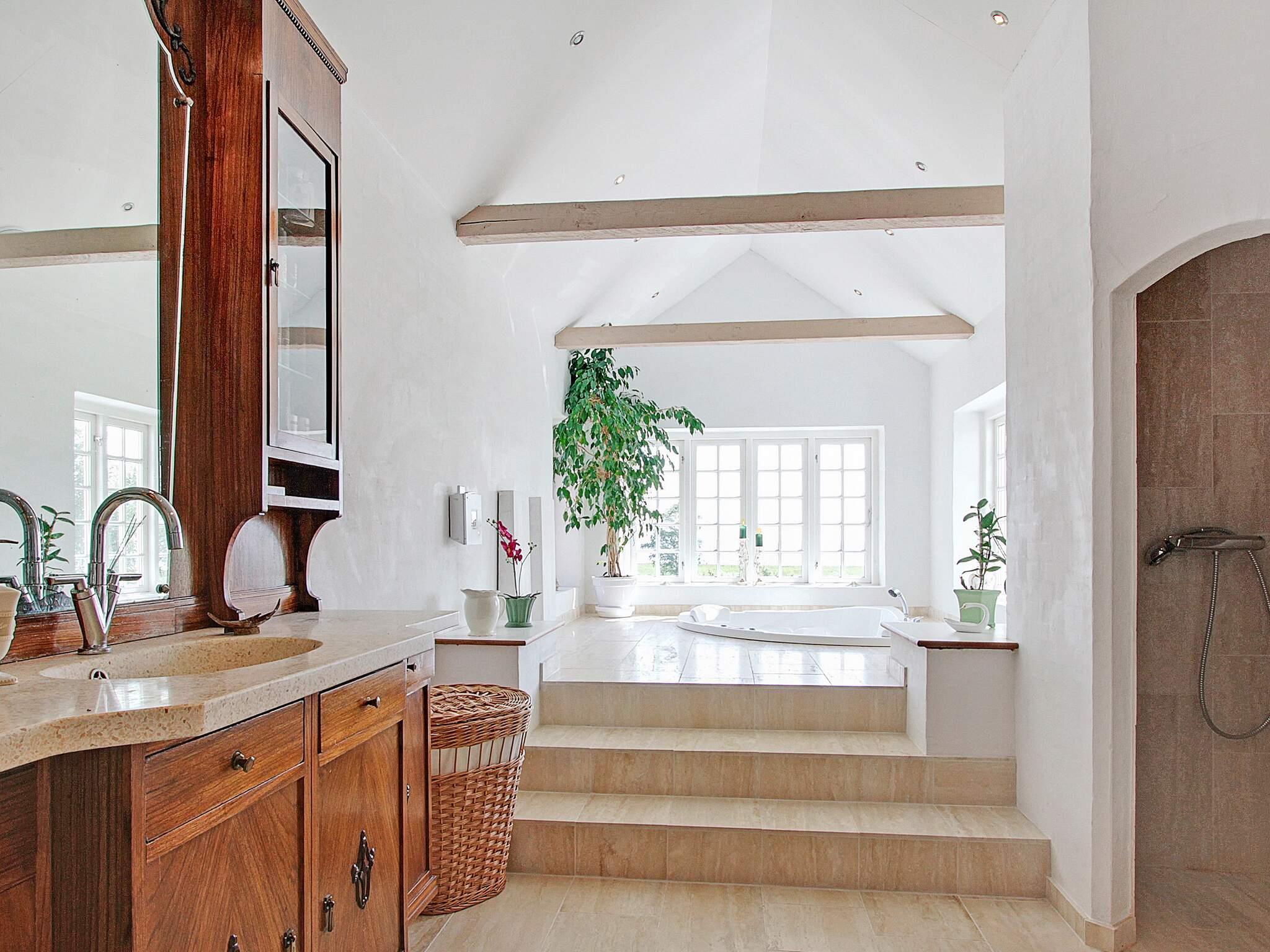 På 1. sal er der tre store soveværelser, et unikt badeværelse med spabad og havudsigt samt en stor stue med mange hyggekroge samt udgang til en østvendt tagterrasse og hems samt aktivitetsrum med bl.a. poolbord.