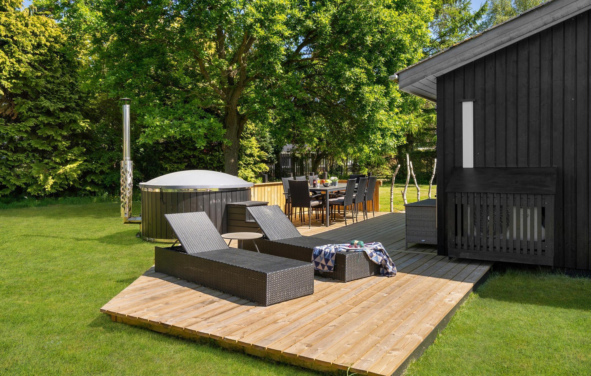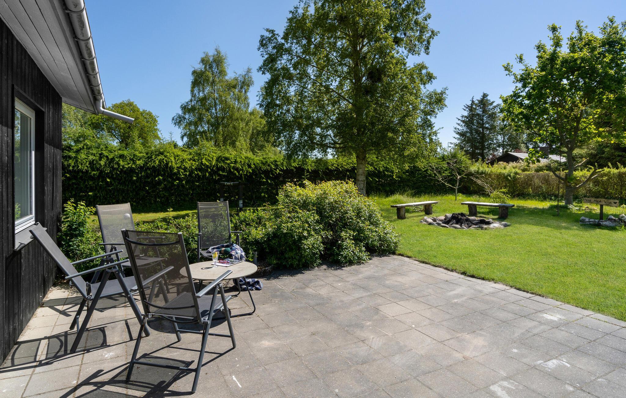 Huset ligger i en smuk have med et grønt område og flere gamle træer. Sæt jer til rette i havemøblerne, mens børnene leger i sandkassen eller på trampolinen, eller bag snobrød ved bålet. Efter en dag i den friske luft vil vildmarksbadet være det perfekte sted at slutte dagen af.
