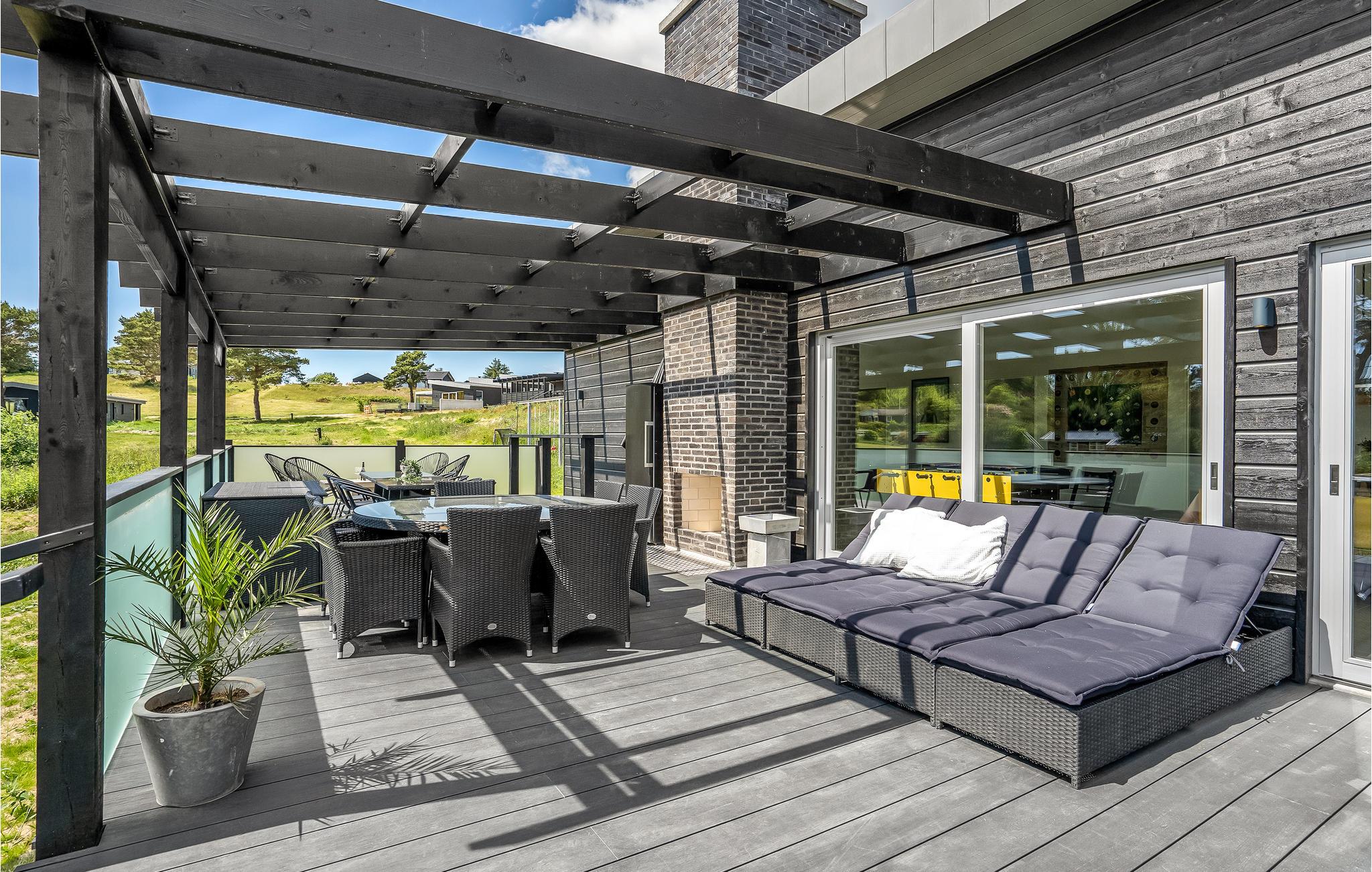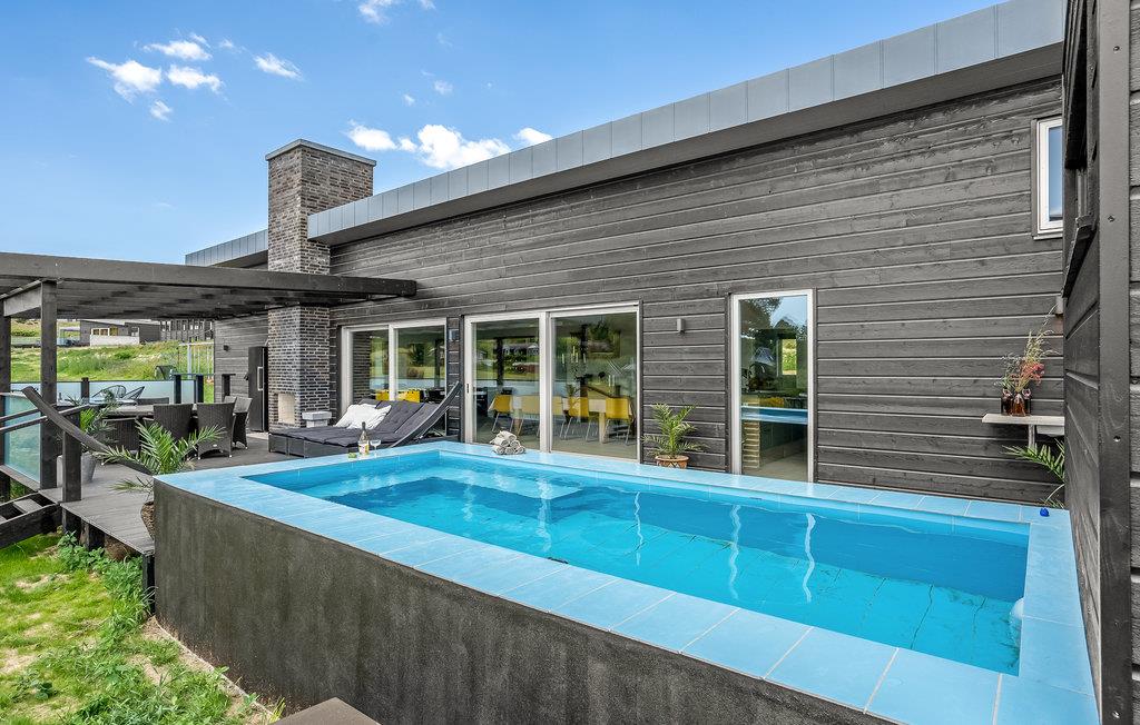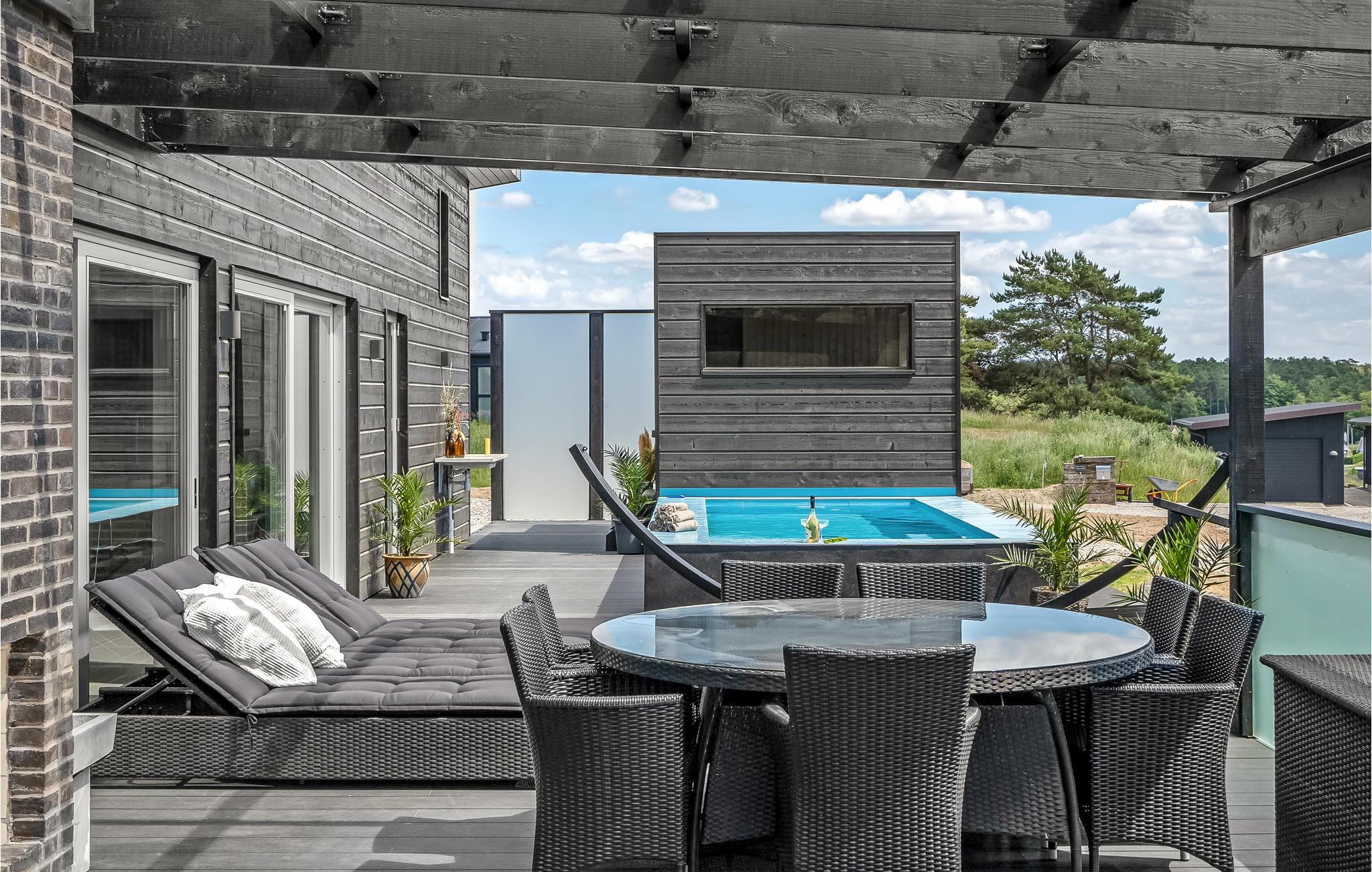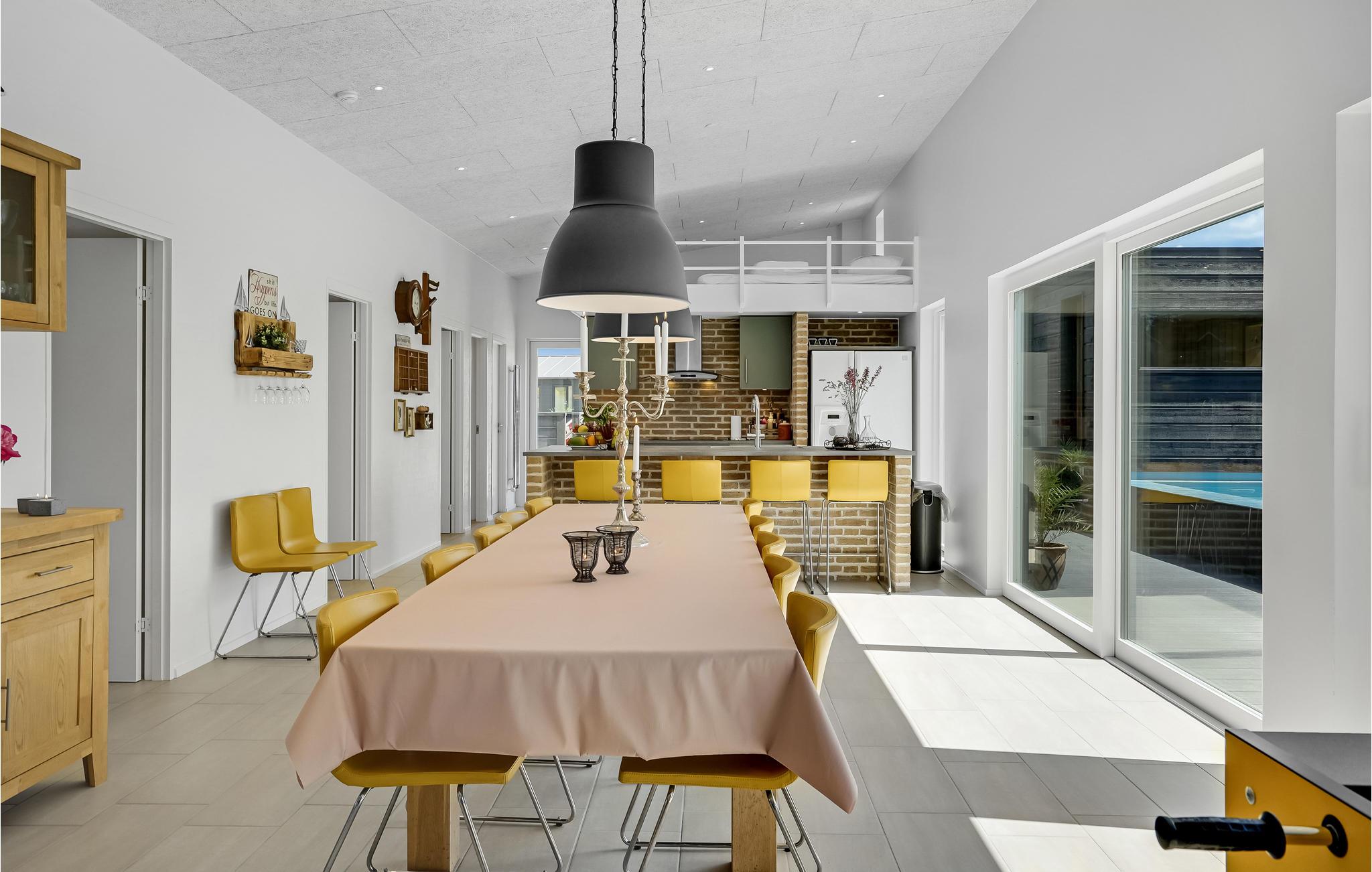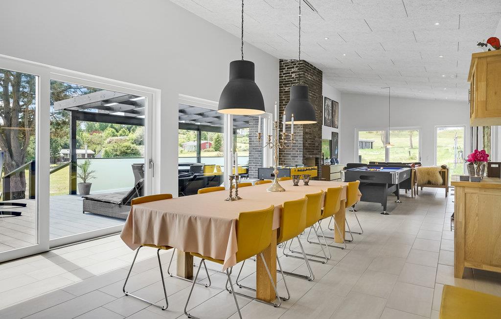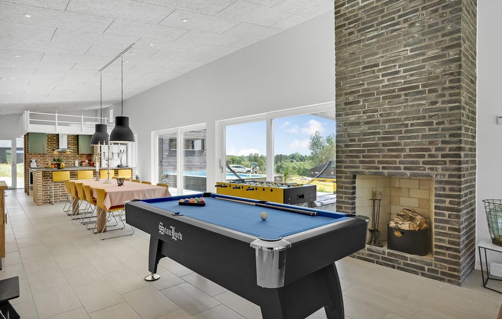 Toplækkert, rummeligt sommerhus ved Egsmark Strand med opvarmet pool, sauna og aktivitetsrum – perfekt til familie og hund.