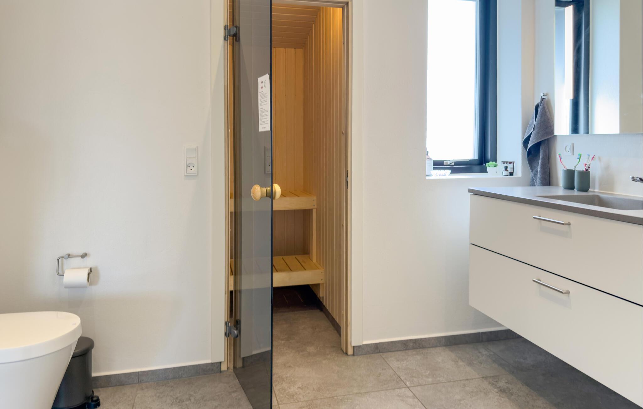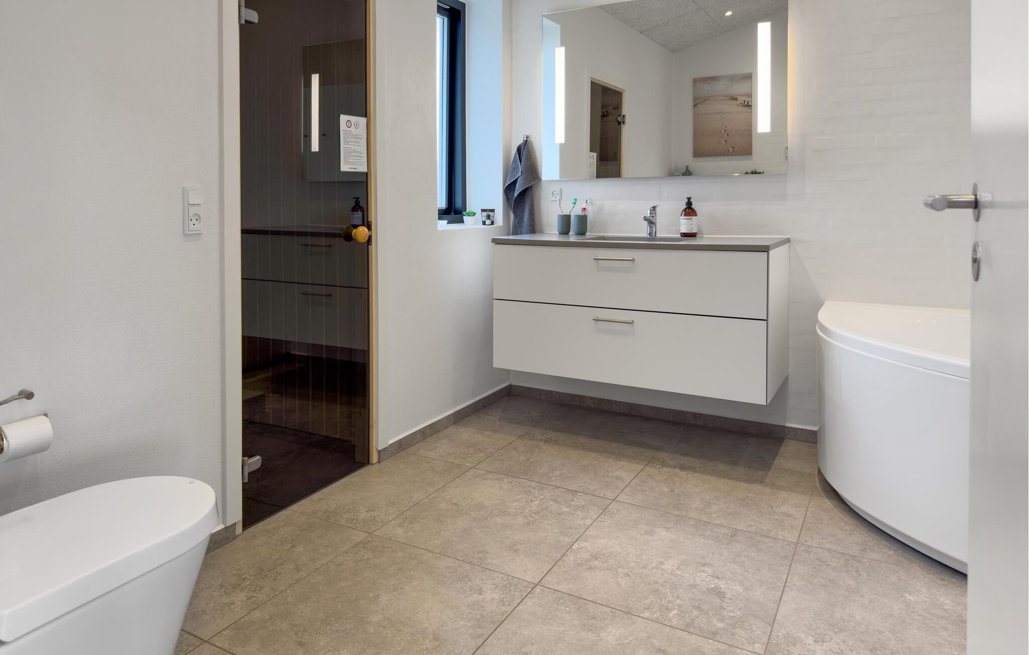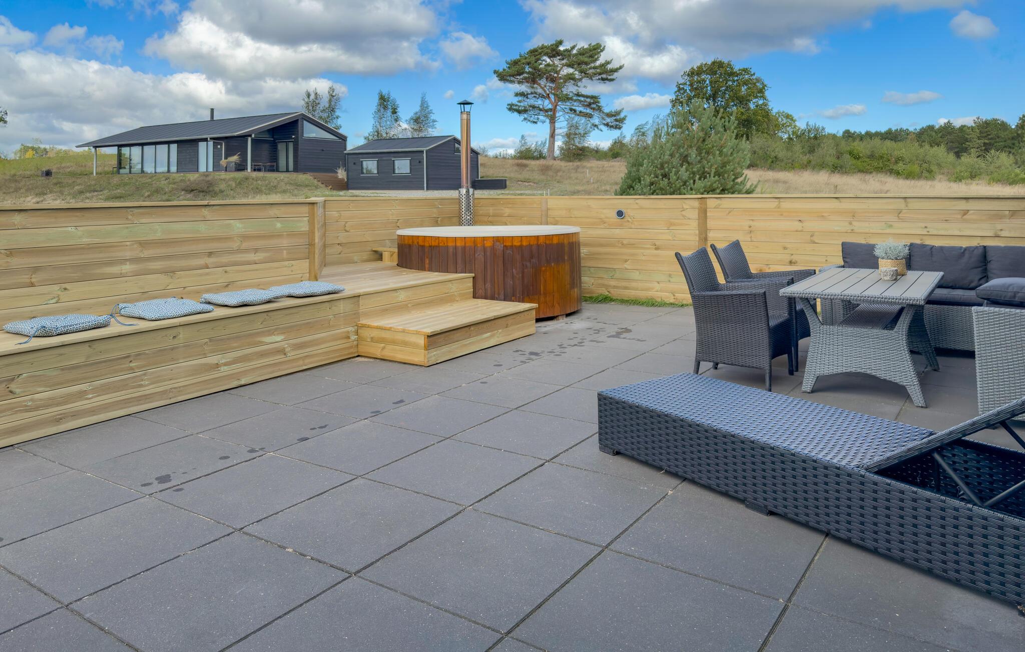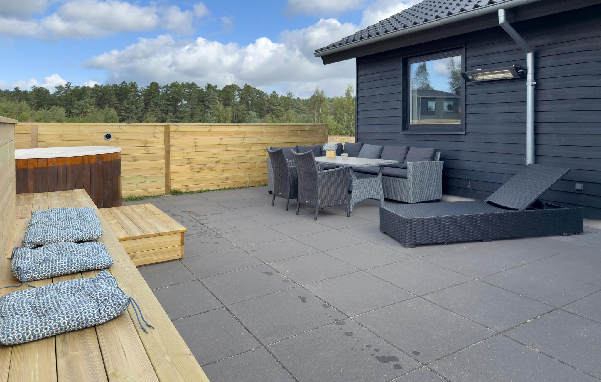 Huset har flere dejlige terrasser, så I kan følge solen hele dagen – fra morgenkaffen på den rolige terrasse til grillhygge og solnedgang på den store åbne terrasse. Børn kan more sig i sandkassen og på gyngen, mens de voksne nyder roen og udsigten over det flotte kuperede område. I kan også sætte jer til rette i vildmarksbadet under åben himmel eller nyde varmen i saunaen.