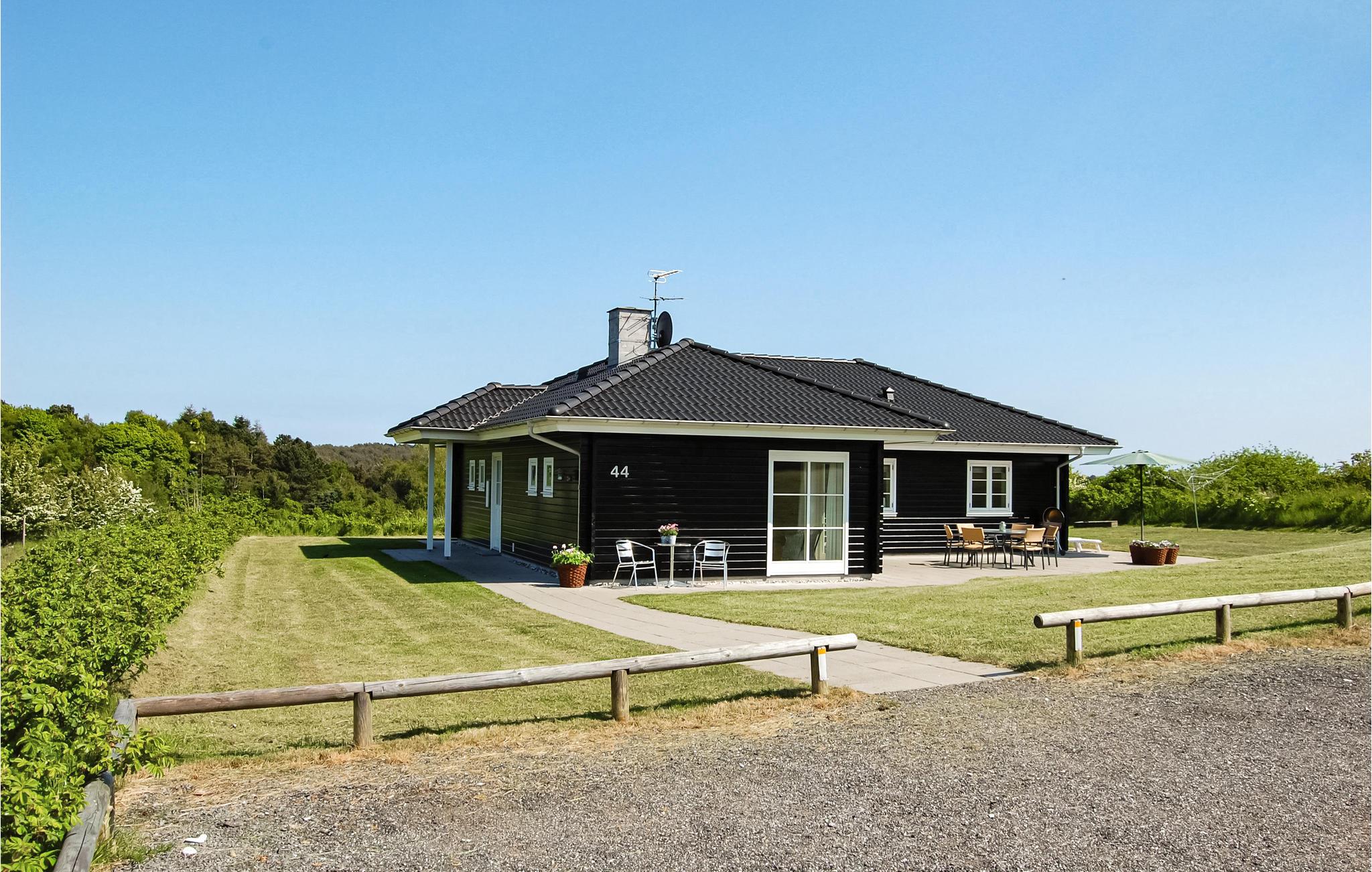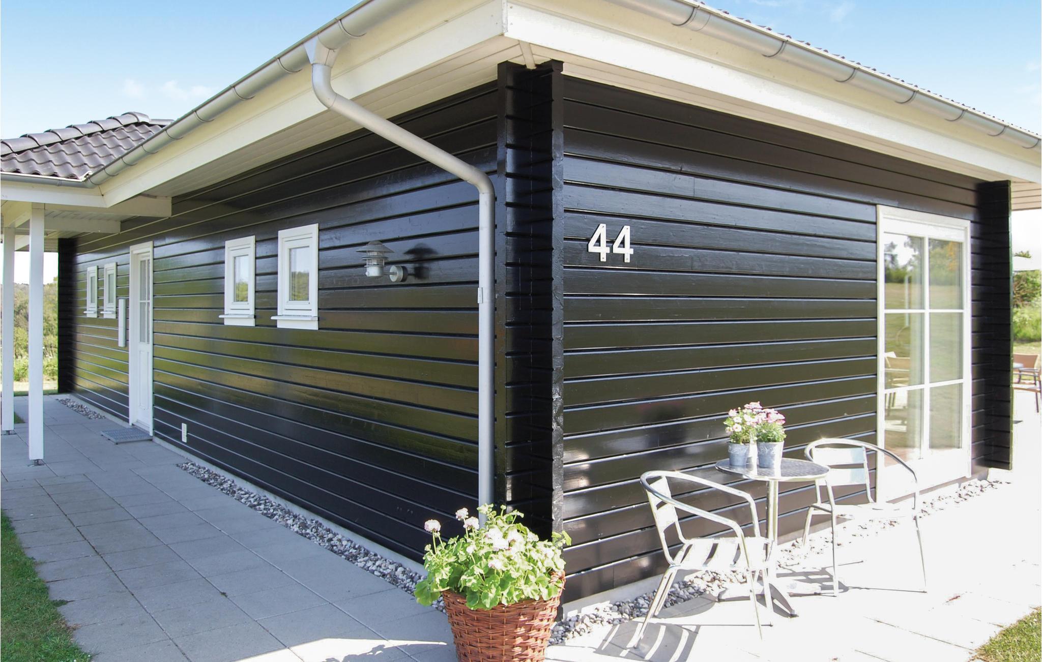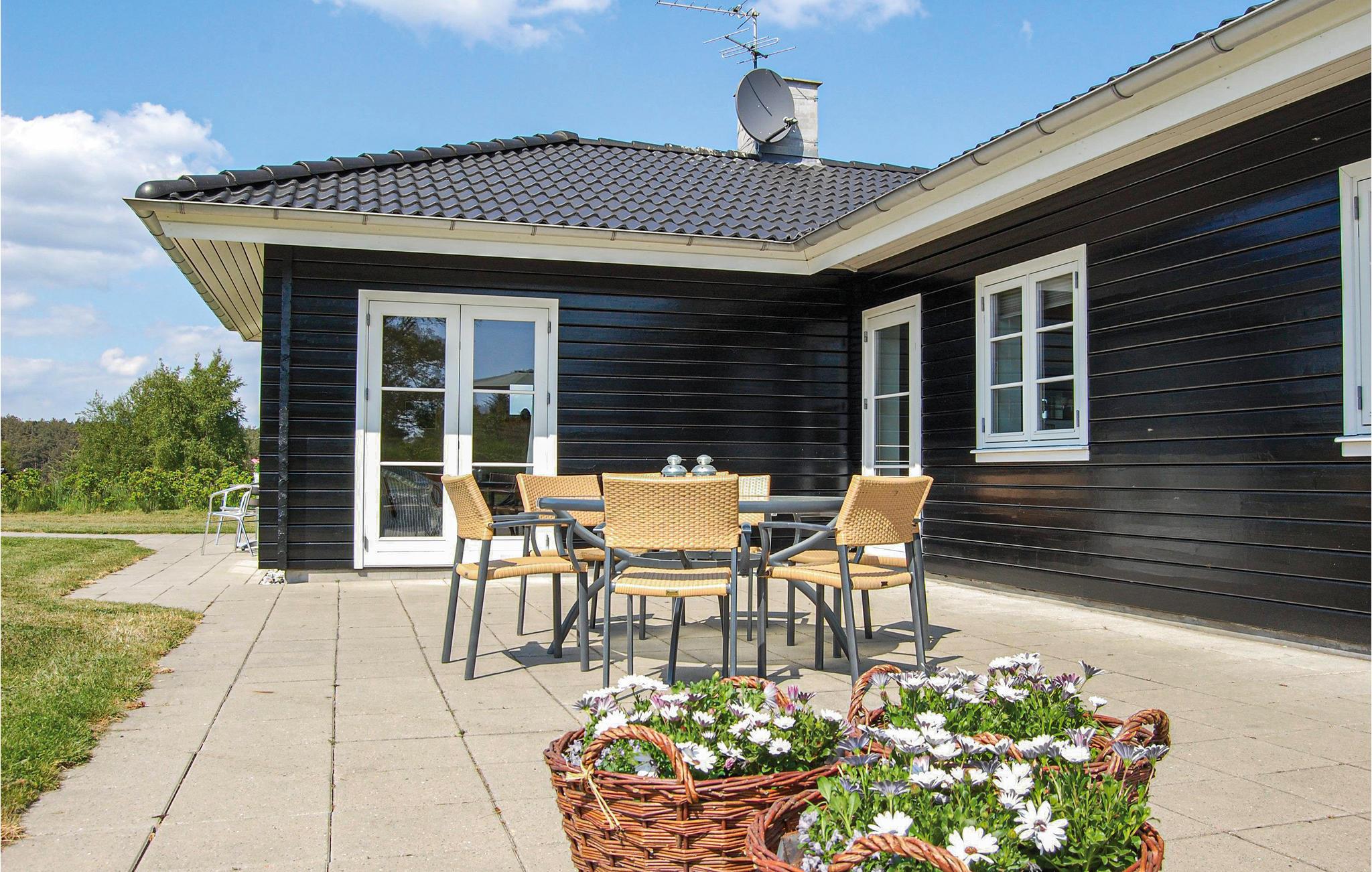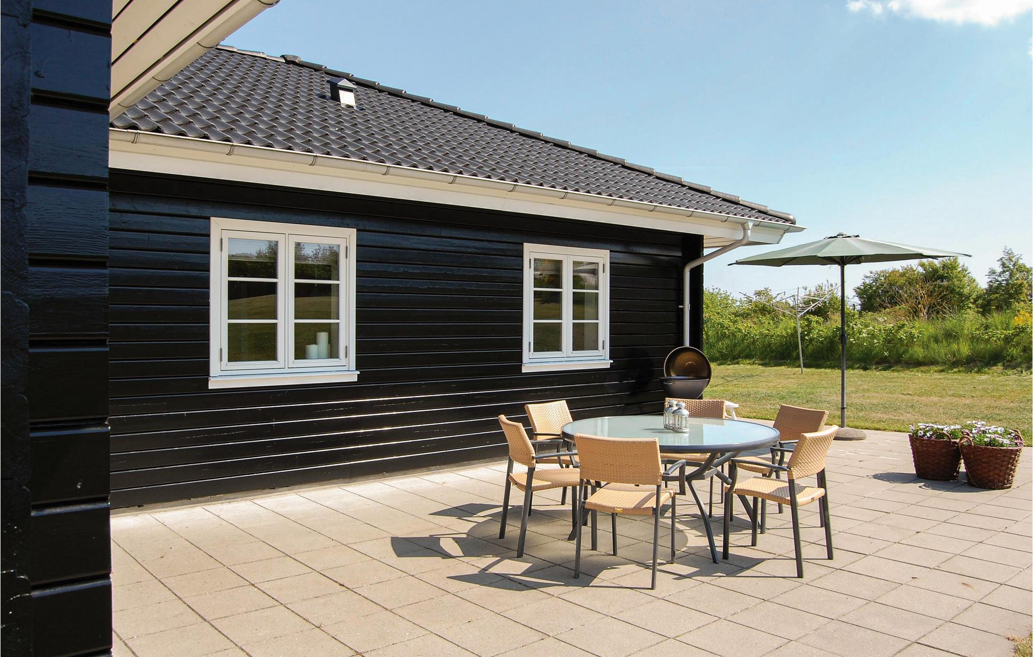 Flot energivenligt fritidshus nær strand og Ebeltoft, med stor terrasse og aktivitetsmuligheder for børn.