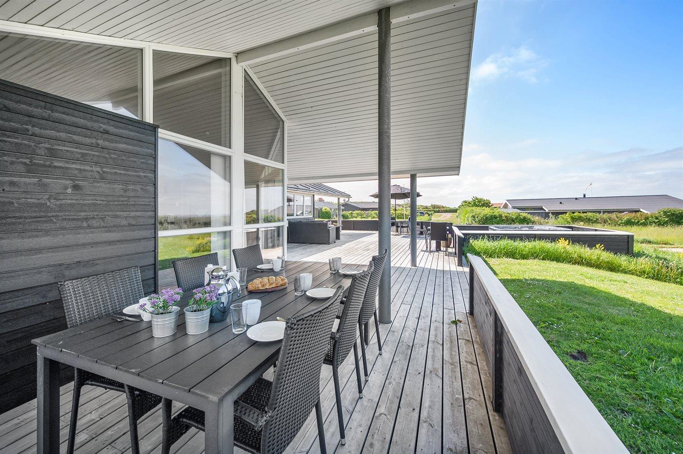 Ferieboligen er beliggende på en 1044 m² stor naturgrund. Der er 150 m til fjorden. Nærmeste forretning er beliggende i en afstand af 2000 m. Til ferieboligen hører 170 m² terrasseareal. Desuden er der 30 m² overdækket terrasse. Der er redskabsrum. Petanque. Der er installeret stik til opladning af elbil. Type 2 stik. Med 11 kW ladeeffekt. Parkering ved ferieboligen.