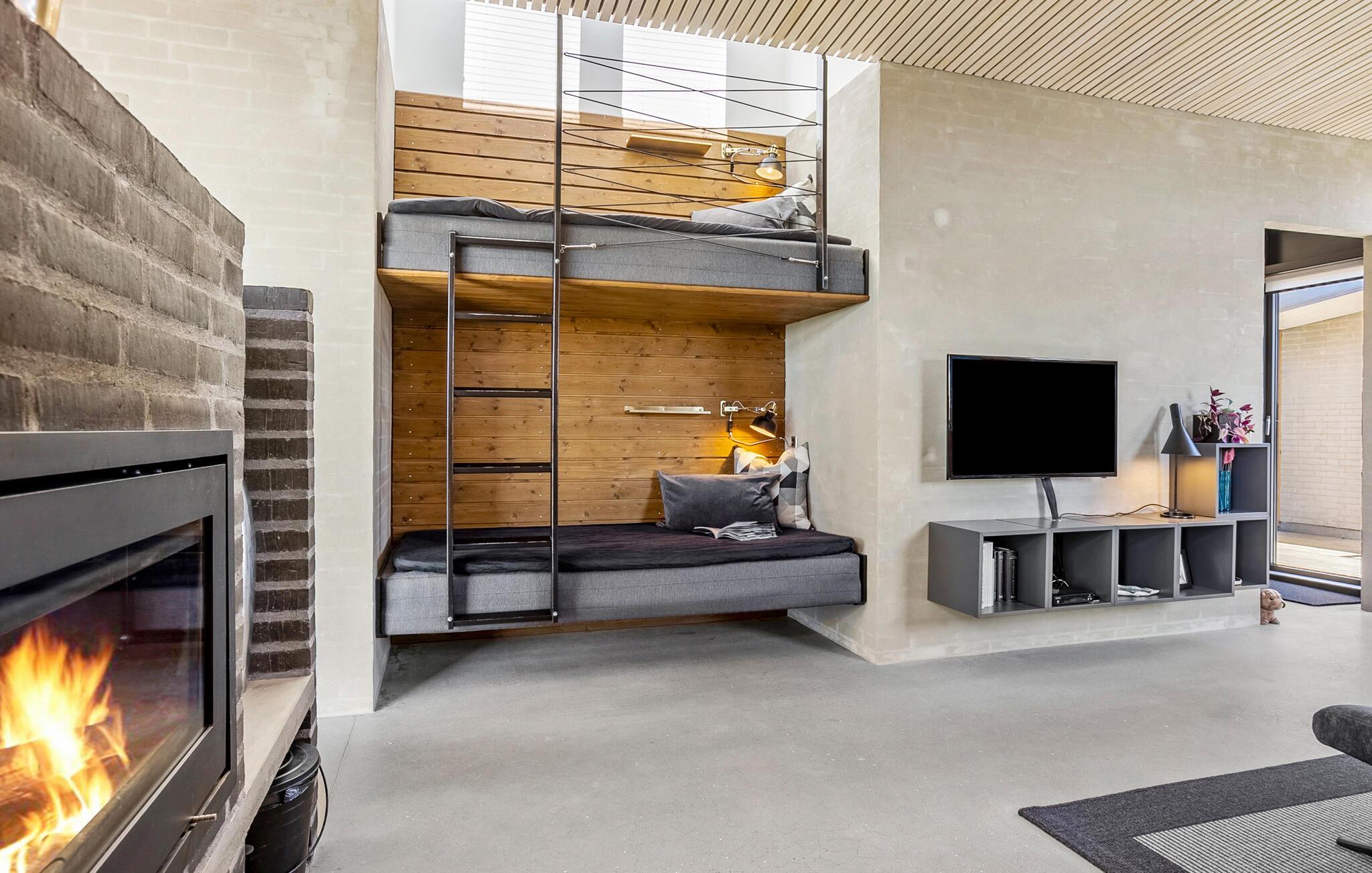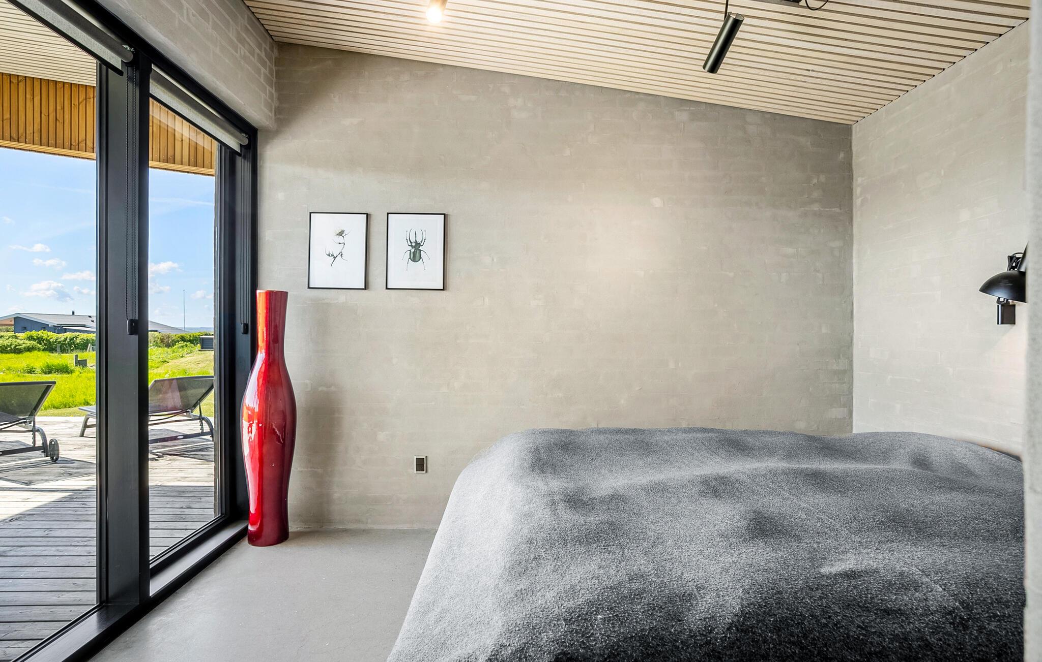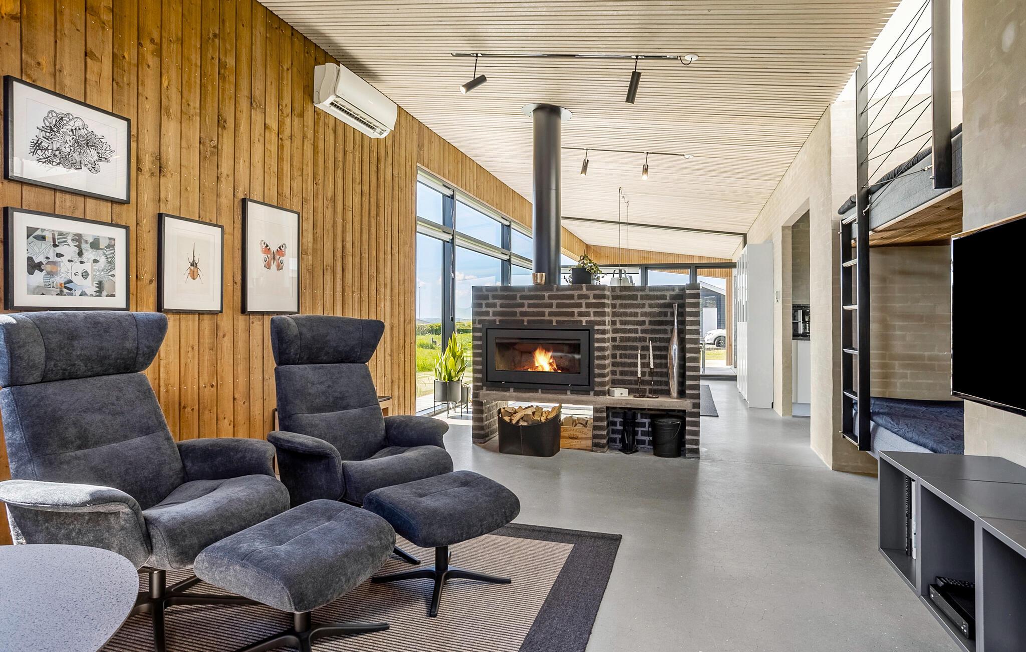 Arkitekttegnet sommerhus med fjordudsigt, store vinduer og privat terrasse ved Ejsingholm Strand.