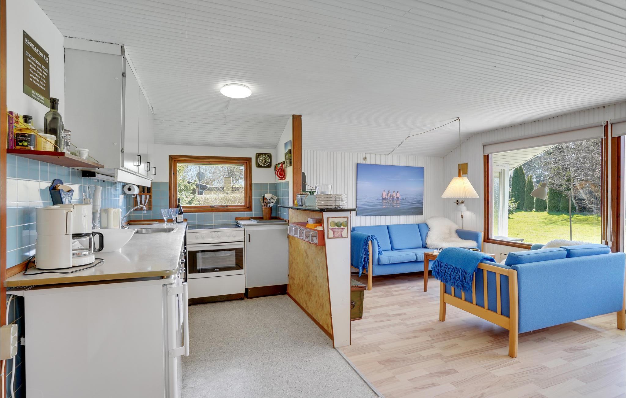 De store vinduer lukker masser af lys ind i huset og sørger samtidig for en smuk udsigt til haven. Indretningen er også lys og venlig og har en dejligt åben indretning med køkkenet i åben forbindelse med stuen. Efter en dag fuld af eventyr kan I sætte jer til rette i sofaerne og nyde den hyggelige varme fra brændeovnen.