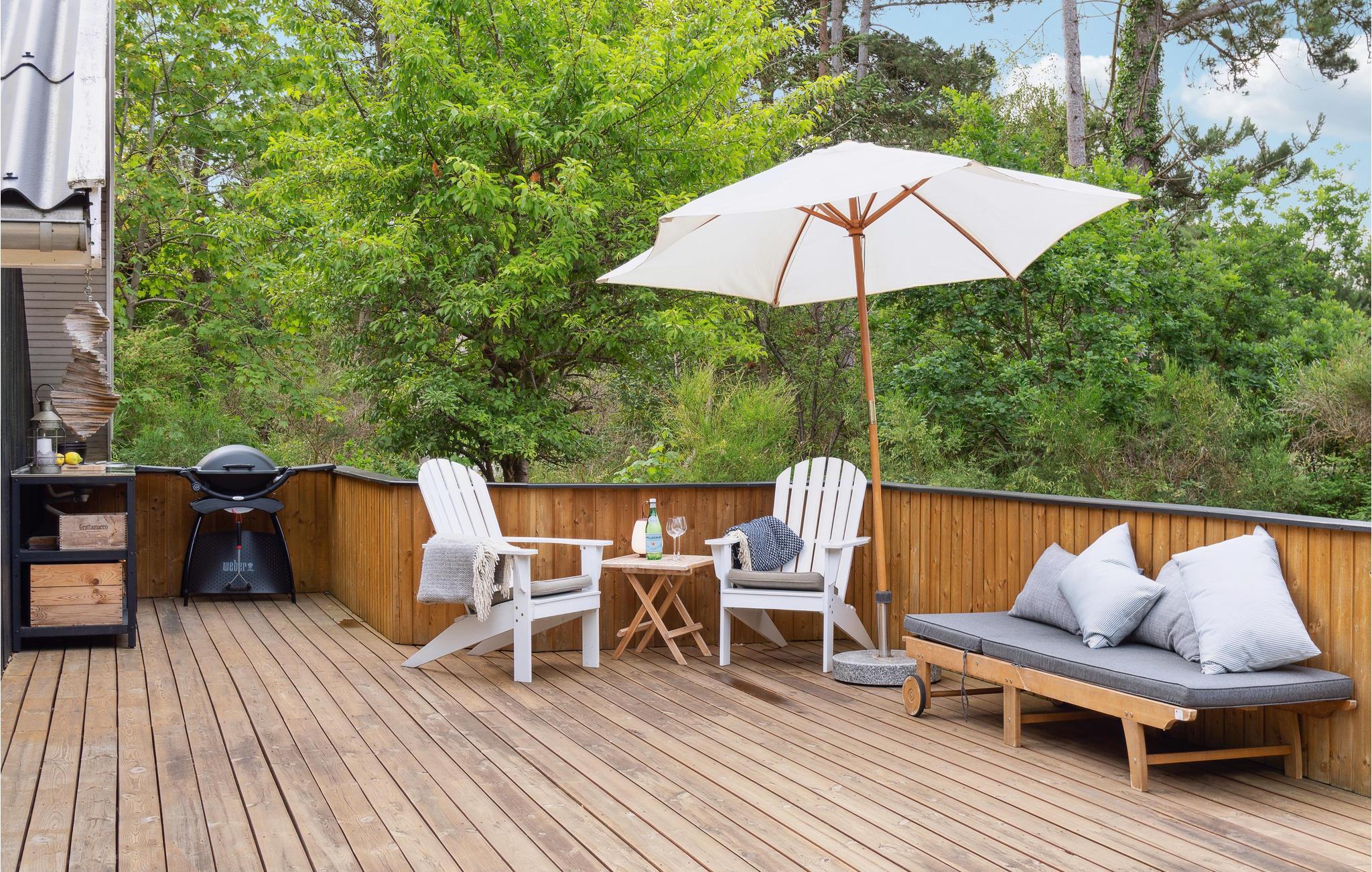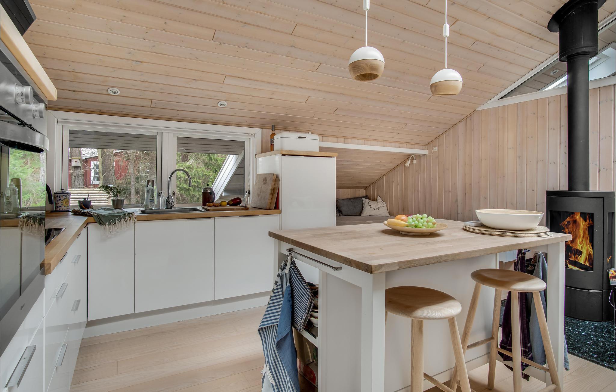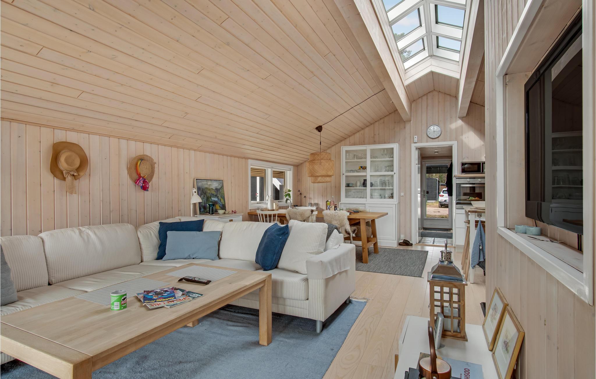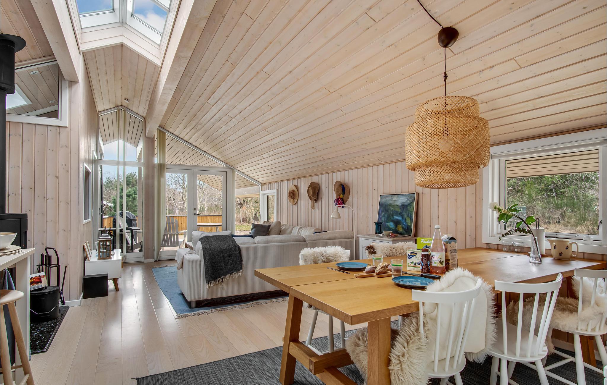 Der er fred og idyl på denne skønne feriegrund, som ligger omkranset af træer. Boligen er lys og moderne med enkle stilvalg, så her er der gode rammer til at slappe af for hele familien. Nyd dagens måltider ved det lange spisebord, hvor I samtidig kan glæde jer over udsigten til haven. Når I vender hjem efter en lang dag med udflugter og strandliv, kan I læne jer tilbage i stuen og fylde tiden med brætspil, bøger og gode snakke, mens I nyder udsigten til de grønne omgivelser. I kan skrue ekstra op for hyggen og varmen i vinterhalvåret ved at fyre op i brændeovnen.