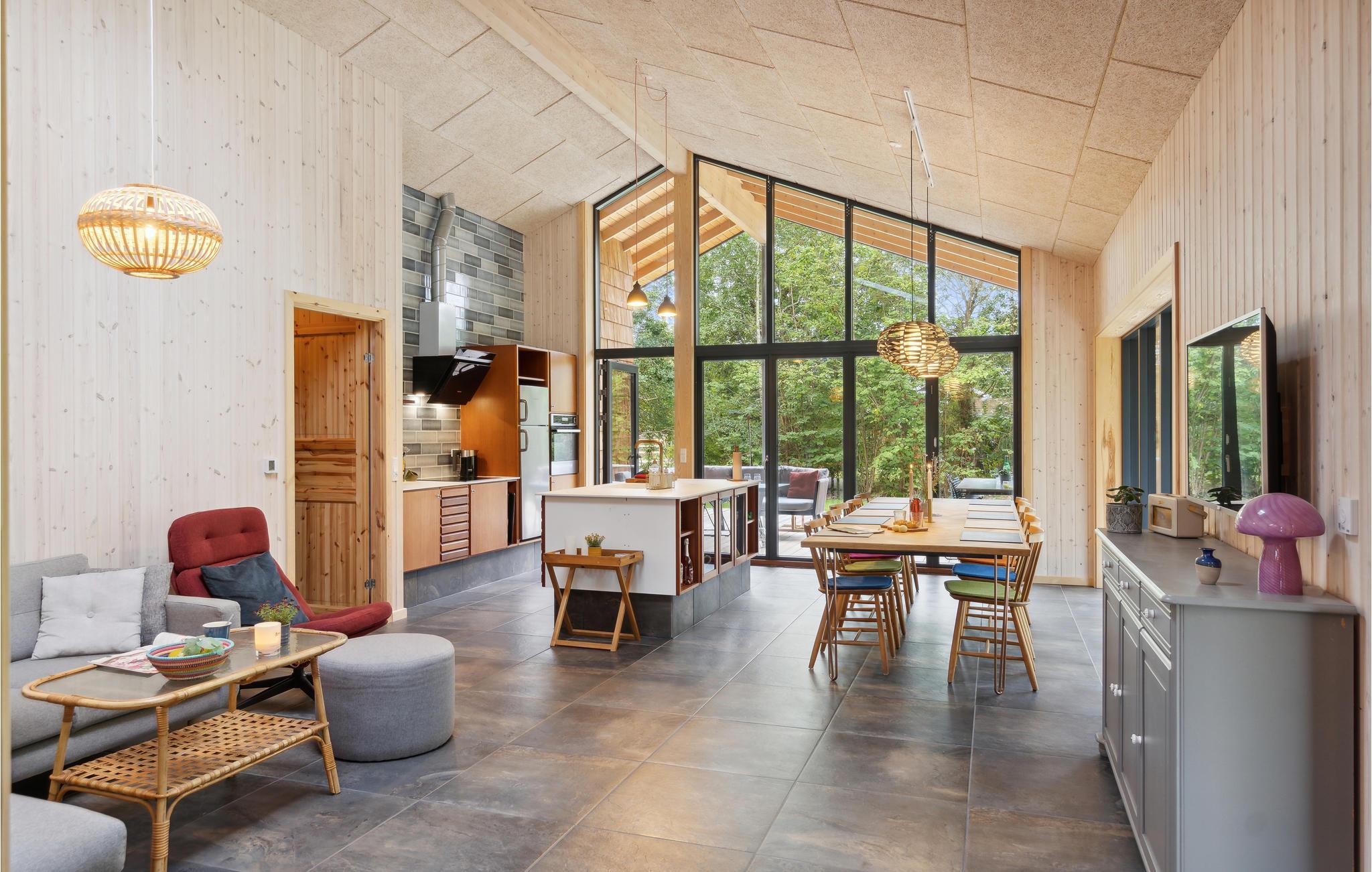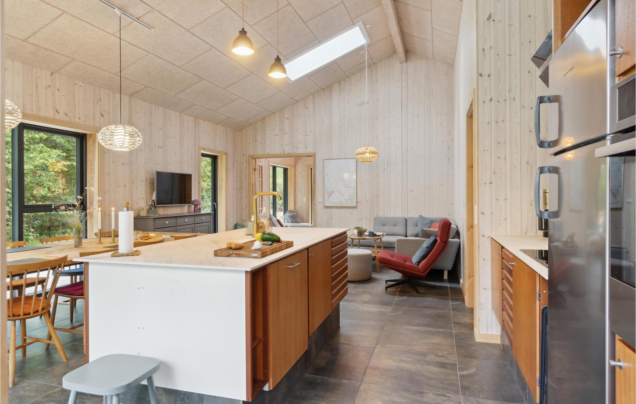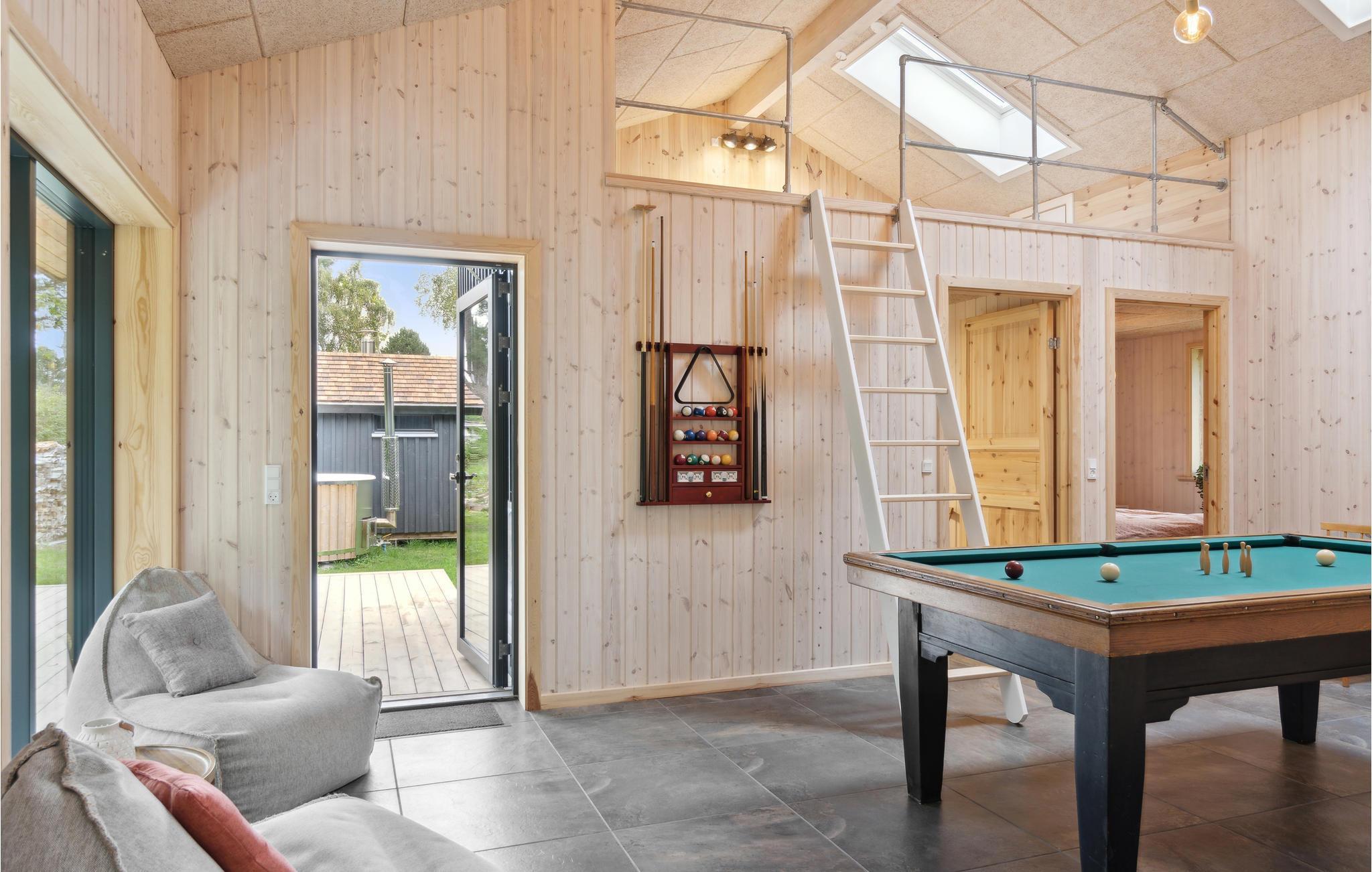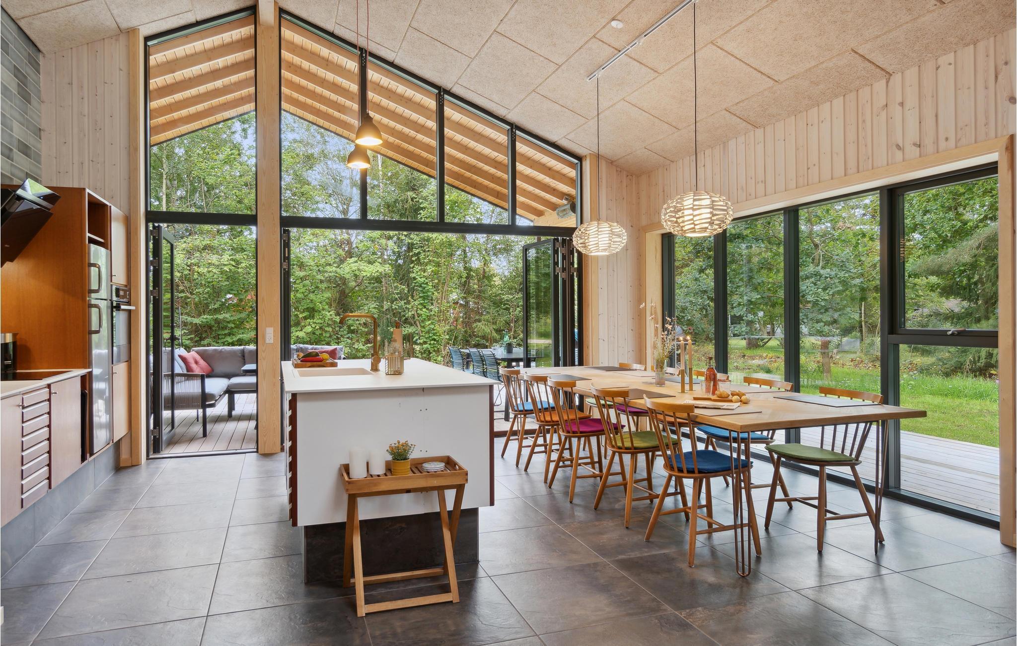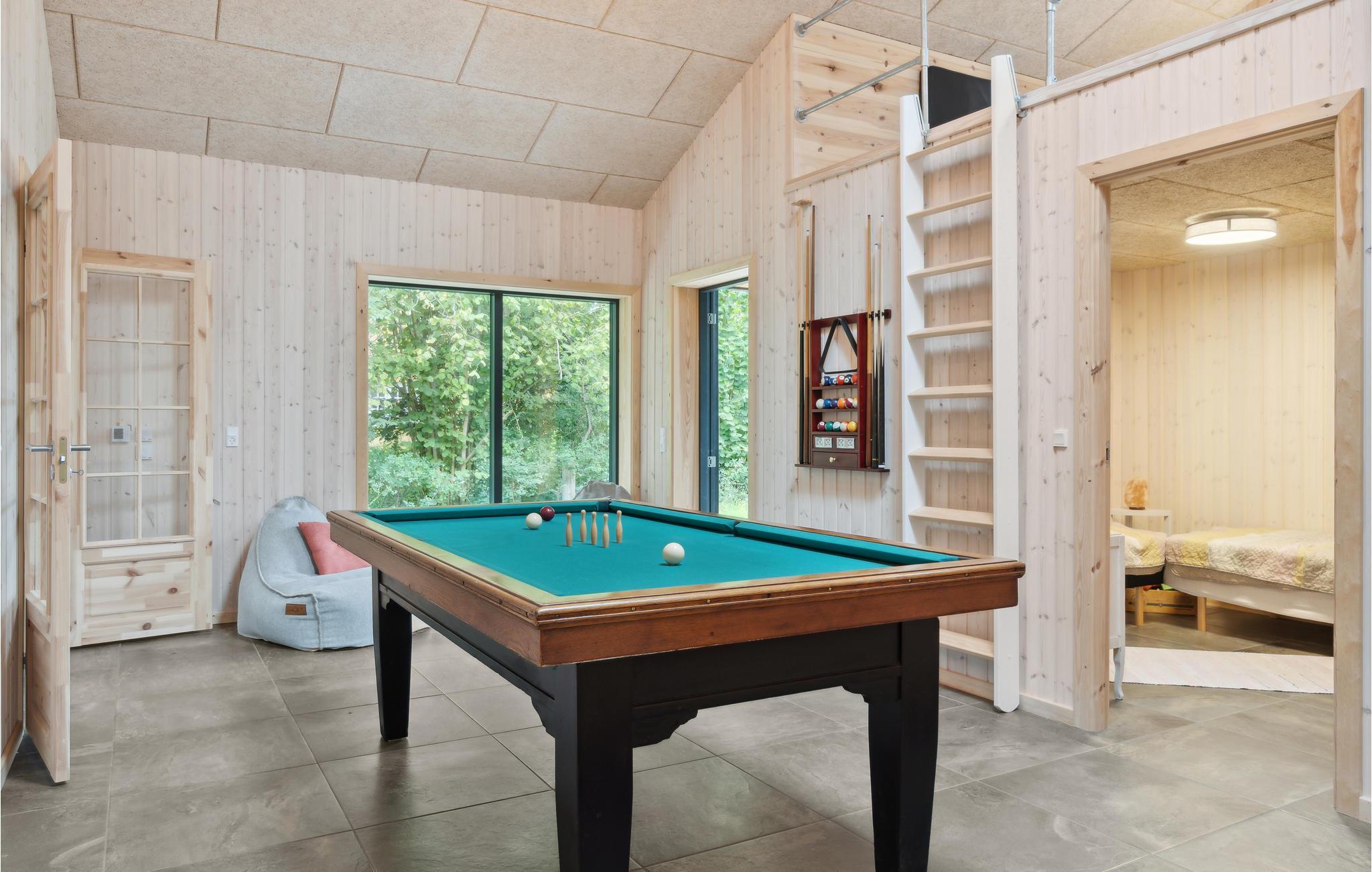 Velkommen til dette smukke feriehus, hvor hele familien kan nyde en fredfyldt og afslappende ferie i naturskønne omgivelser. Så snart I træder ind, vil I blive betaget af de stilfulde værelser. Her går æstetik, funktionalitet og komfort op i en højere enhed, og mixet af design og hygge skaber den perfekte boligoplevelse. Fremtryl lækkerier i køkkenet over et glas vin eller nyd en kop te eller kaffe i sofaen. Senere kan I udfordre hinanden i billard. Ønsker I en stund med mere ro, kan I belønne jer selv med wellness, da et vildmarksbad og en saunahytte venter på jer i haven. Nyd også hyggelige aftener på den store terrasse, som er optimalt forbundet med den store stue gennem det store panoramavindue fra gulv til loft.