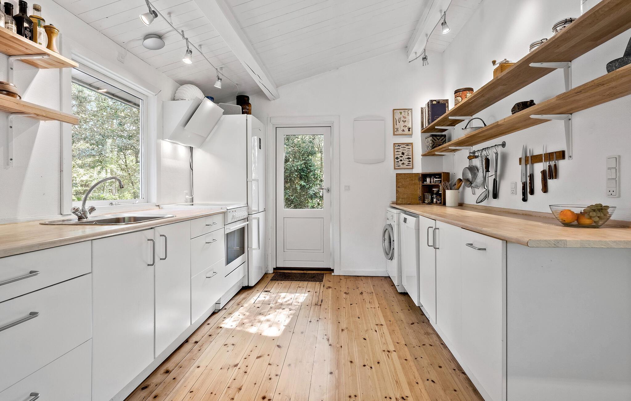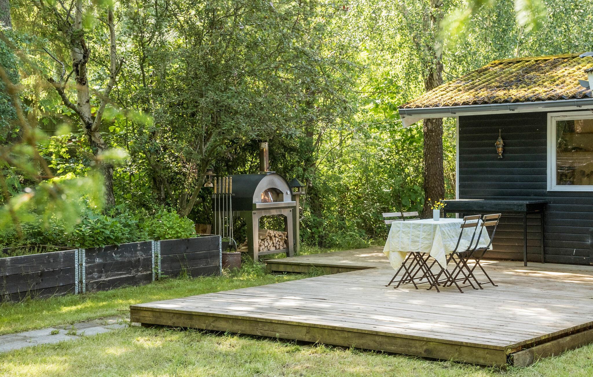 På de varme dage kan I nyde solen lige fra morgenstunden på den store træterrasse og i haven. Kræs om madlavningen i udekøkkenet med pizzaovnen og forskellige typer grill, og lad en smuk sommerdag gå på hæld ved bålpladsen eller i loungeområdet med et godt glas vin.