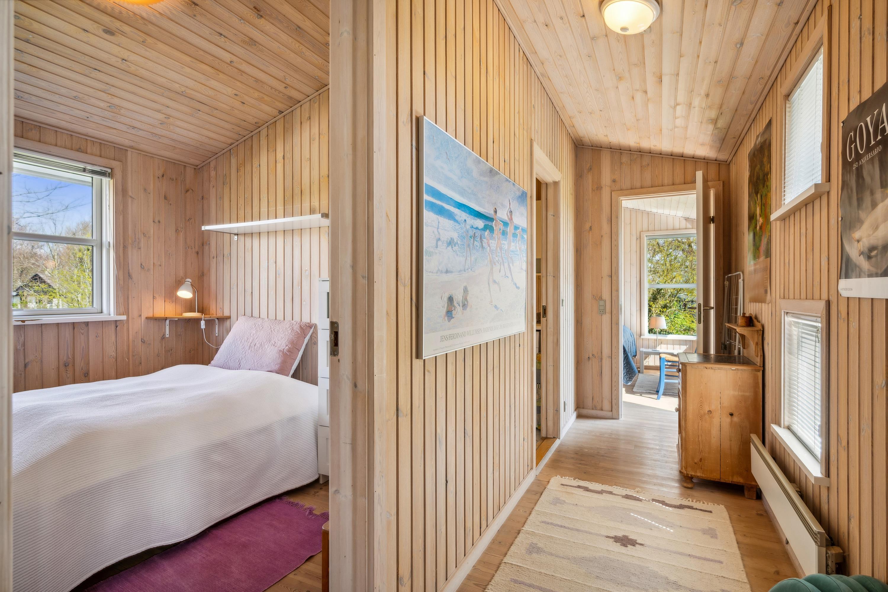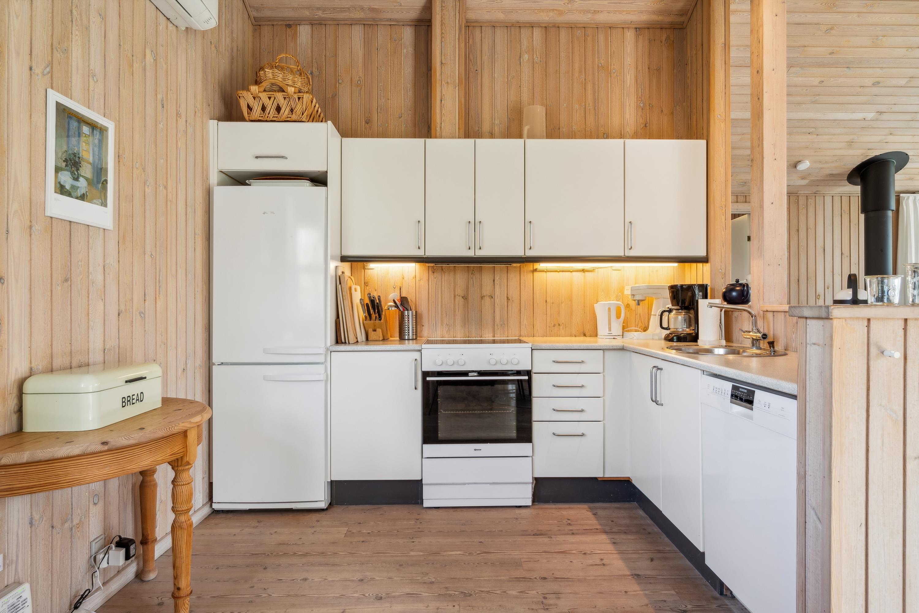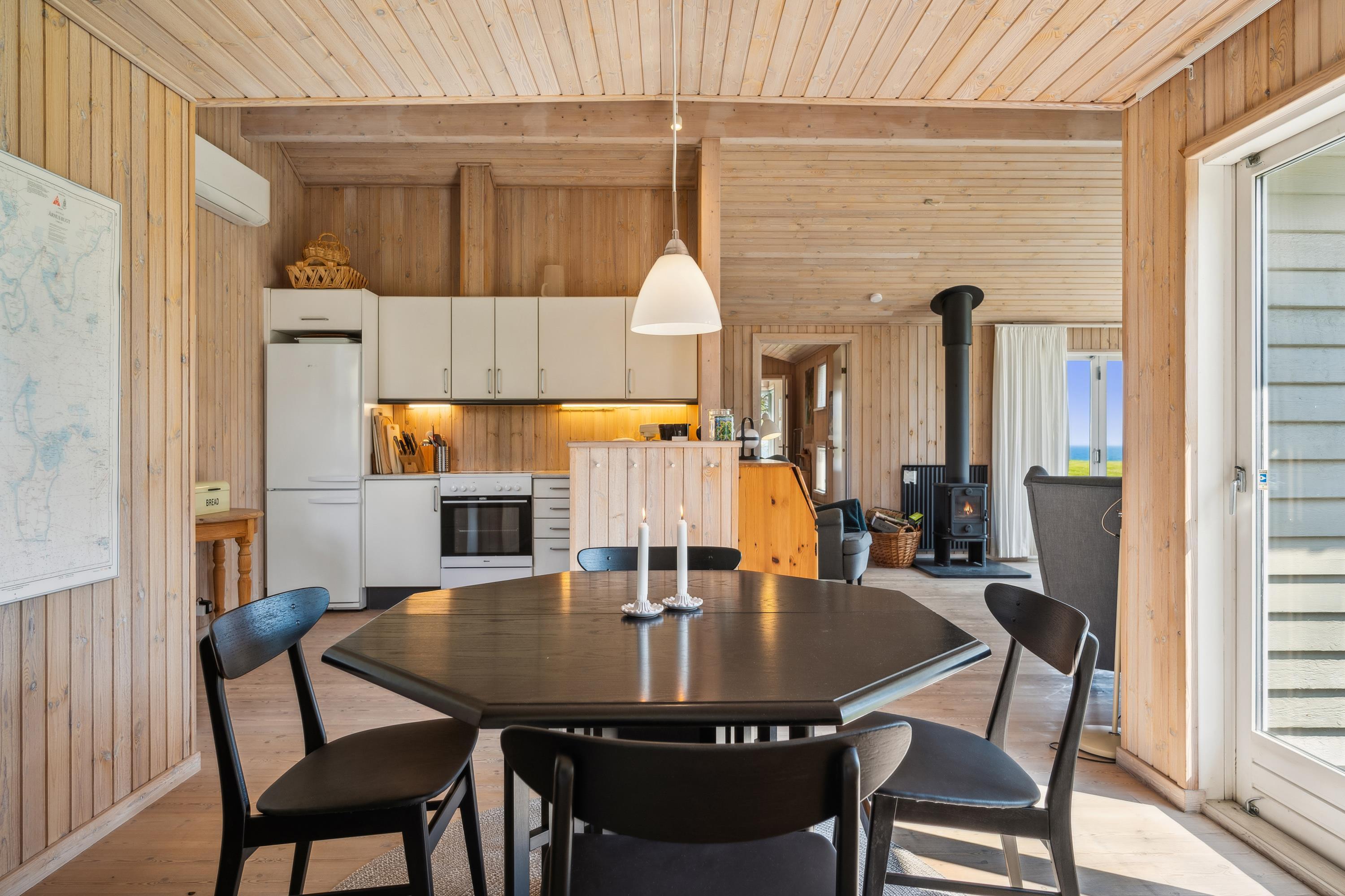 Huset fremstår overalt lyst og venligt med lofter til kip. Stor, dejlig opholdsstue med panoramavinduer og udgang til terrasse, brændeovn og sofaafdeling med TV med danske (inkl. TV2) og tyske kanaler. To separate spiseafdelinger i åben forbindelse med godt, rummeligt køkken med komfur med keramiske kogeplader og ovn, køle-/fryseskab og opvaskemaskine. To dejlige badeværelser med bruseniche, det største desuden med skabsarrangement og vaskemaskine. Husets 8 sovepladser fordeler sig på 3 gode soveværelser: 1 med stor dobbeltseng (180 cm), 1 med dobbeltseng (120 cm) og 1 med dobbeltseng (120 cm) samt god køjeseng. Fra det store soveværelse er der desuden udgang til terrassen. Et skønt sommerhus bare 150 meter fra børnevenlig strand og tæt på mange aktivitetsmuligheder.