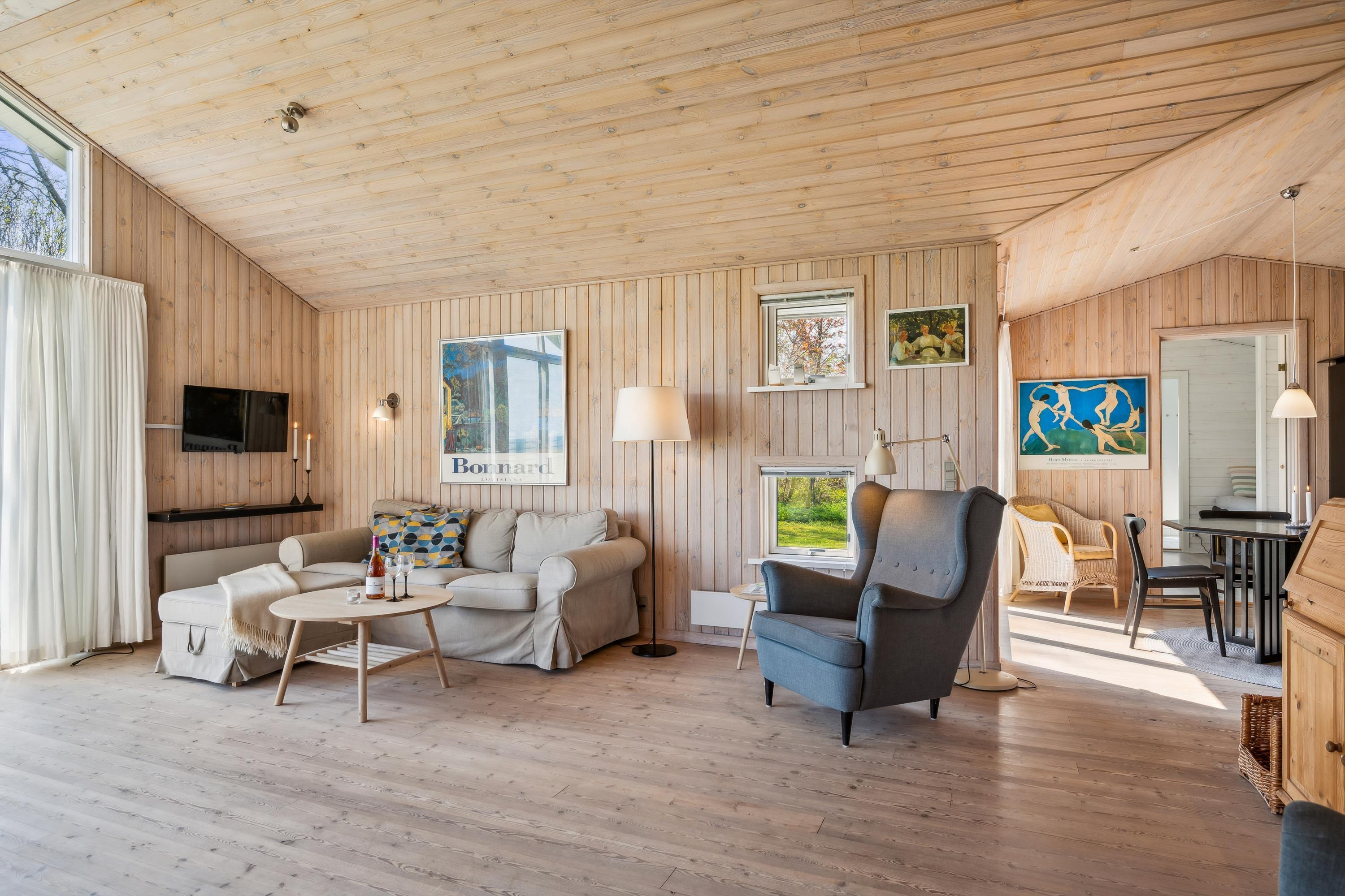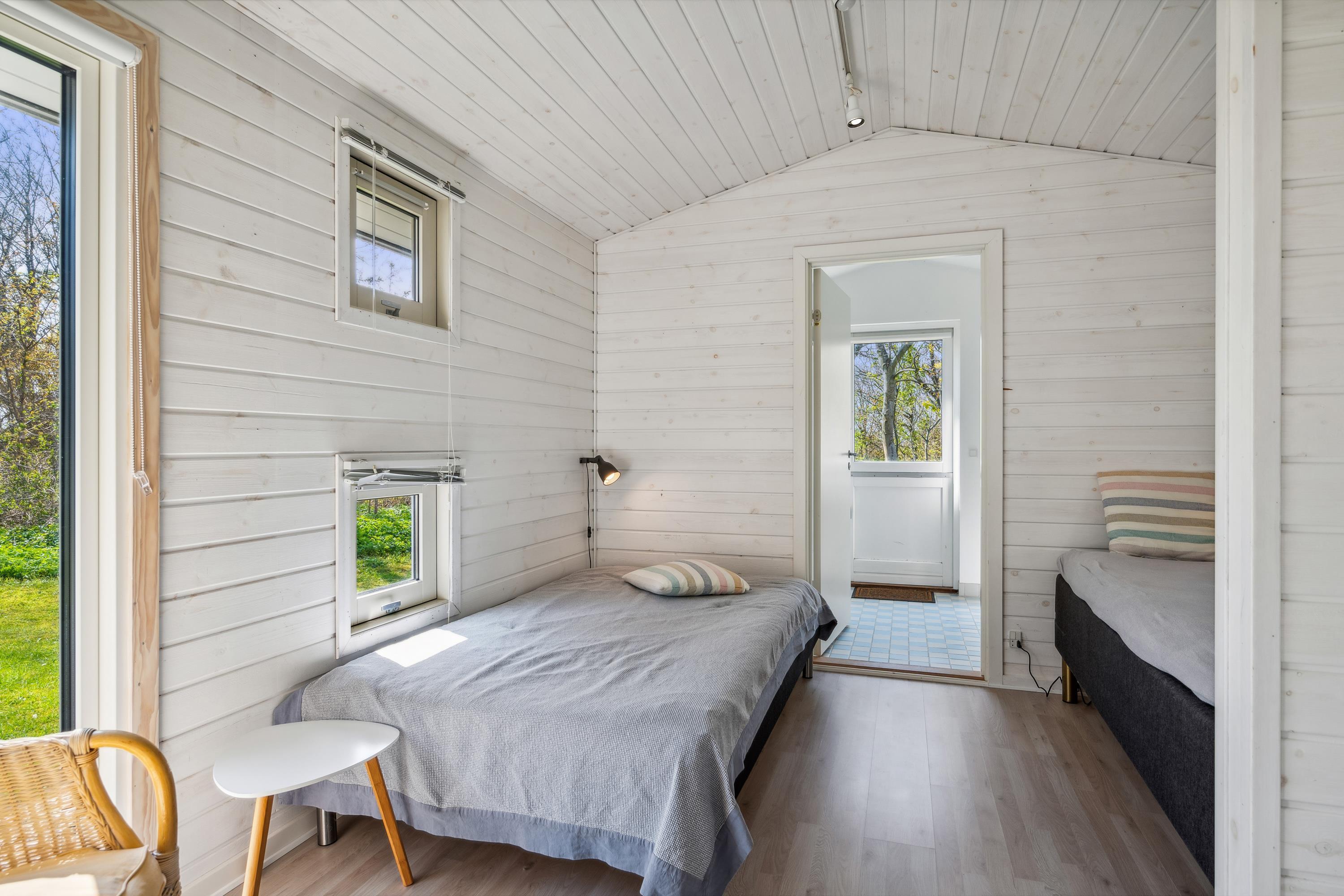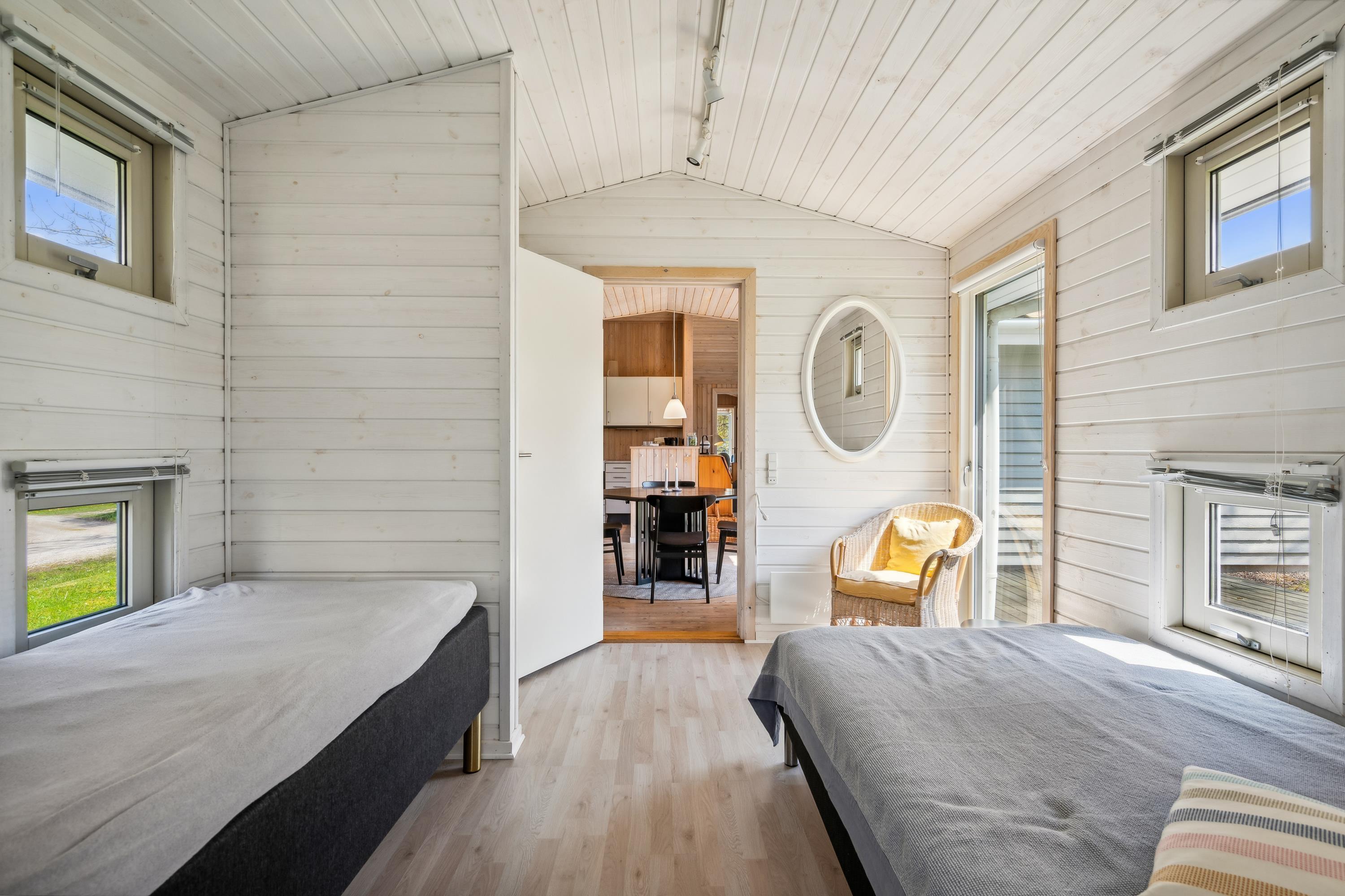 Huset fremstår overalt lyst og venligt med lofter til kip. Stor, dejlig opholdsstue med panoramavinduer og udgang til terrasse, brændeovn og sofaafdeling med TV med danske (inkl. TV2) og tyske kanaler. To separate spiseafdelinger i åben forbindelse med godt, rummeligt køkken med komfur med keramiske kogeplader og ovn, køle-/fryseskab og opvaskemaskine. To dejlige badeværelser med bruseniche, det største desuden med skabsarrangement og vaskemaskine. Husets 8 sovepladser fordeler sig på 3 gode soveværelser: 1 med stor dobbeltseng (180 cm), 1 med dobbeltseng (120 cm) og 1 med dobbeltseng (120 cm) samt god køjeseng. Fra det store soveværelse er der desuden udgang til terrassen. Et skønt sommerhus bare 150 meter fra børnevenlig strand og tæt på mange aktivitetsmuligheder.