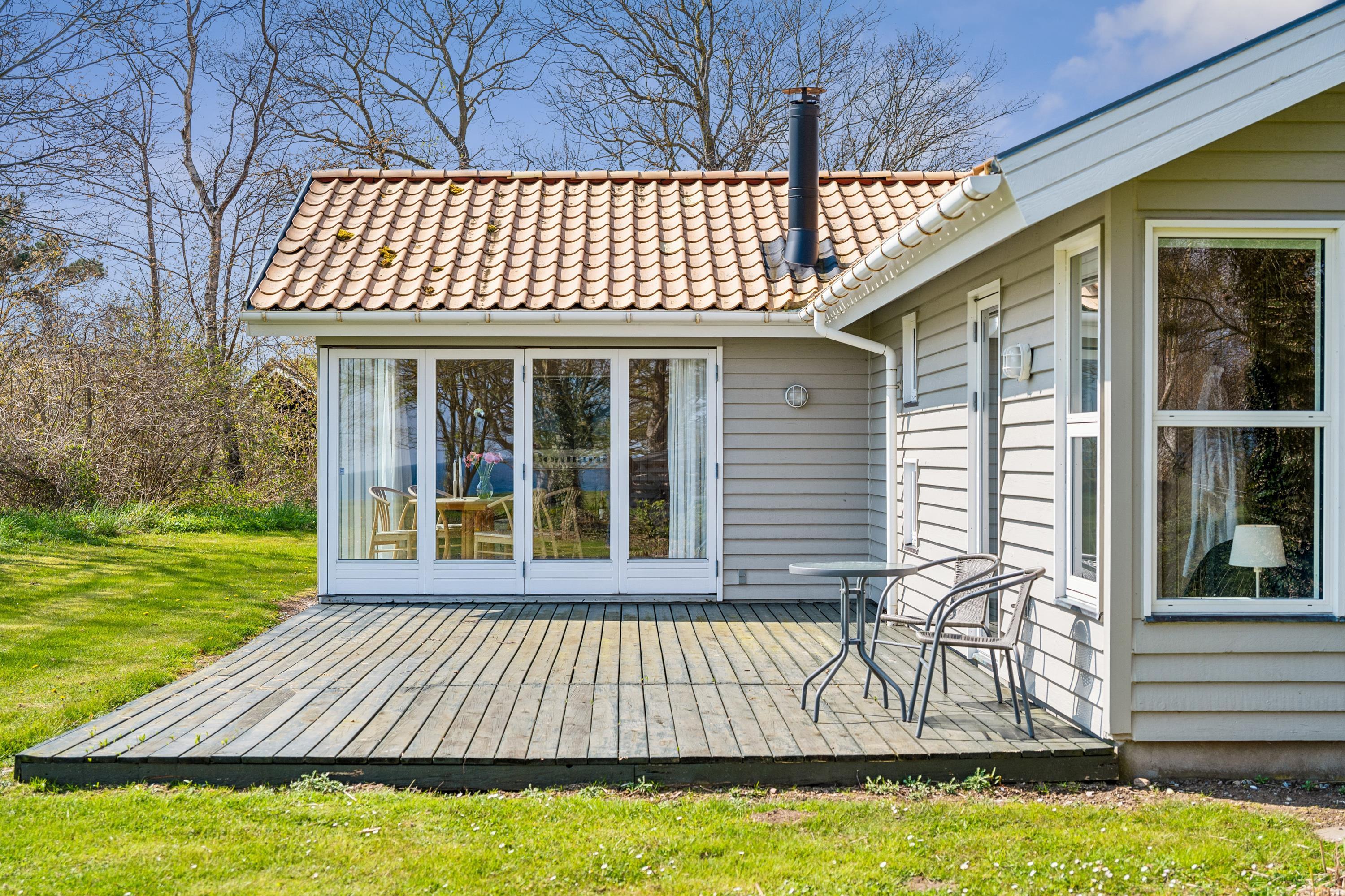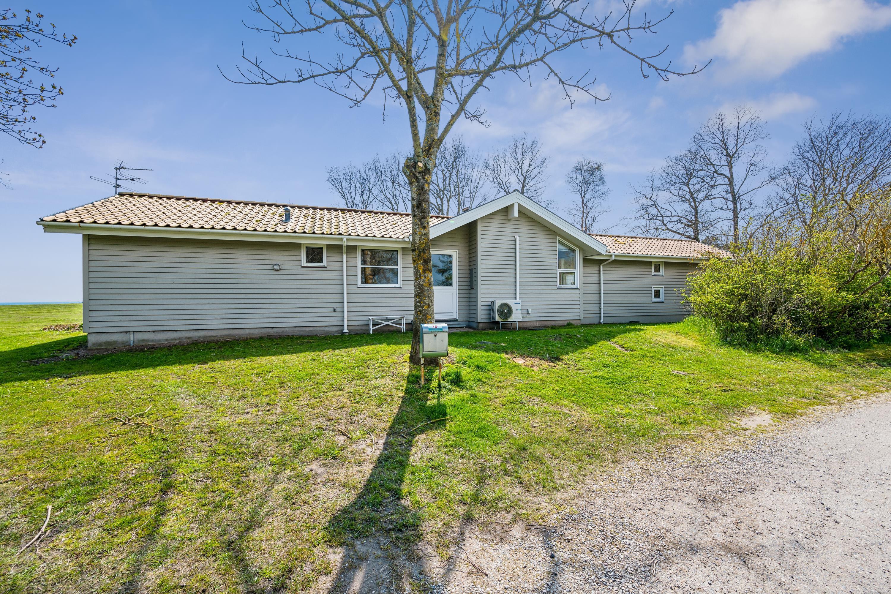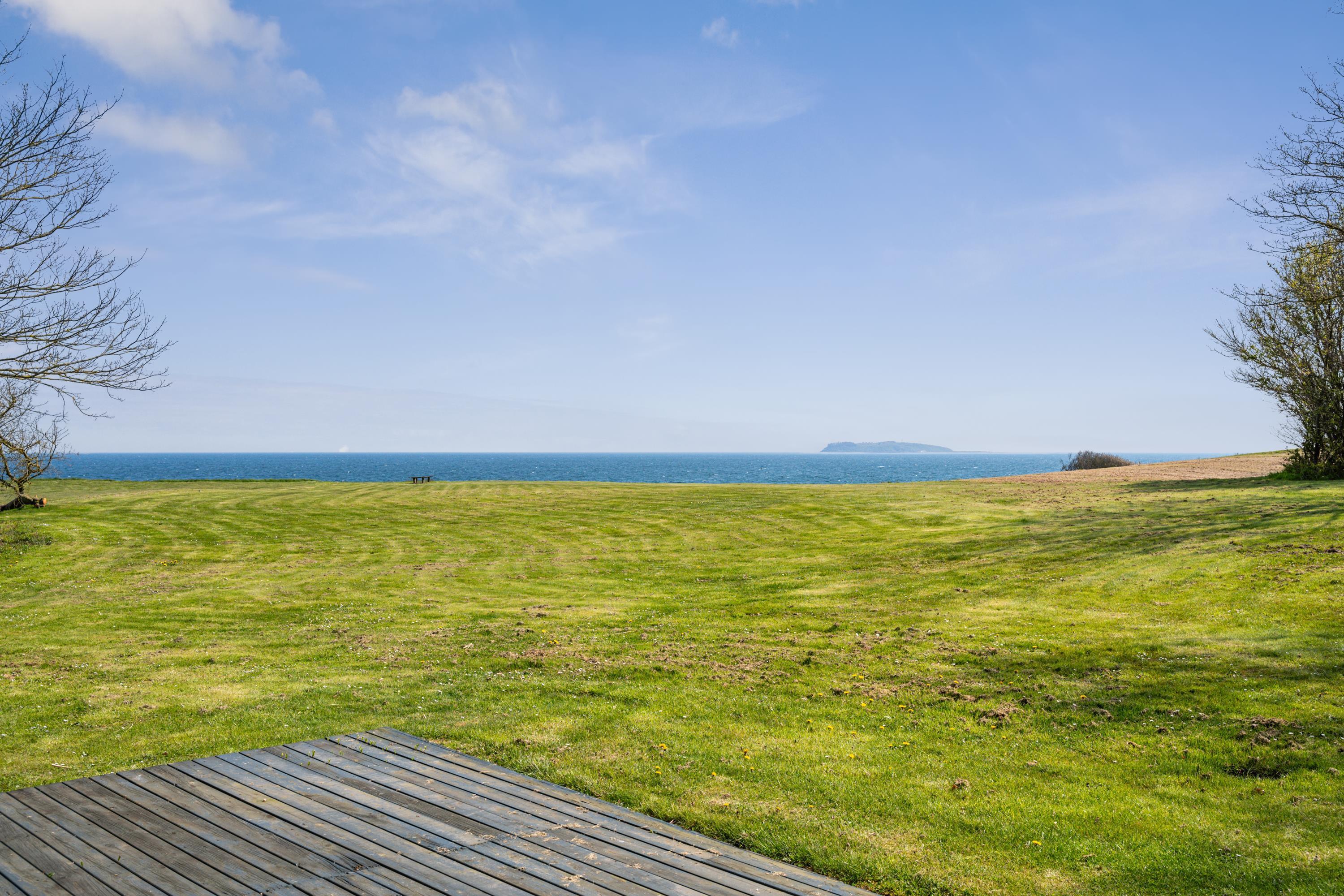 Skønt og velindrettet feriehus beliggende på meget stor, ugenert naturgrund med fantastisk panoramaudsigt over Kattegat og til Hjelm. To gode træterrasser mod hhv. øst og vest med havemøbler, liggestole, parasol og grill, hvor man kan nyde både solen og den usædvanlig smukke udsigt. Et godt hus til den store eller to familier.
