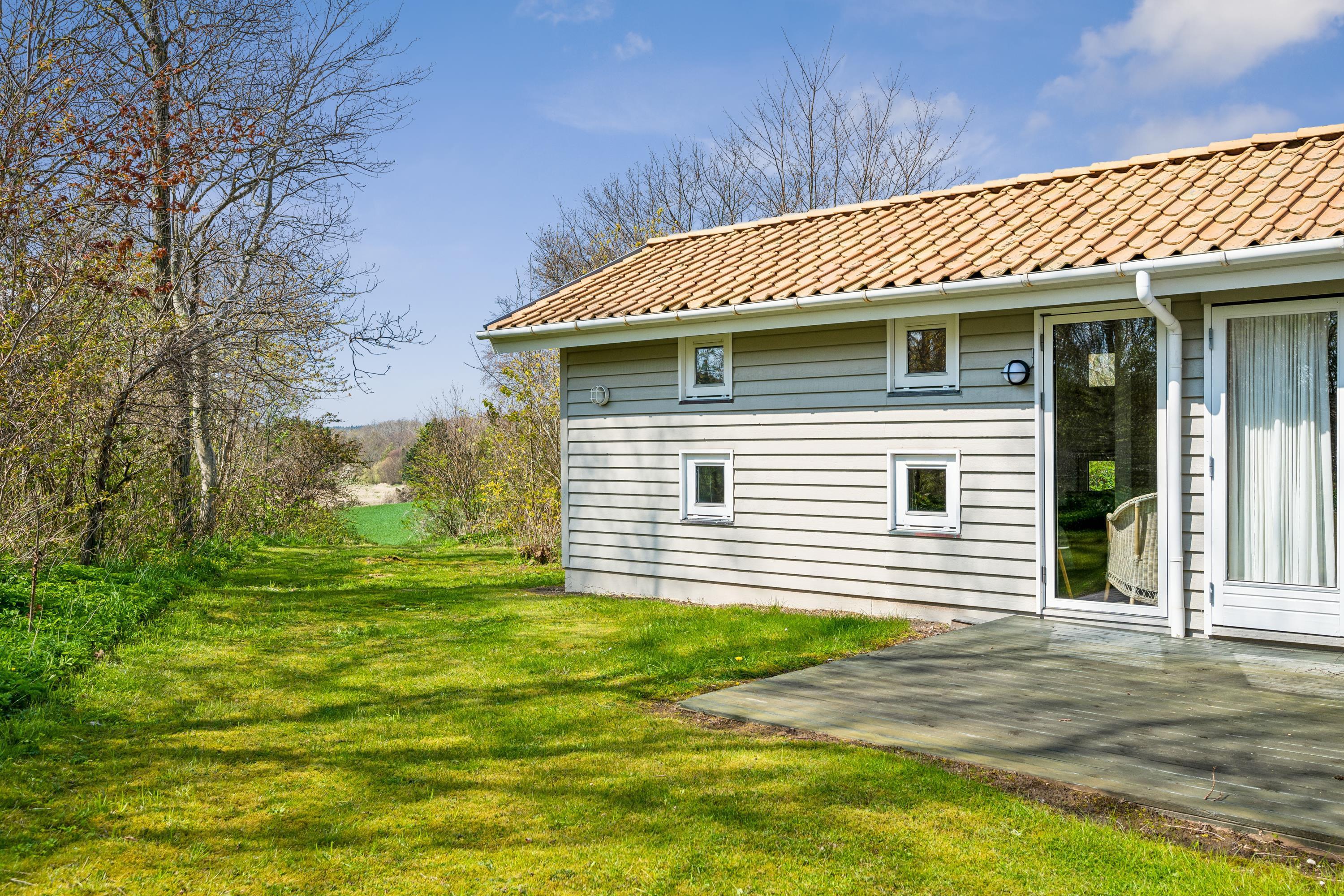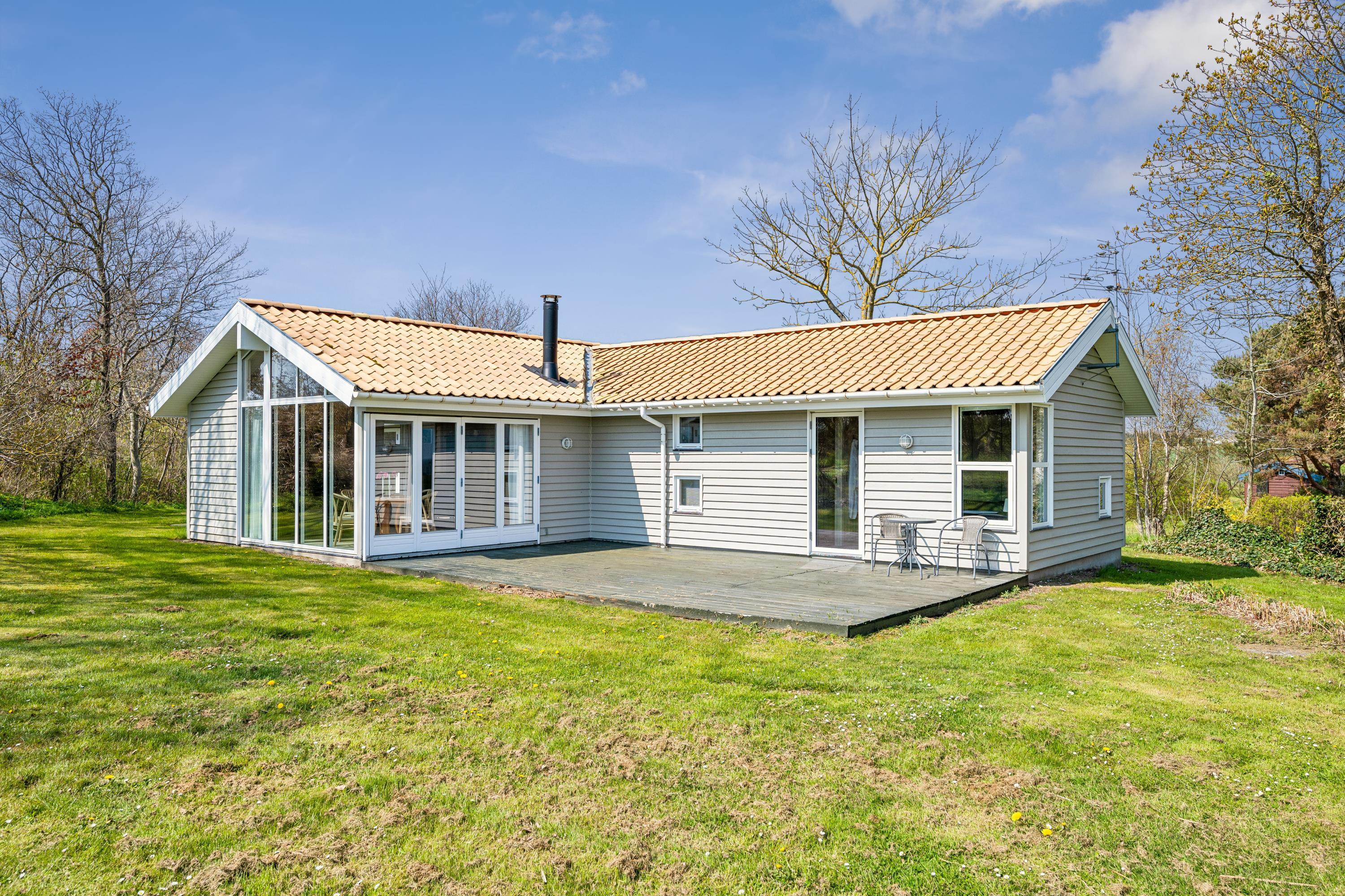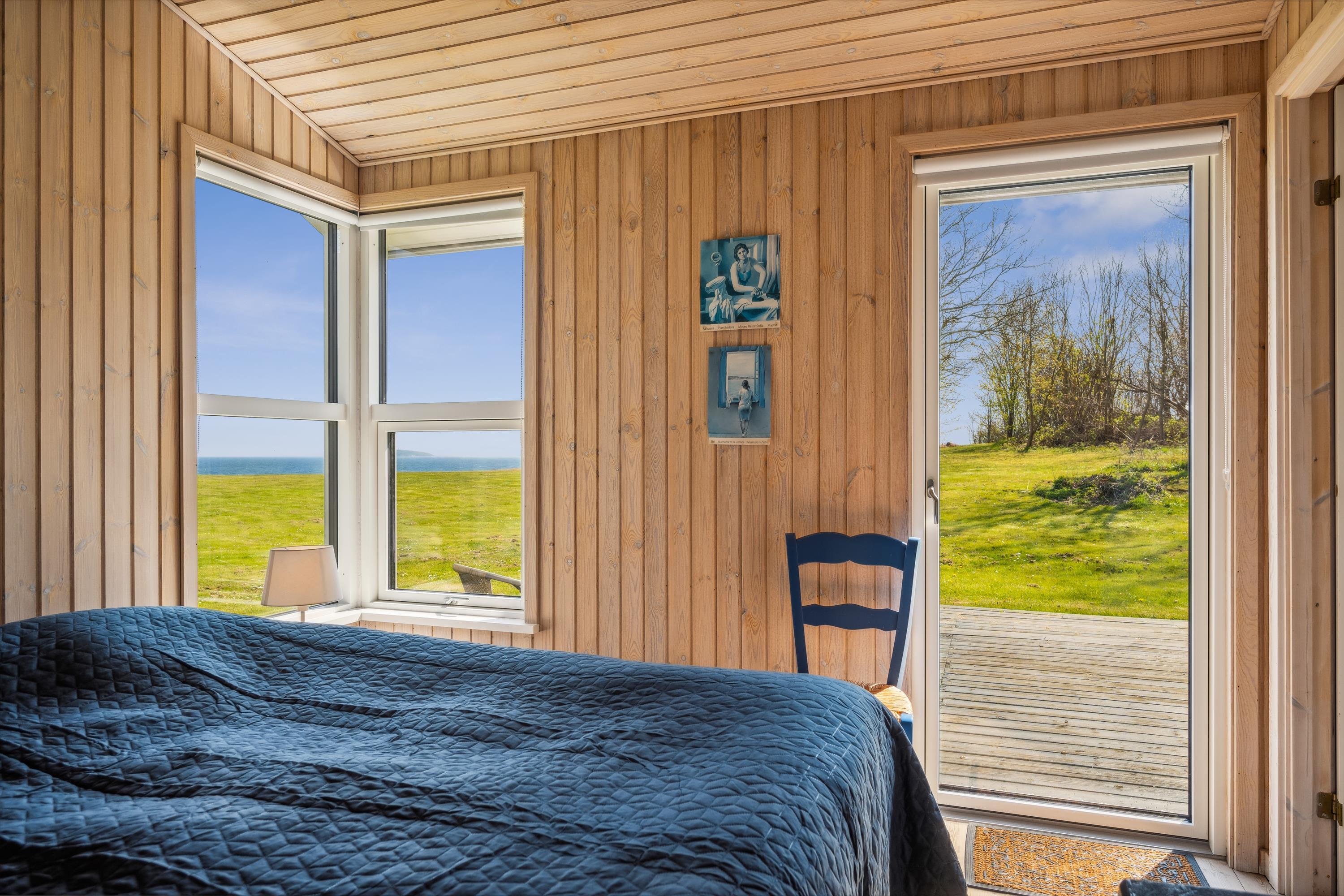 Skønt og velindrettet feriehus beliggende på meget stor, ugenert naturgrund med fantastisk panoramaudsigt over Kattegat og til Hjelm. To gode træterrasser mod hhv. øst og vest med havemøbler, liggestole, parasol og grill, hvor man kan nyde både solen og den usædvanlig smukke udsigt. Et godt hus til den store eller to familier.