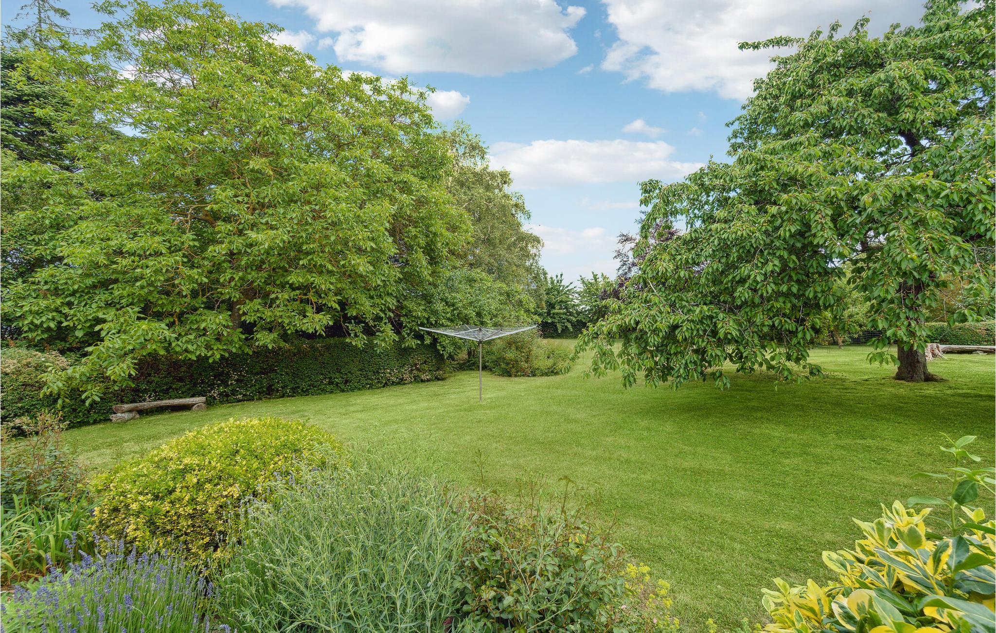 Gennem de store vinduespartier har I en vidunderlig udsigt over haven. Spis sammen i udestuen eller på terrassen, hvor I både finder solrige og skyggefulde steder. En sandkasse er til rådighed for de mindste.