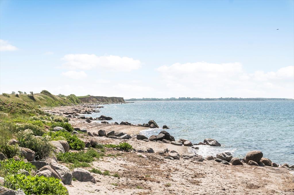 Indendørs: Stueplan: Indgangsparti med adgang til rummelig komb opholds-spisestue. Åbent køkken med køleskab, fryser, komfur/ovn, opvaskemaskine. 1 soveværelse med dobbeltseng. Stort og ny-indrettet badeværelse med bruseniche, badekar, håndvask / stort skabs arrangement, toilet. Vaskemaskine 1. sal: Fra stueetagen fører en trappe op til 1. sal som består af stor lys opholdsstue med flot udsigt til både fjorden og Smålandshavet. 1 stort soveværelse med dobbeltseng . Endvidere mulighed for 2 opredninger bagest i stuen.