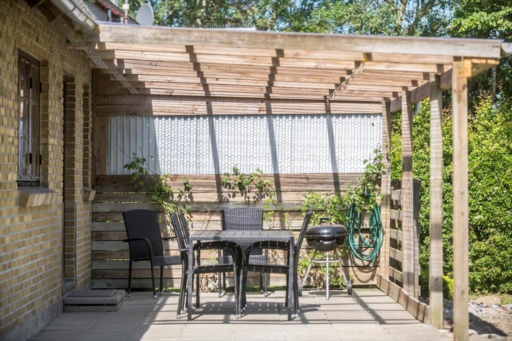 Udendørs: Huset er beliggende på 2.300 m2 stor naturgrund, Mod fjorden forefindes en stor - delvis - overdækket terrasse.