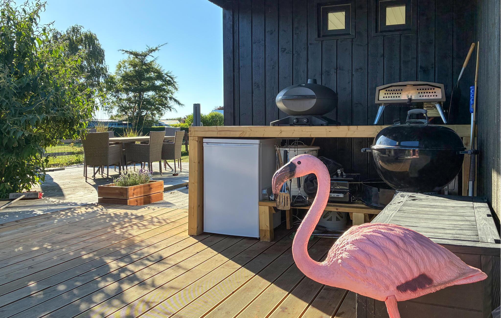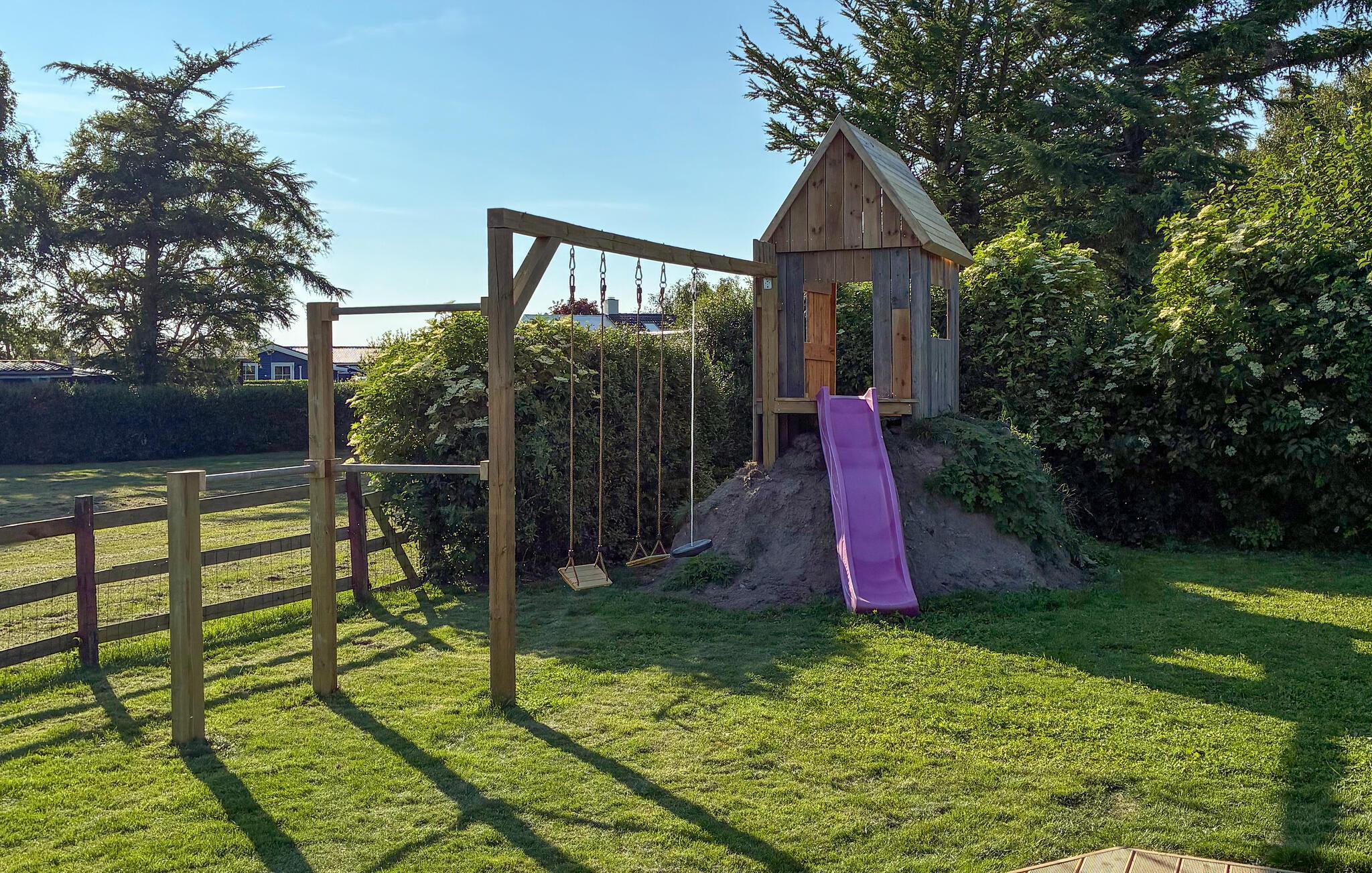 Træd ud på den store træterrasse. Læn jer tilbage i det udendørs spabad eller sæt jer godt til rette i hængestolen. Børnene kan se frem til gynger, rutsjebane og sandkasse. Den store græsplæne giver plads til leg og boltre sig. Om aftenen samles hele familien omkring bålstedet for at bage snobrød og nyde gode samtaler under aftenhimlen.