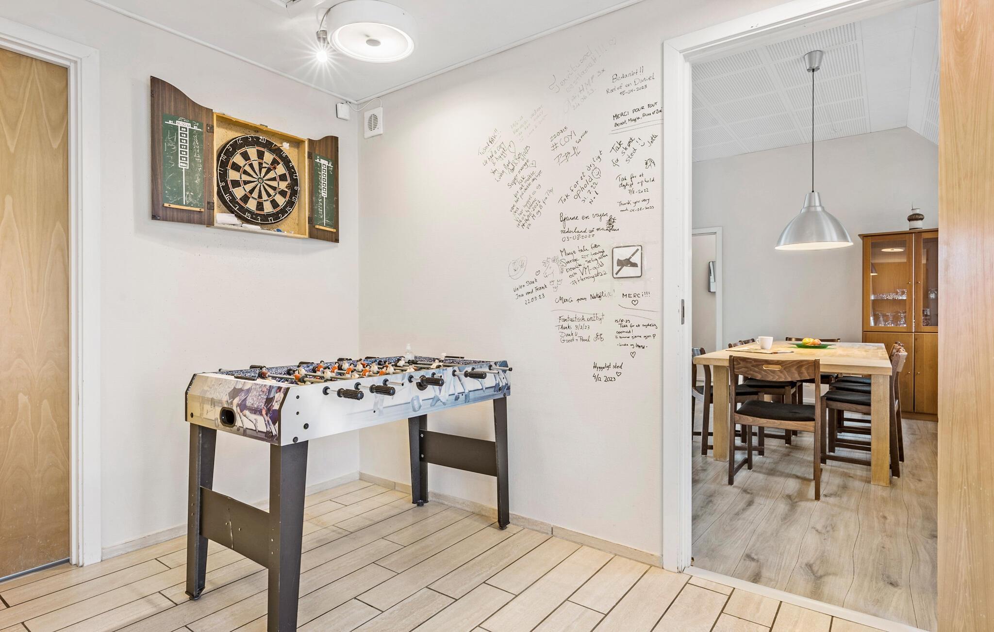 Hvis I er på udkig efter en skøn base for årets ferie med den udvidede familie, er dette rummelige hus ved Engesvang det helt perfekte valg. Her får I, ude som inde, alt det I behøver til et ophold, hvor ingen kommer til at kede sig. Indretningen fremtræder varmt og indbydende med store fællesrum og gode møbler. Efter aftensmaden kan I tage et slag dart eller pool, inden I runder aftenen af med brætspil eller en god film i den rummelige sofa.