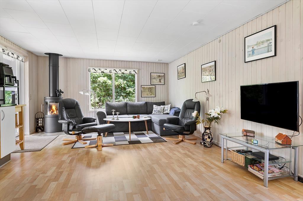 Når I træder indenfor i sommerhuset, er det første, I bemærker, den rare og lyse stemning, der breder sig i alle rum. Indretningen er enkel og hyggelig, og det åbne opholdsrum danner et naturligt samlingspunkt for feriens rolige stunder. Tænd op i brændeovnen og mærk varmen brede sig, mens regnen trommer let på ruden og duften af nybrygget kaffe sniger sig ud fra køkkenet. Der er god plads til at være sammen – og samtidig mulighed for at trække sig tilbage med en bog eller en middagslur, når behovet for ro melder sig. Som en ekstra fleksibel soveplads er der en sovesofa i stuen, som kan benyttes efter behov. De praktiske detaljer og den hjemlige atmosfære gør det nemt at føle sig godt tilpas, og sommerhuset rummer alt det, I har brug for til en afslappet ferie – uanset om I er to, tre eller fire på tur.