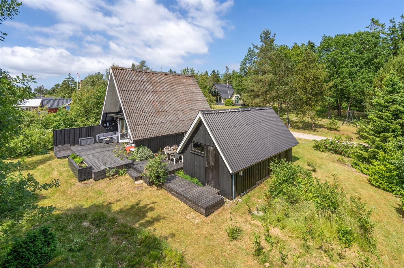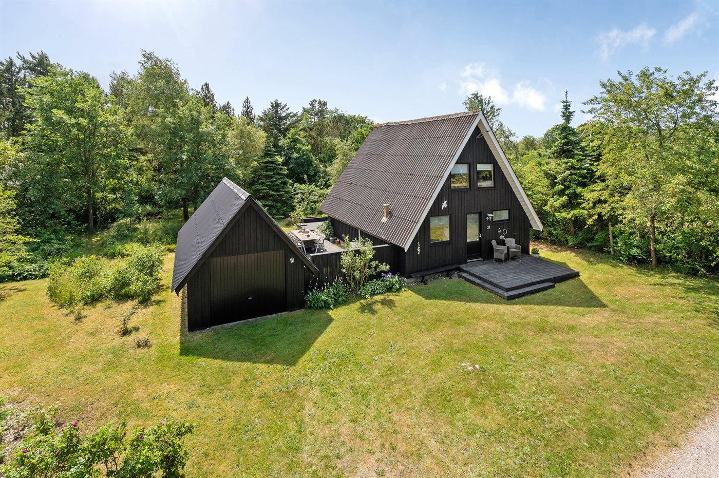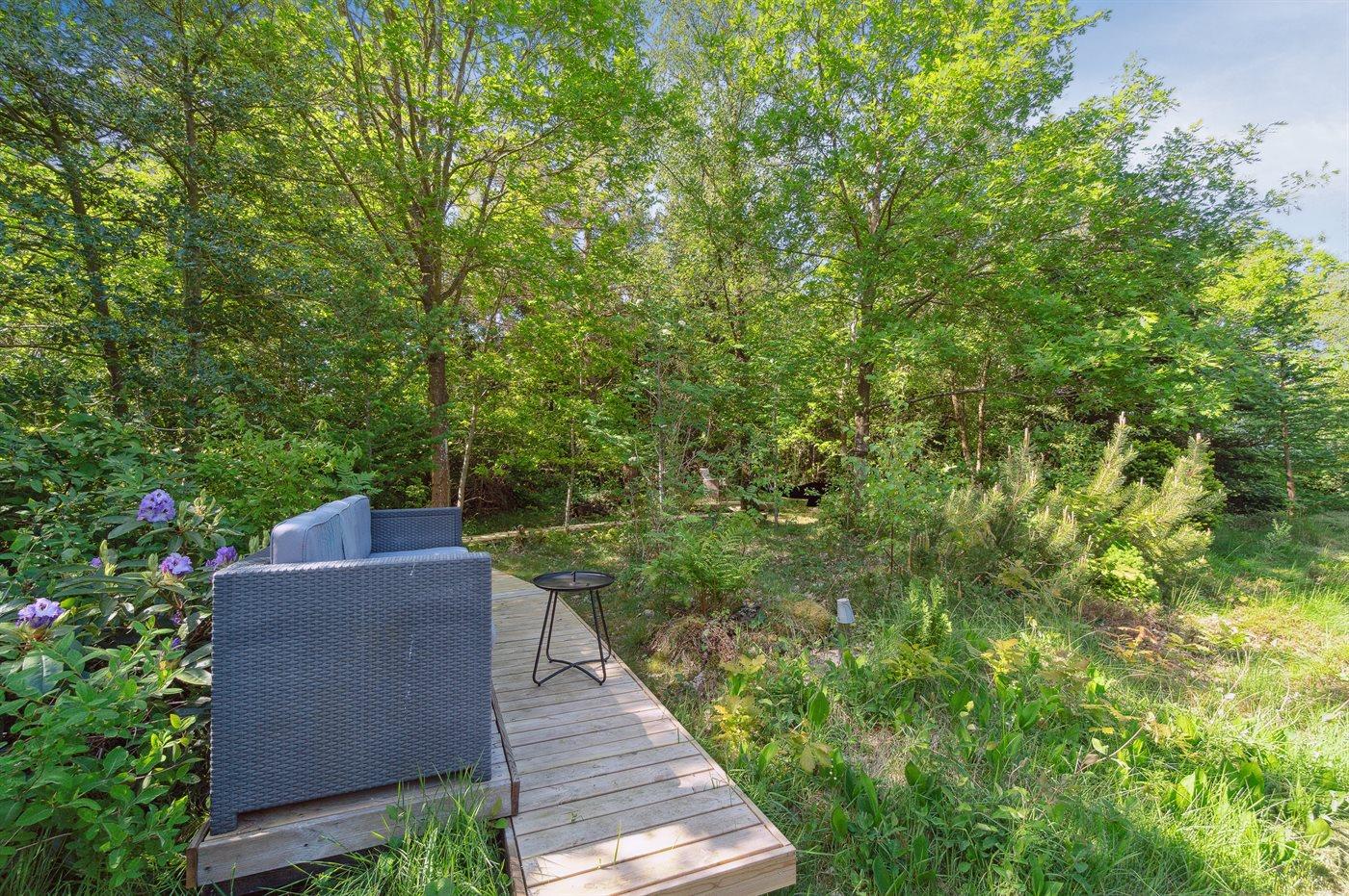 Ferieboligen er beliggende på en 1227 m² stor grund i skov/plantage med en privat have, hvor der er plads til afslapning/aktiviteter, og hvor man kan finde sol eller skygge efter behov. Der er grill, haveudstyr osv. til rådighed og der er parkering ved ferieboligen.