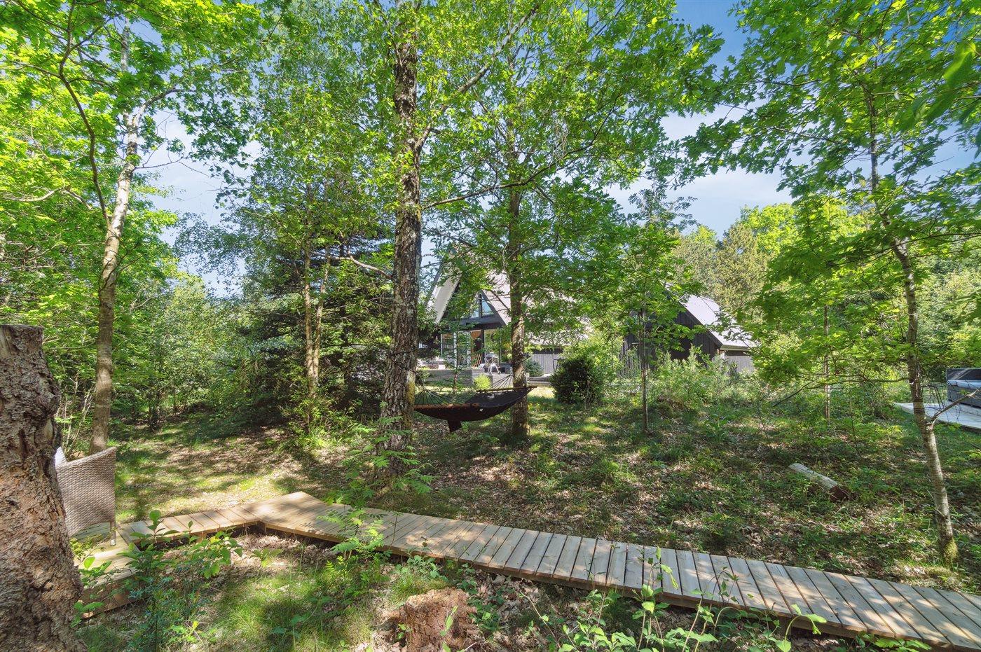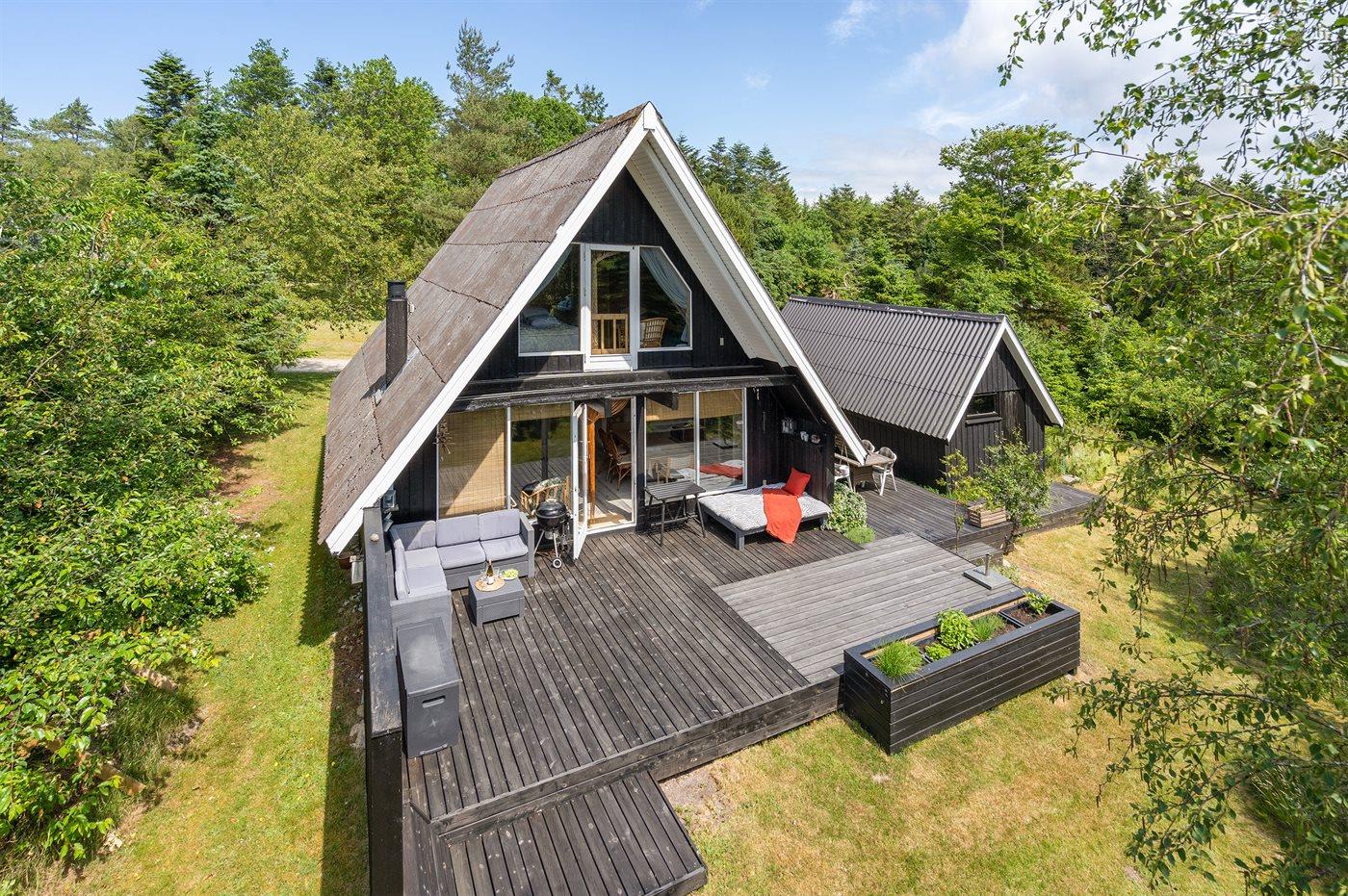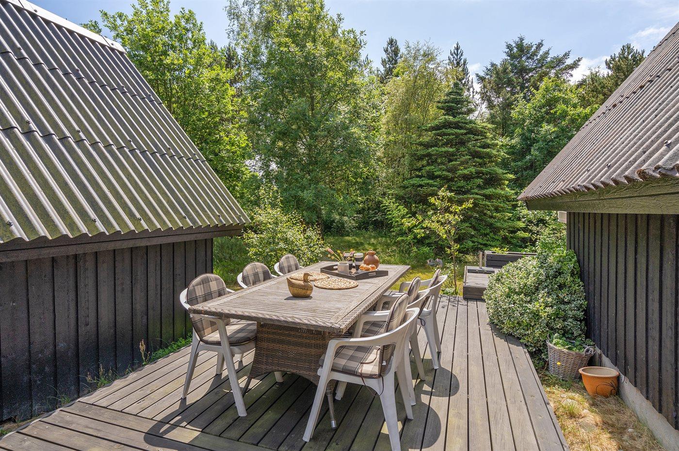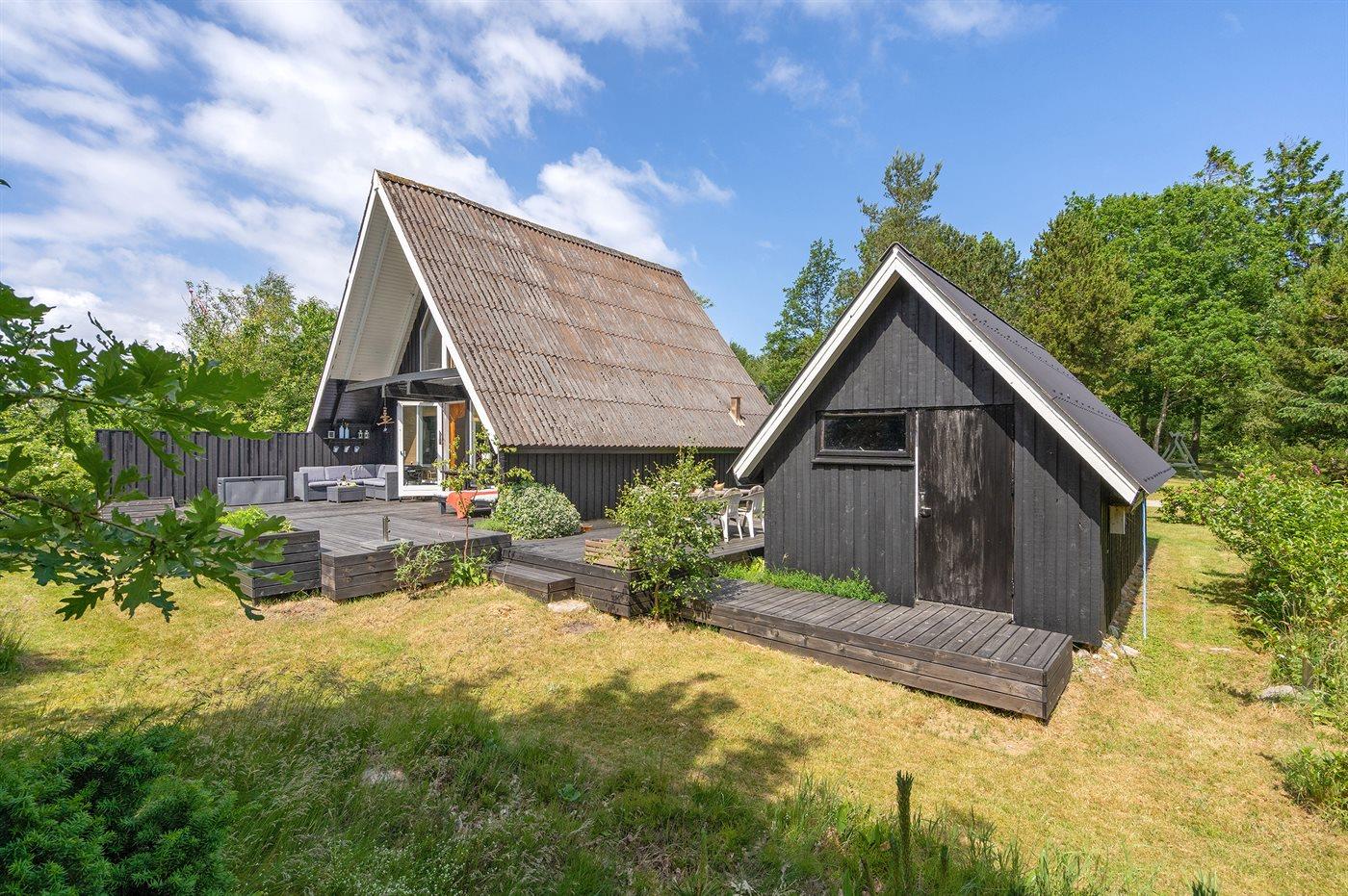 Ferieboligen er beliggende på en 1227 m² stor grund i skov/plantage med en privat have, hvor der er plads til afslapning/aktiviteter, og hvor man kan finde sol eller skygge efter behov. Der er grill, haveudstyr osv. til rådighed og der er parkering ved ferieboligen.