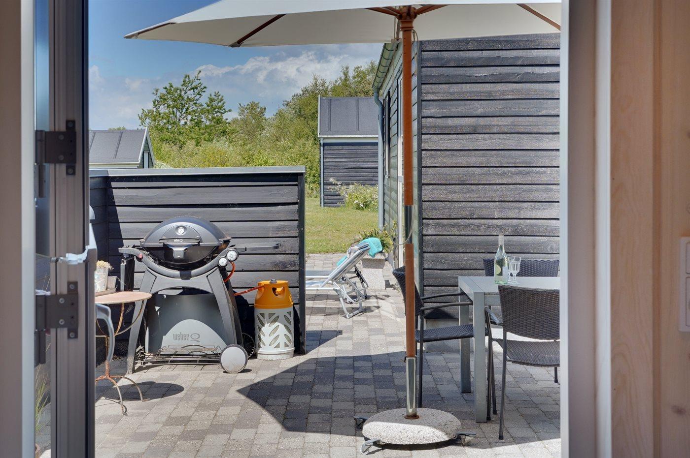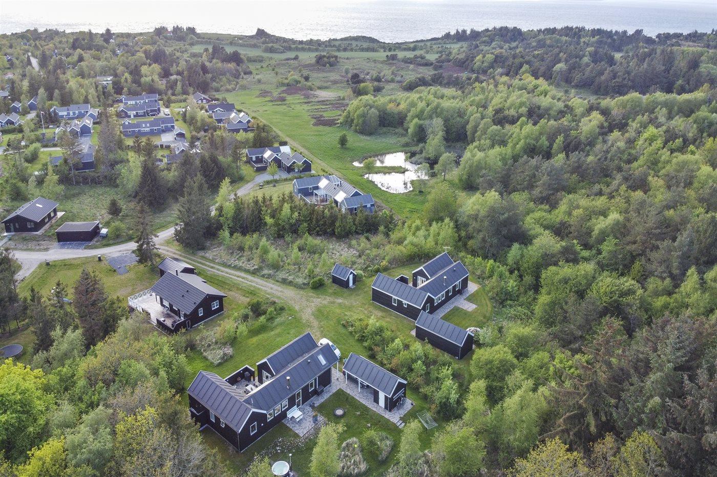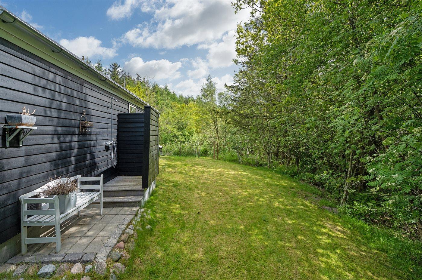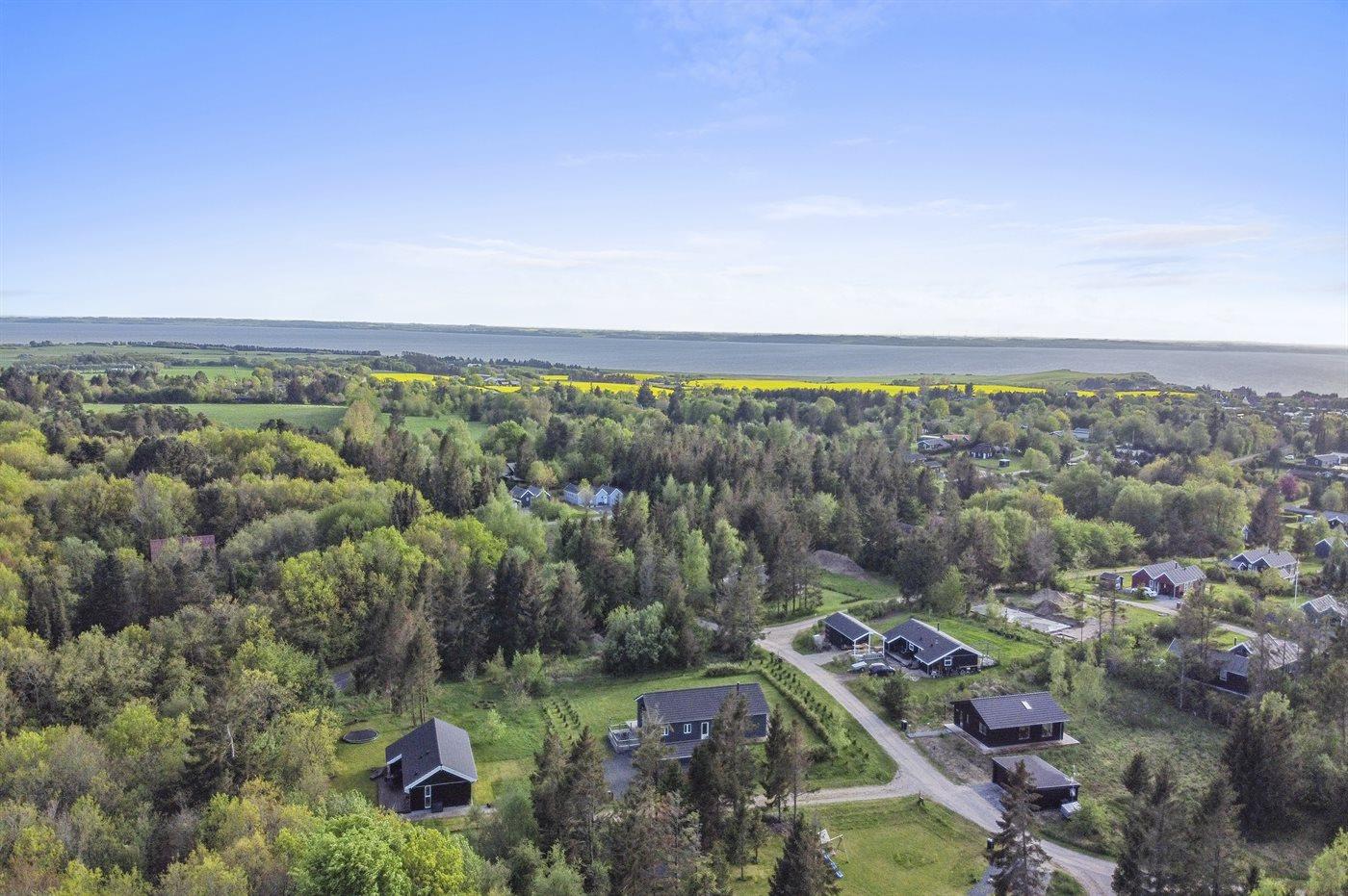 Ferieboligen er beliggende på en 1800 m² stor naturgrund. Der er 600 m til fjorden. Nærmeste forretning er beliggende i en afstand af 10000 m. Der er en golfbane i en afstand af 18000 m. Til ferieboligen hører 30 m² terrasseareal. Ligeledes er der adgang til udestue. Sandkasse. Der ligger en legeplads i en afstand af 300 m. Gasgrill til rådighed. Der er carport til rådighed. Der er installeret stik til opladning af elbil. Type 2 stik. Med 11 kW ladeeffekt. Parkering ved ferieboligen.